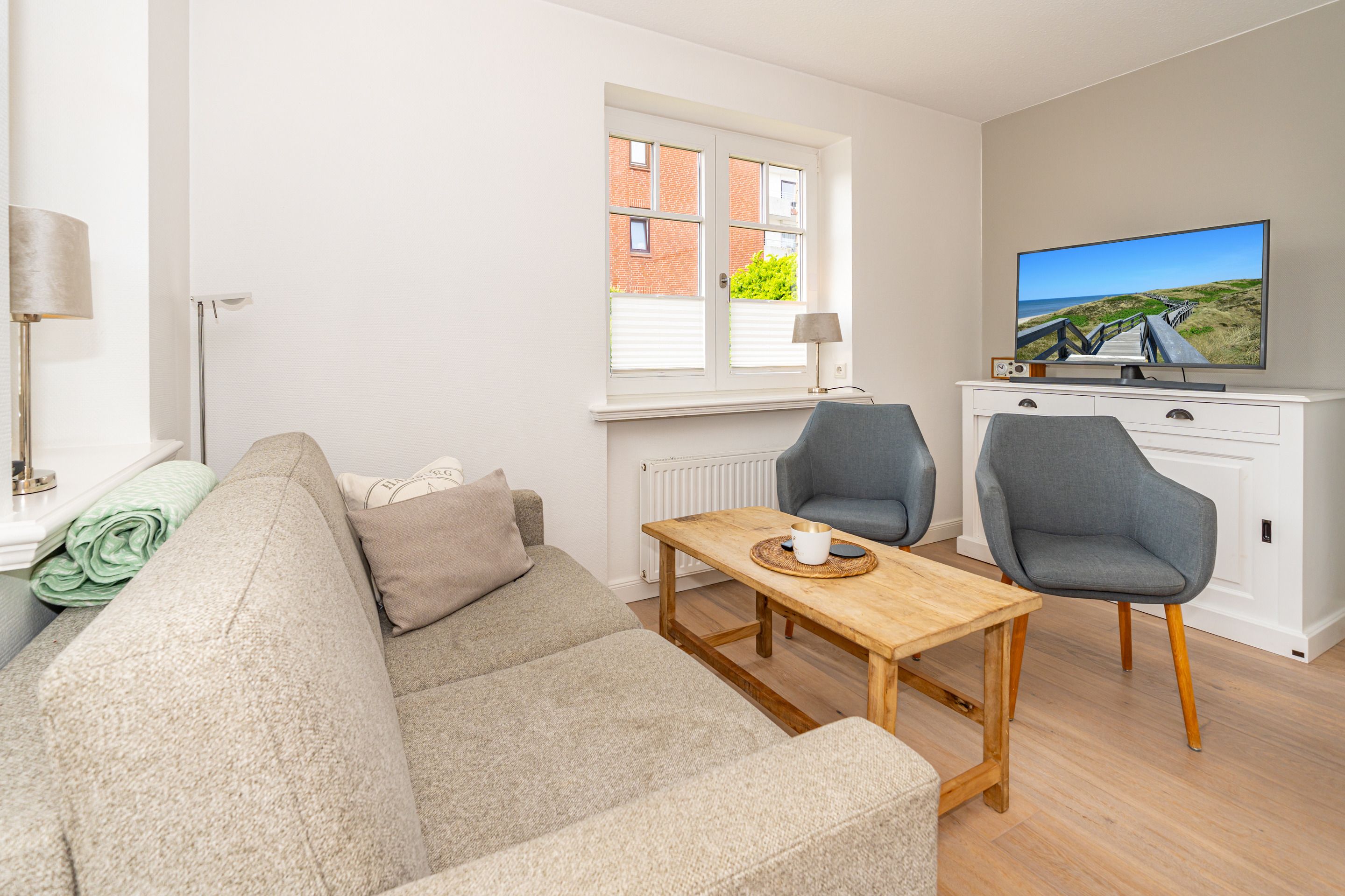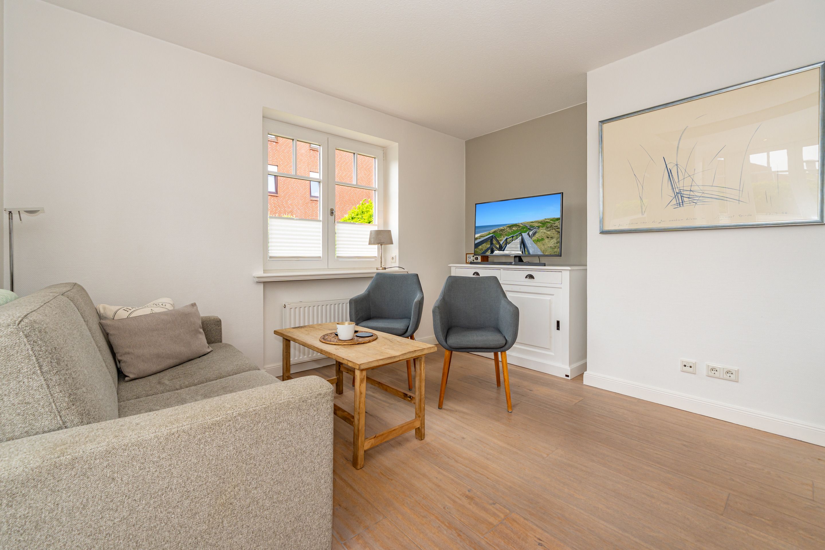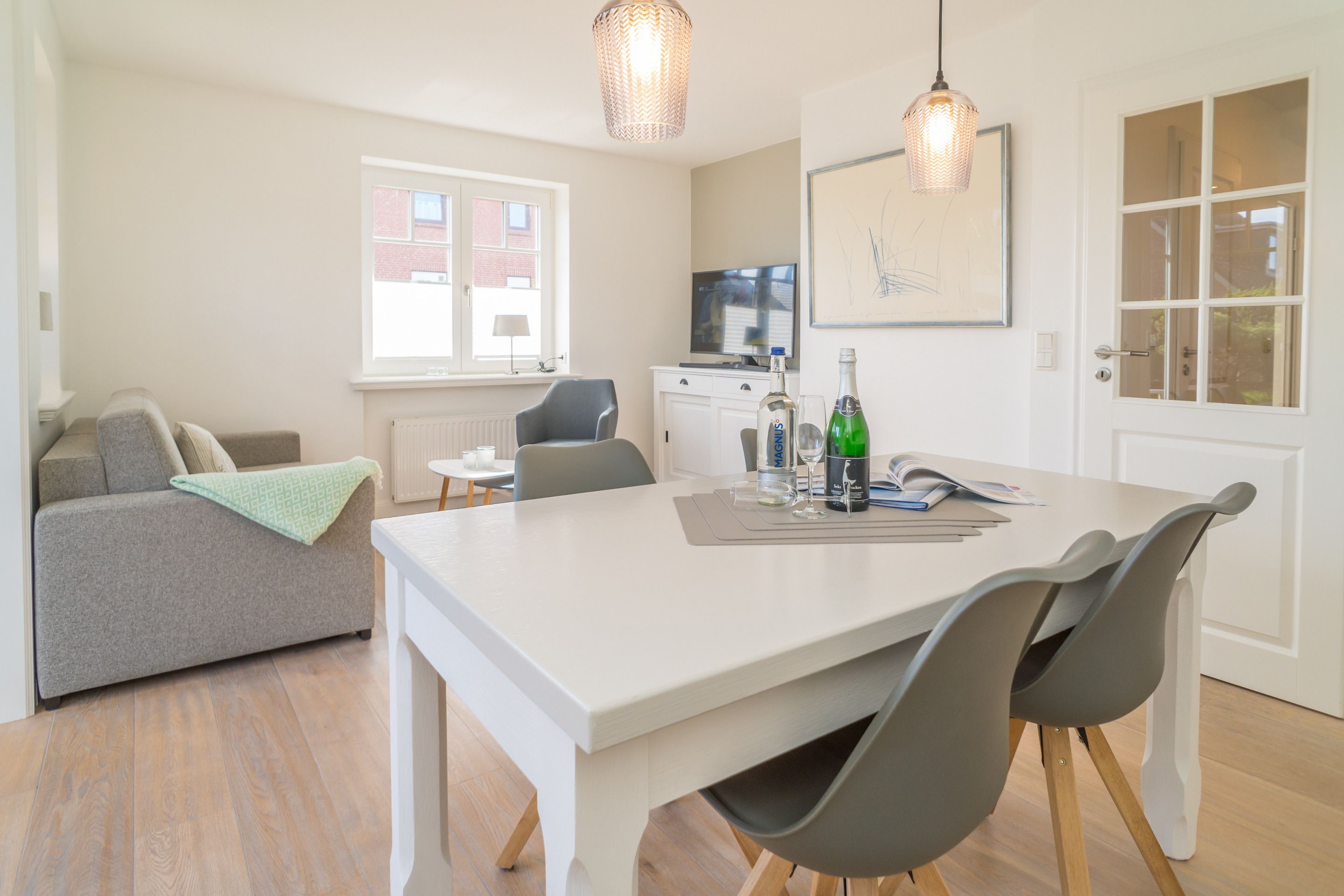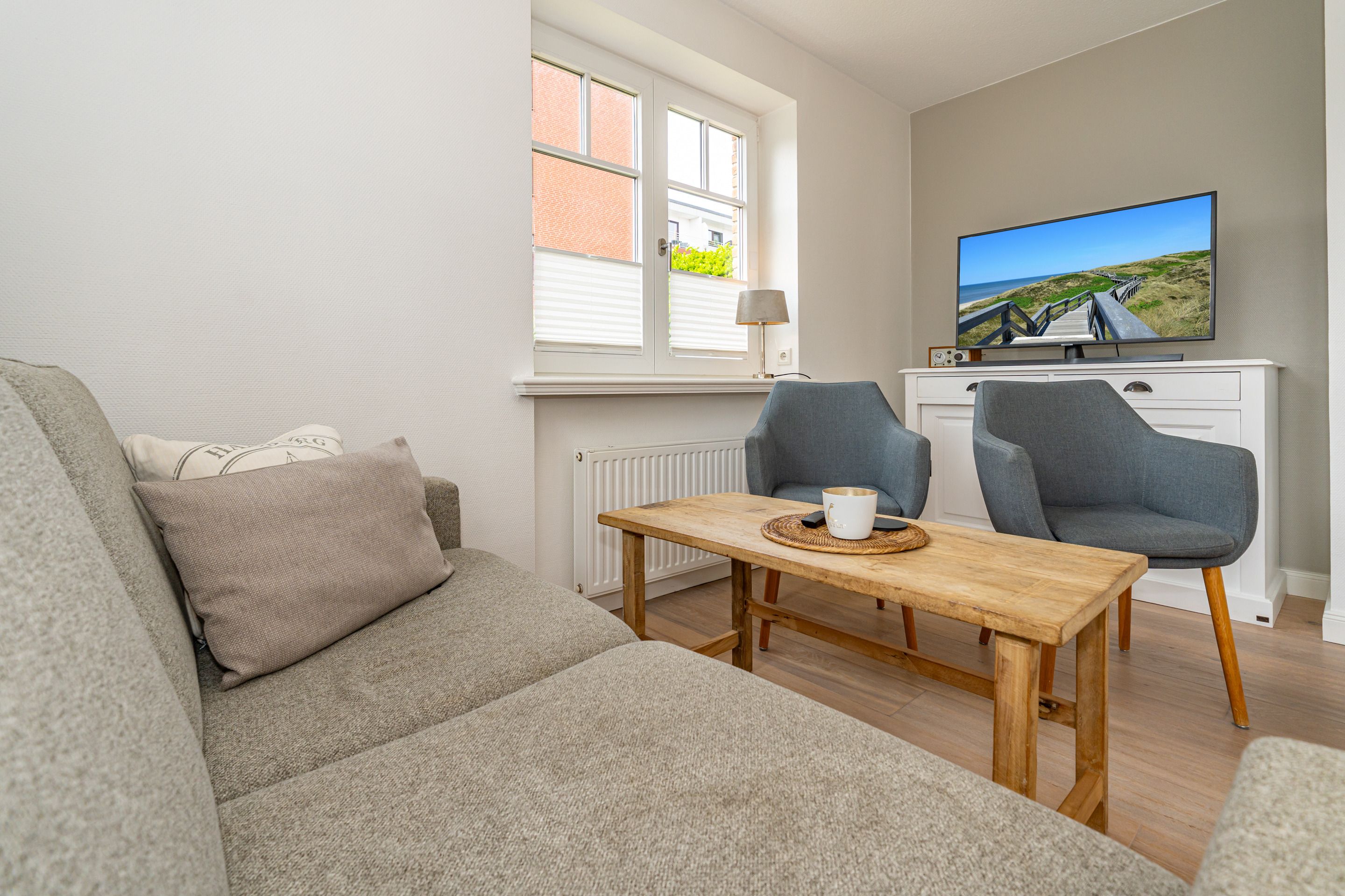 Im Eingangsbereich befindet sich die Diele mit Garderobe. Daran schließt das Wohnzimmer mit direktem Zugang zur geschützten Südterrasse an. Der Wohnraum ist mit einer Sitzgarnitur (2-Sitzer-Couch mit hochwertiger ausziehbarer Schlafmöglichkeit und 2 Sesseln), einem separaten Essplatz, Flachbild-TV, WLAN und einer offene Küche ausgestattet. Die voll ausgestattete weiße Hochglanzküche lässt mit Geschirrspüler, Ceranfeld (4 Felder) und Backofen kaum Wünsche offen. Kaffeemaschine, Wasserkocher und Toaster gehören zur Grundausstattung.