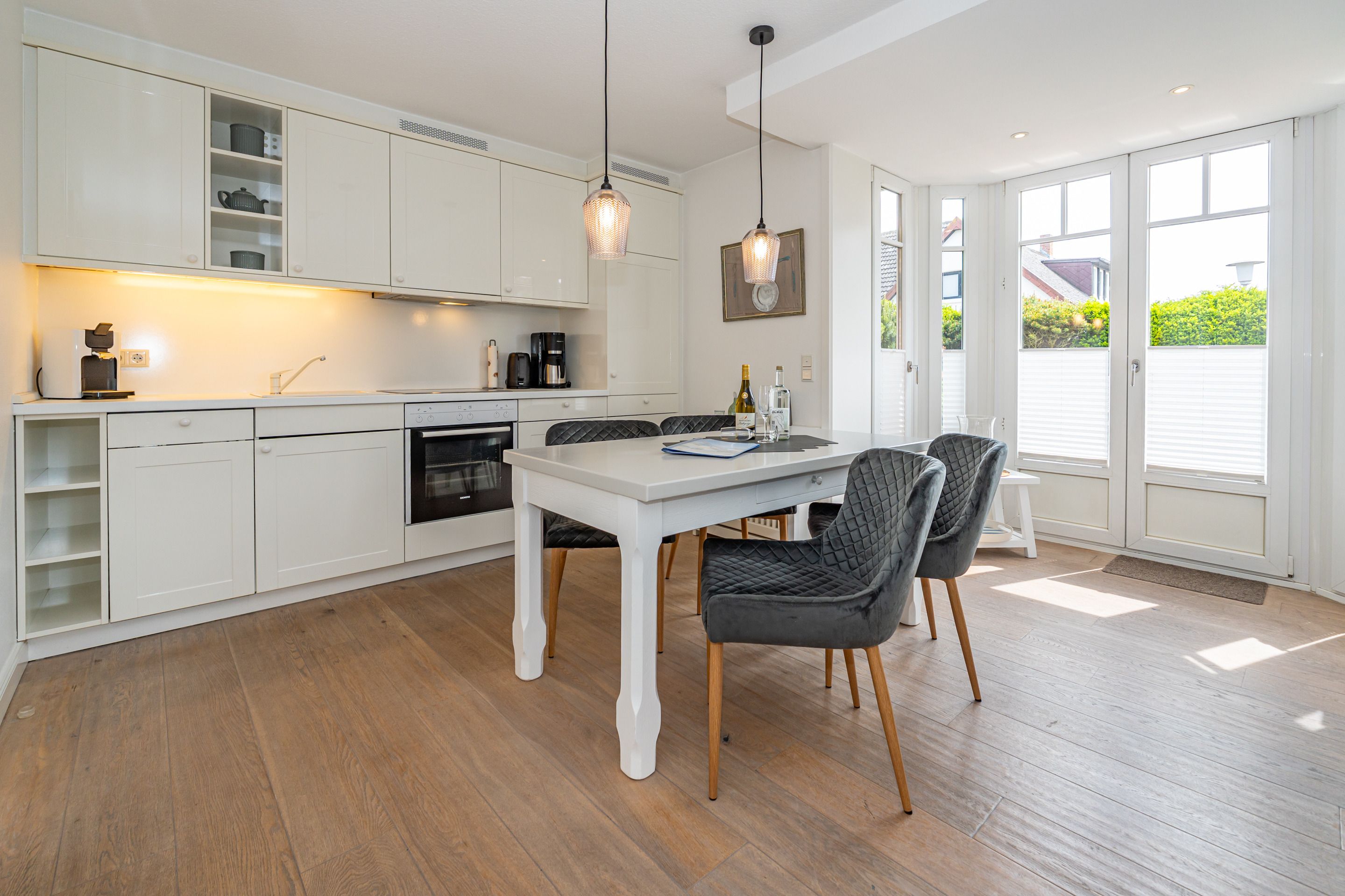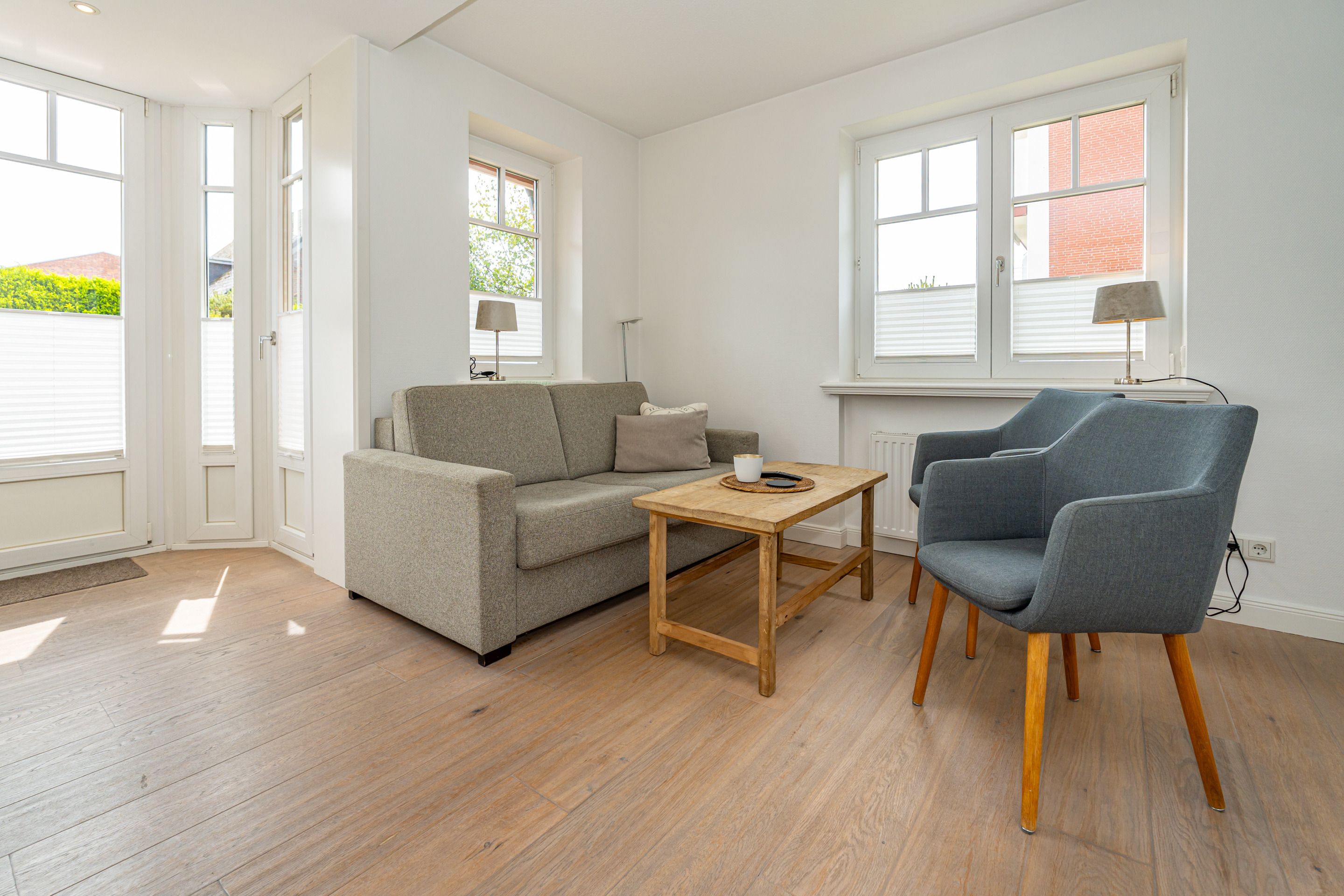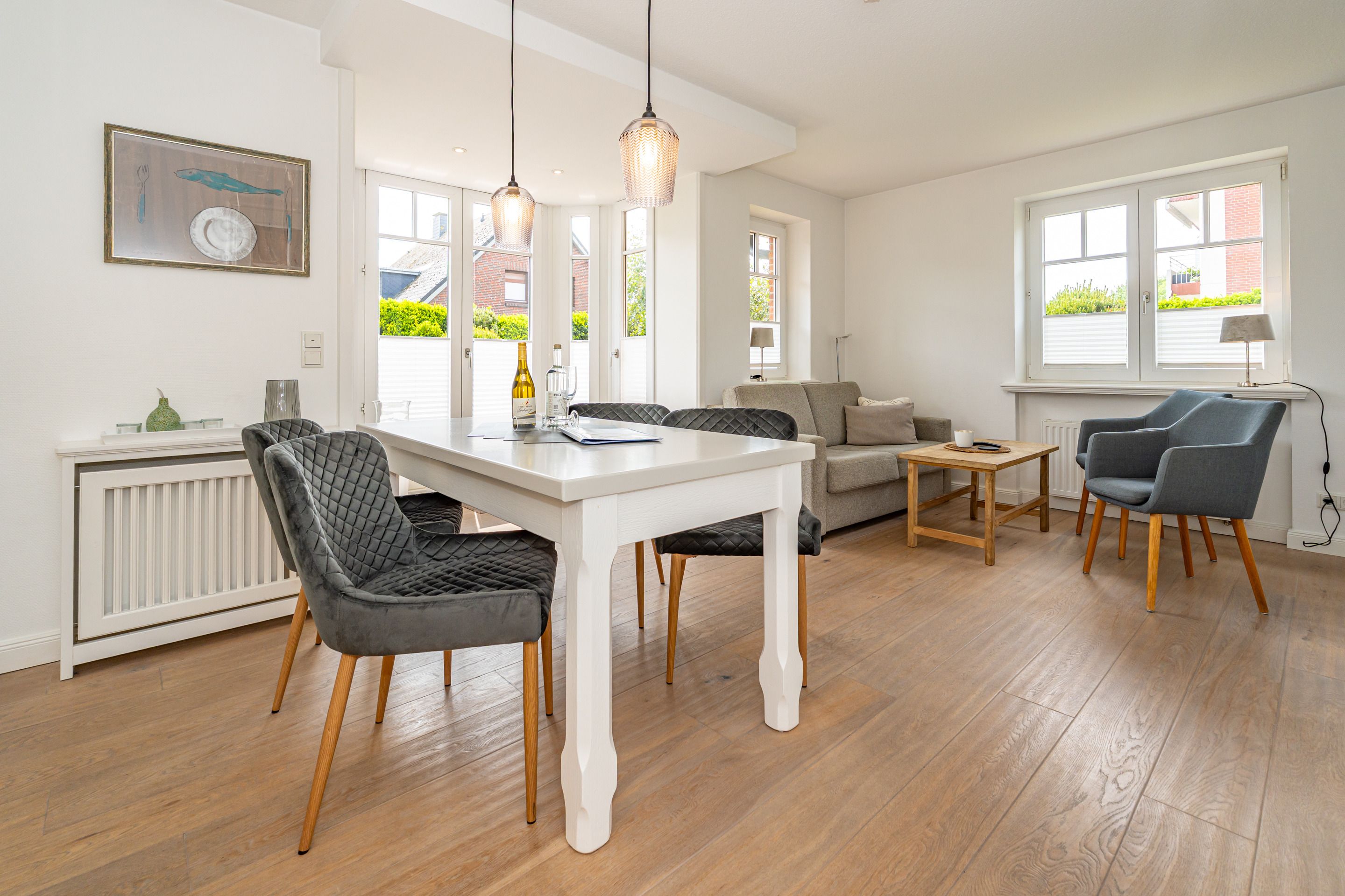 Im Eingangsbereich befindet sich die Diele mit Garderobe. Daran schließt das Wohnzimmer mit direktem Zugang zur geschützten Südterrasse an. Der Wohnraum ist mit einer Sitzgarnitur (2-Sitzer-Couch mit hochwertiger ausziehbarer Schlafmöglichkeit und 2 Sesseln), einem separaten Essplatz, Flachbild-TV, WLAN und einer offene Küche ausgestattet. Die voll ausgestattete weiße Hochglanzküche lässt mit Geschirrspüler, Ceranfeld (4 Felder) und Backofen kaum Wünsche offen. Kaffeemaschine, Wasserkocher und Toaster gehören zur Grundausstattung.