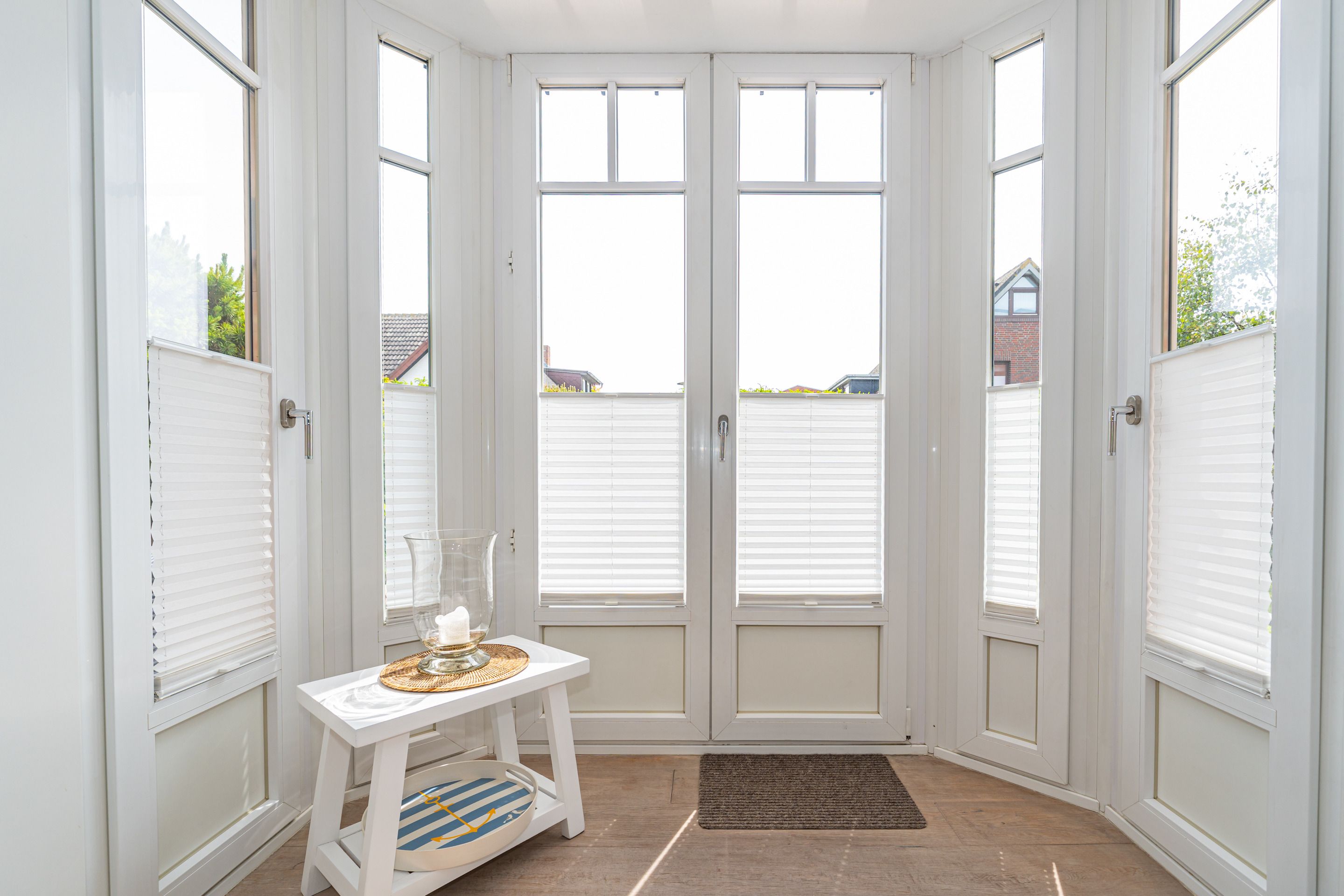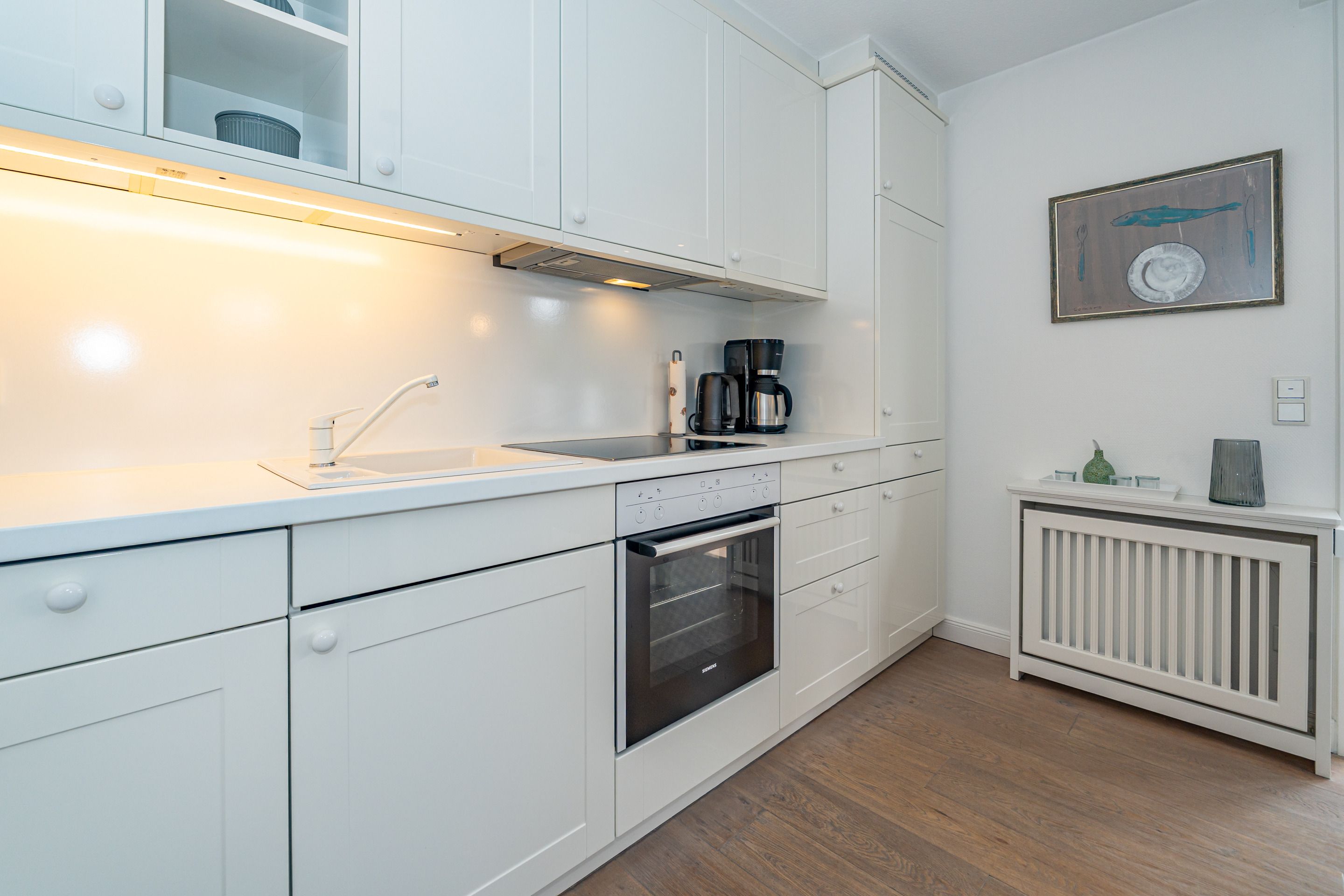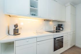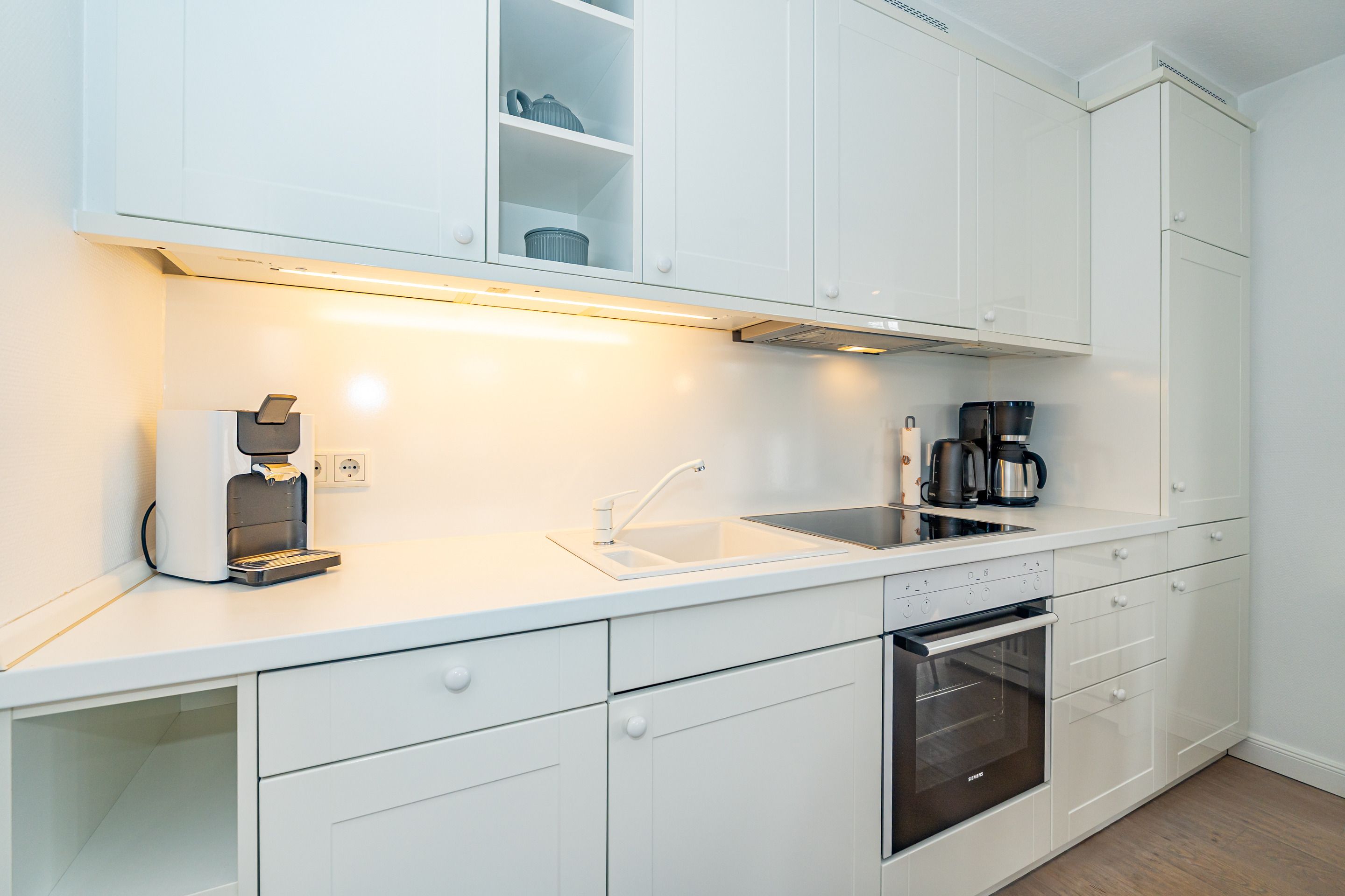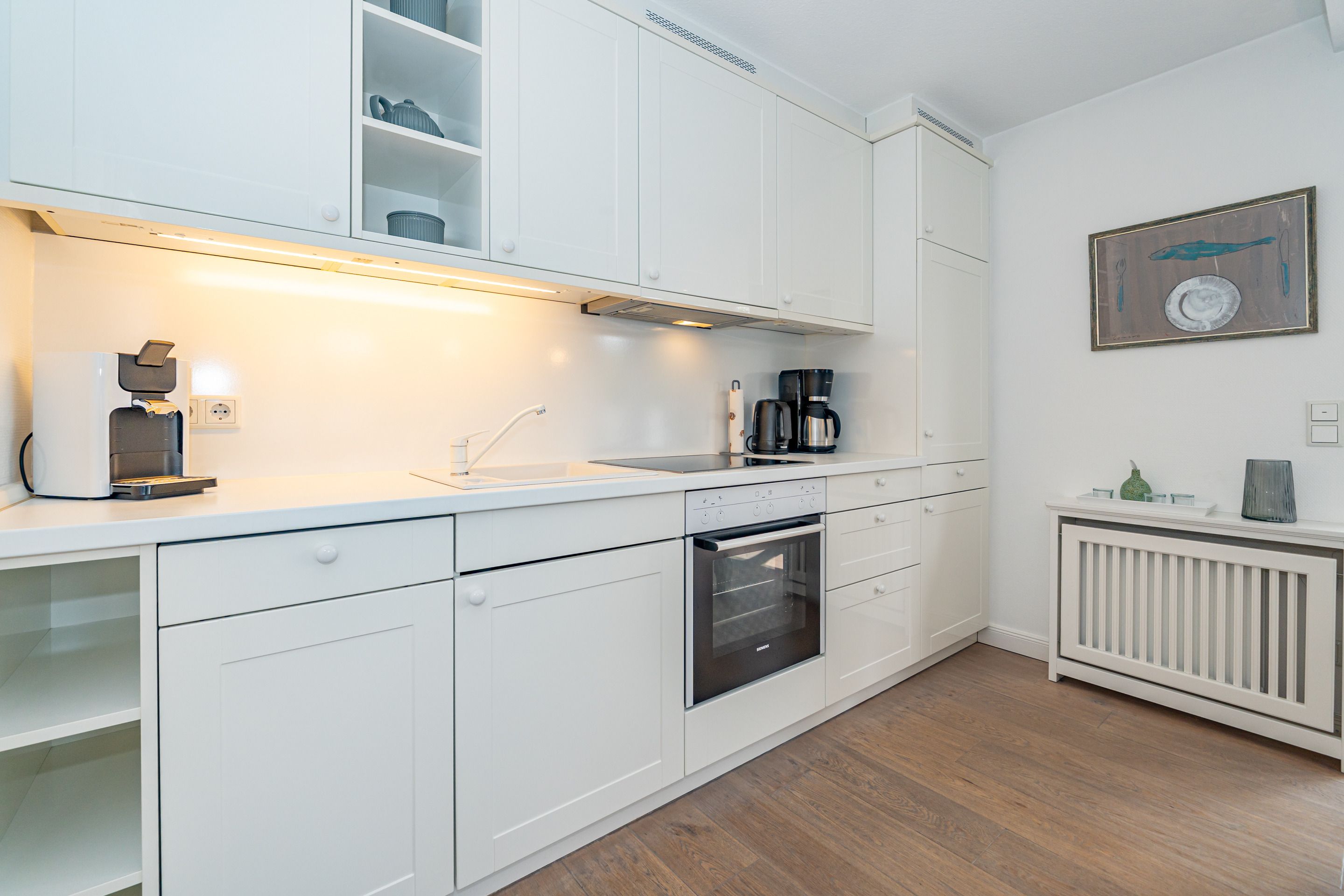 Im Eingangsbereich befindet sich die Diele mit Garderobe. Daran schließt das Wohnzimmer mit direktem Zugang zur geschützten Südterrasse an. Der Wohnraum ist mit einer Sitzgarnitur (2-Sitzer-Couch mit hochwertiger ausziehbarer Schlafmöglichkeit und 2 Sesseln), einem separaten Essplatz, Flachbild-TV, WLAN und einer offene Küche ausgestattet. Die voll ausgestattete weiße Hochglanzküche lässt mit Geschirrspüler, Ceranfeld (4 Felder) und Backofen kaum Wünsche offen. Kaffeemaschine, Wasserkocher und Toaster gehören zur Grundausstattung.