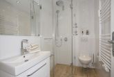 Das neue Badezimmer hat einen Waschtisch, eine Dusche mit extraflachem Einstieg, einen Handtuchtrockner und WC.