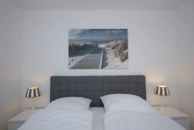 Das vom Wohnzimmer aus begehbare Schlafzimmer hat ein besonders komfortables Boxspringbett mit durchgehender Matratze und extrahohem Kopfteil.