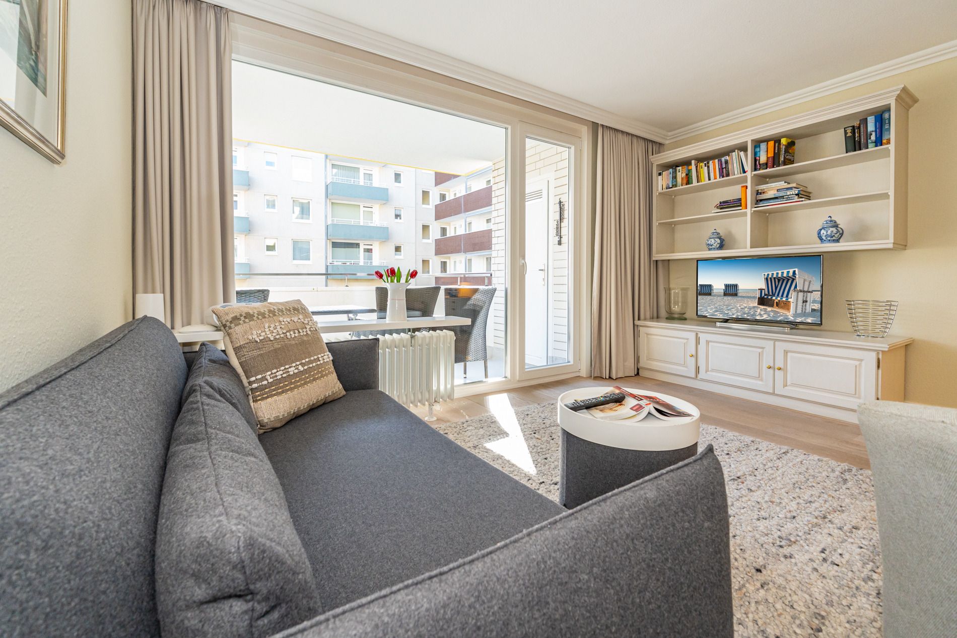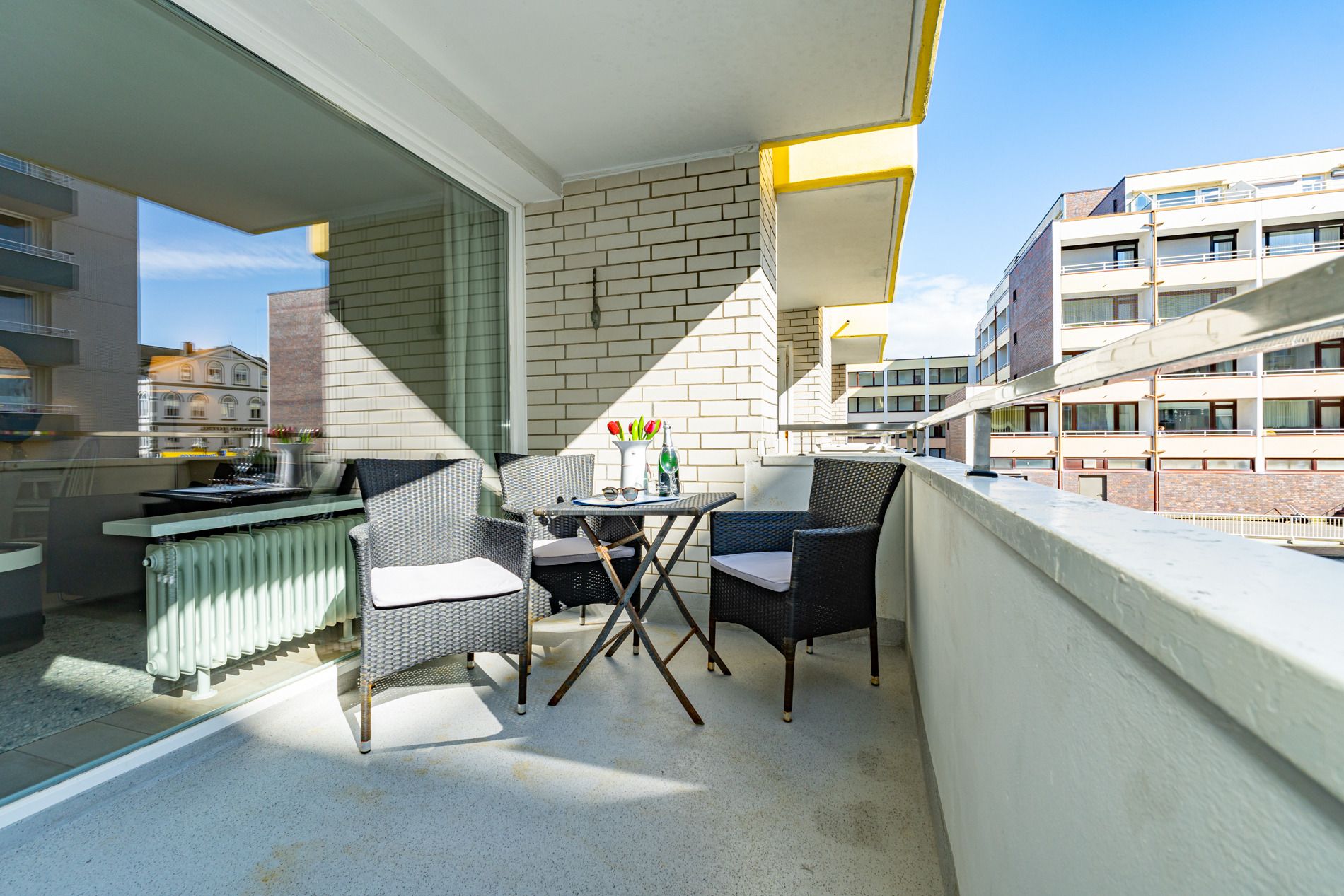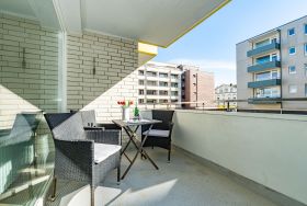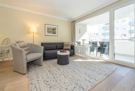Der möblierte Südbalkon lädt zum Entspannen in der Sonne ein. Sitzauflagen für bis zu drei Personen sind vorhanden und befinden sich entweder auf dem Balkon oder im kleinen, vom Balkon aus zugänglichen Abstellraum. Ein PKW-Außenstellplatz kann auf Wunsch für 14,00 € pro Tag dazugebucht werden – bitte beachten Sie, dass nur ein begrenztes Kontingent zur Verfügung steht.