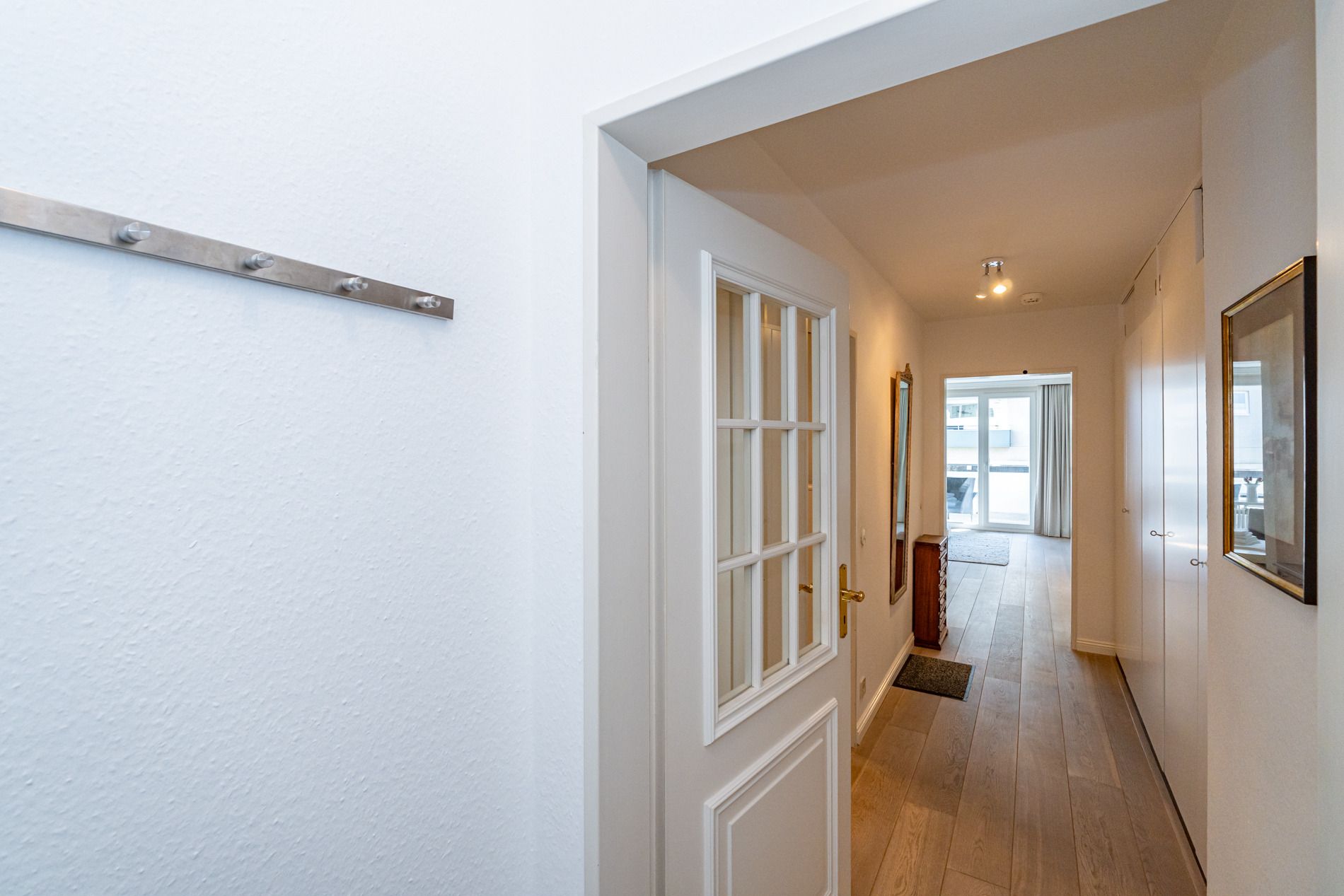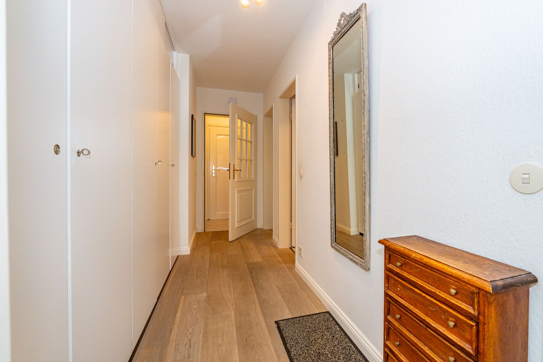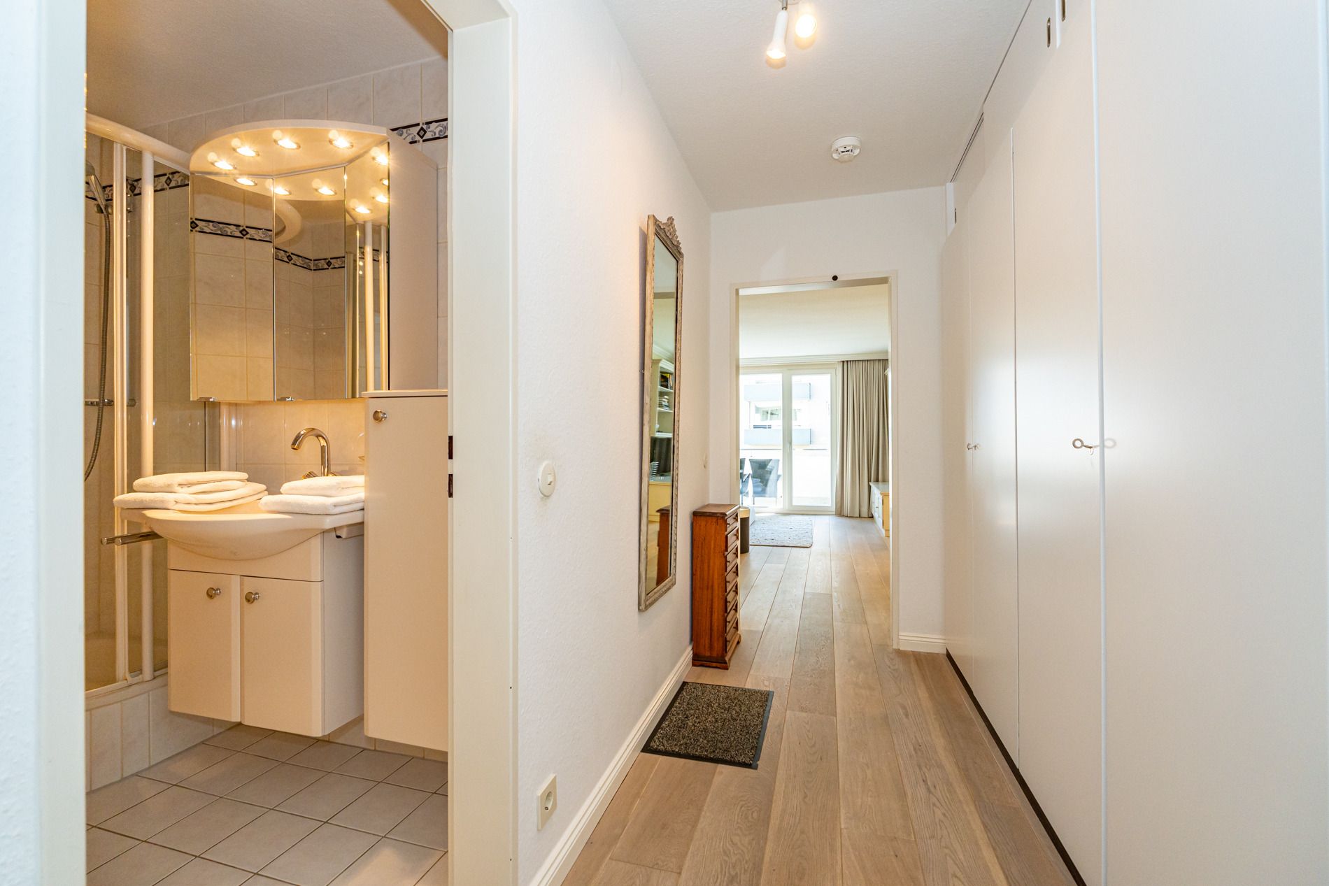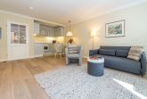 Diese gepflegte 2-Zimmer-Nichtraucherwohnung in der 1. Etage überzeugt durch ihre zentrale Lage, hochwertige Ausstattung und einen sonnigen Südbalkon. Auf ca. 48 m² bietet sie komfortablen Platz für bis zu zwei Personen. Über den Windfang mit Garderobe gelangt man in den Flur, der mit praktischen Einbauschränken ausgestattet ist. Von dort aus erreichen Sie das helle Wohnzimmer mit Zugang zum Balkon, die moderne Küchenzeile, das kleine Schlafzimmer sowie das Duschbad mit WC.