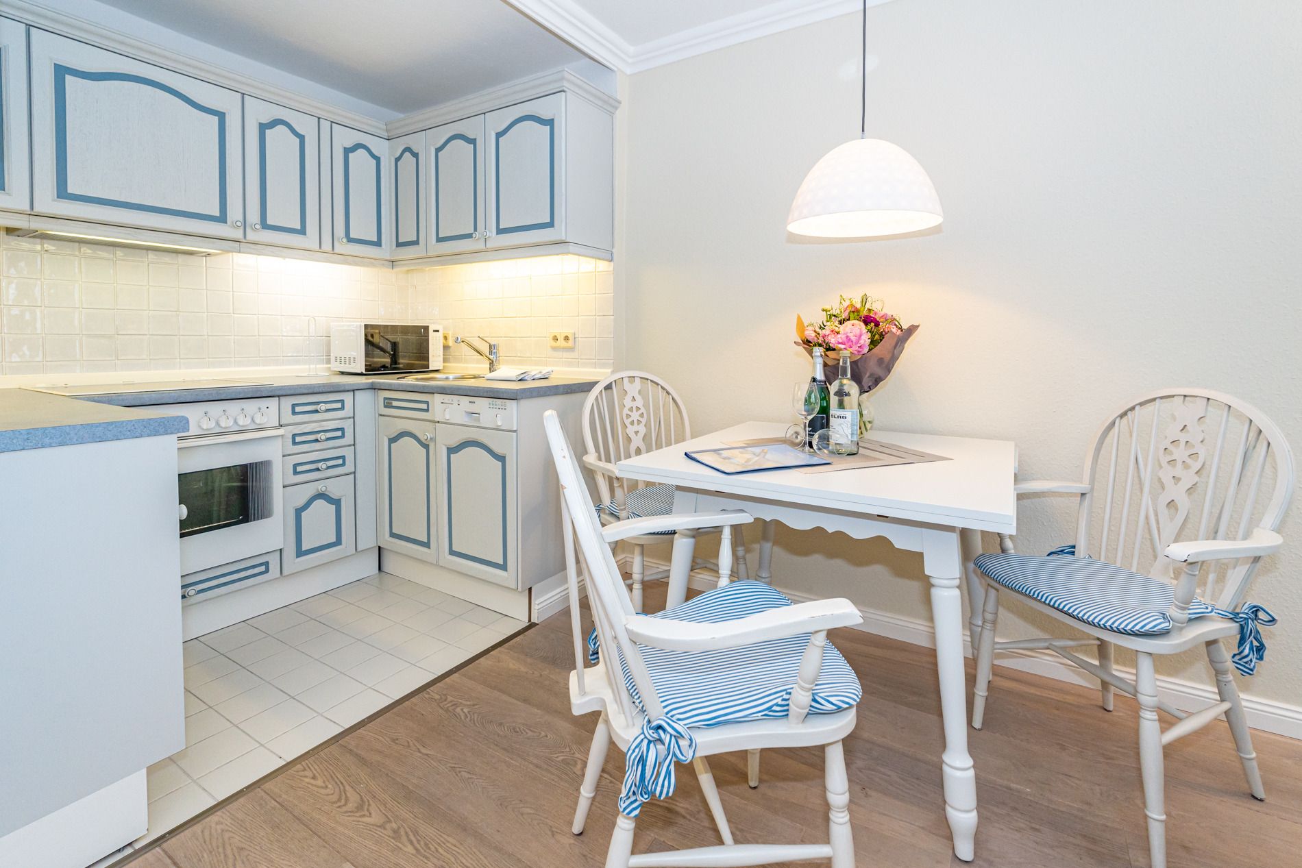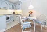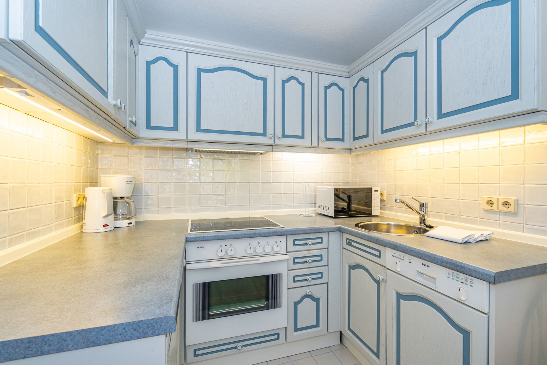 Der Wohnbereich ist mit einem hochwertigen Echtholzboden versehen und verfügt über eine gemütliche 2-Sitzer-Schlafcouch (Liegefläche ca. 1,50 m x 2,00 m), einen Sessel, einen flexibel nutzbaren Beistelltisch mit abnehmbarem Tablett (auch als Hocker verwendbar), einen Essplatz, SAT-TV und einen Bluetooth-Lautsprecher. Die offene Küchenzeile bietet alles, was Sie für einen angenehmen Aufenthalt benötigen: ein 4-Platten-Cerankochfeld, Backofen, Mikrowelle, Geschirrspüler sowie einen Kühlschrank mit 3*-Gefrierfach. Kaffeemaschine, Wasserkocher und Toaster gehören selbstverständlich zur Grundausstattung.