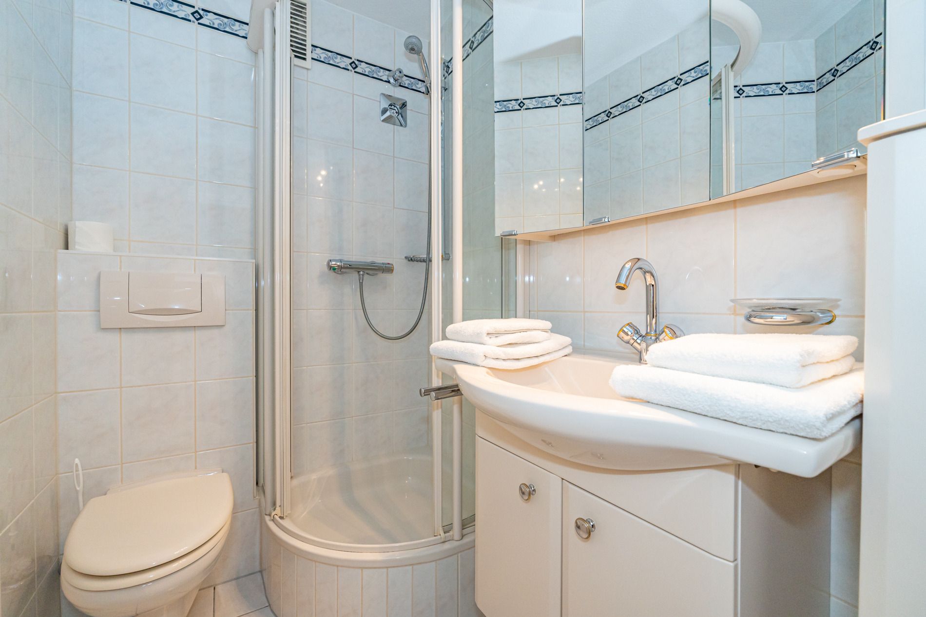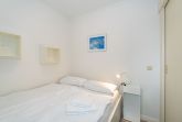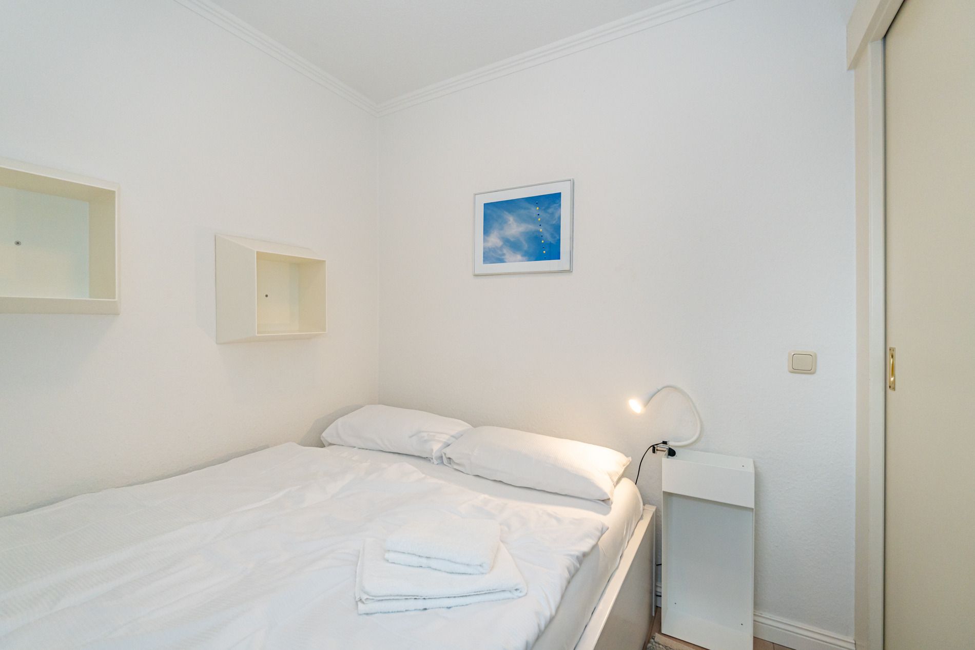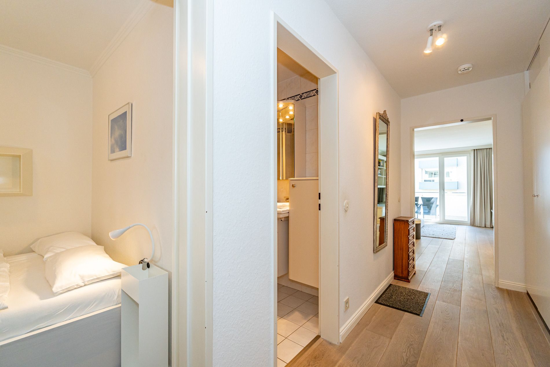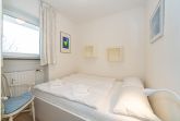 Das separate Schlafzimmer ist mit einem Doppelbett (ca. 1,40 m x 1,90 m) ausgestattet. Auch hier sorgt der Echtholzboden für ein behagliches Wohngefühl. Das Badezimmer verfügt über eine Dusche, ein WC sowie einen Waschtisch und ist funktional und gepflegt eingerichtet.