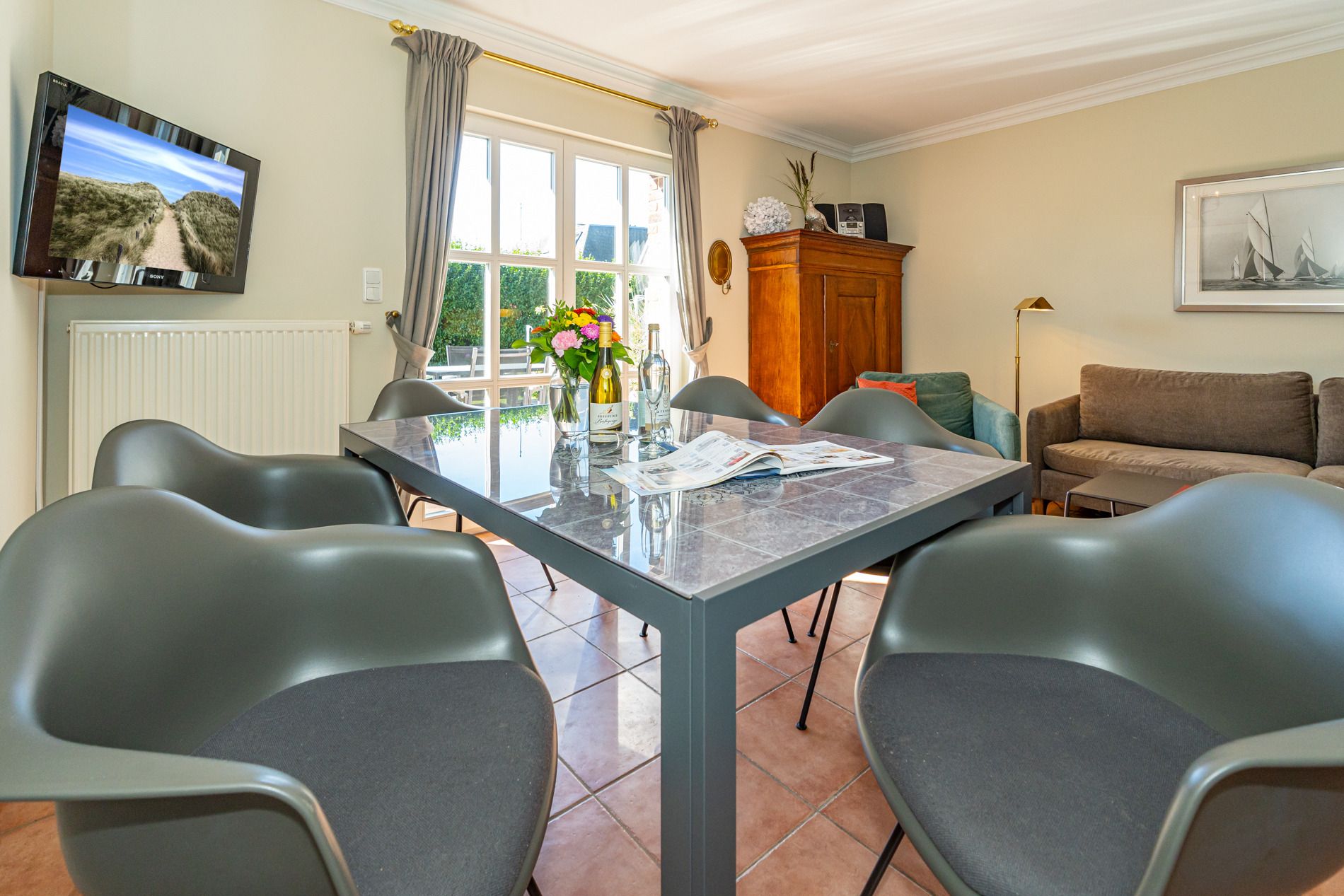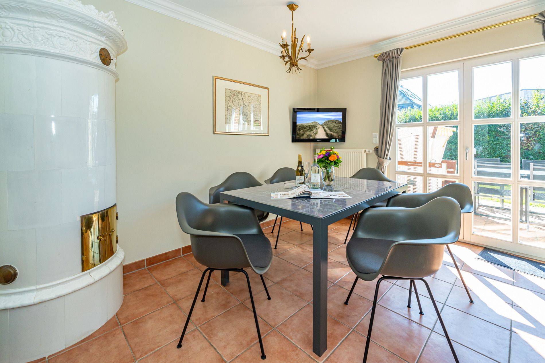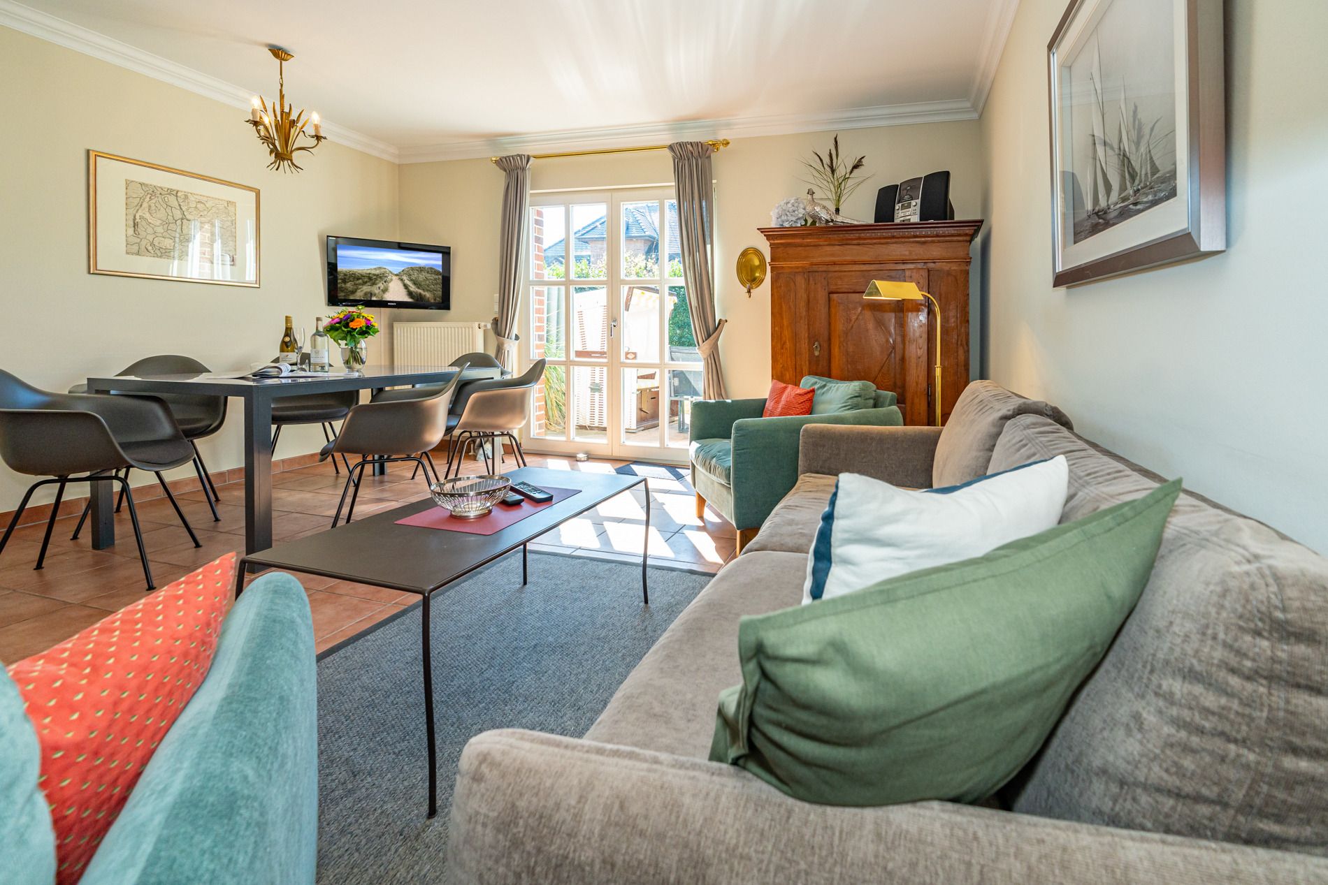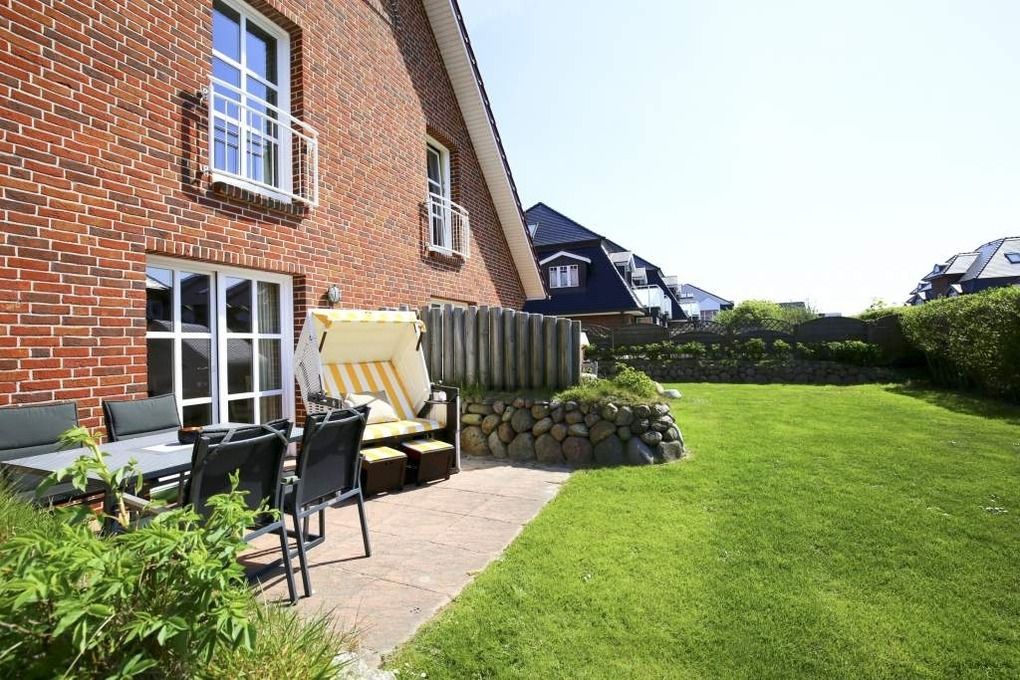Vom Wohnzimmer betritt man die nach Süden ausgerichtete Sonnenterrasse mit Saison-Strandkorb (ca. April-Oktober) und Gartenmöbeln.