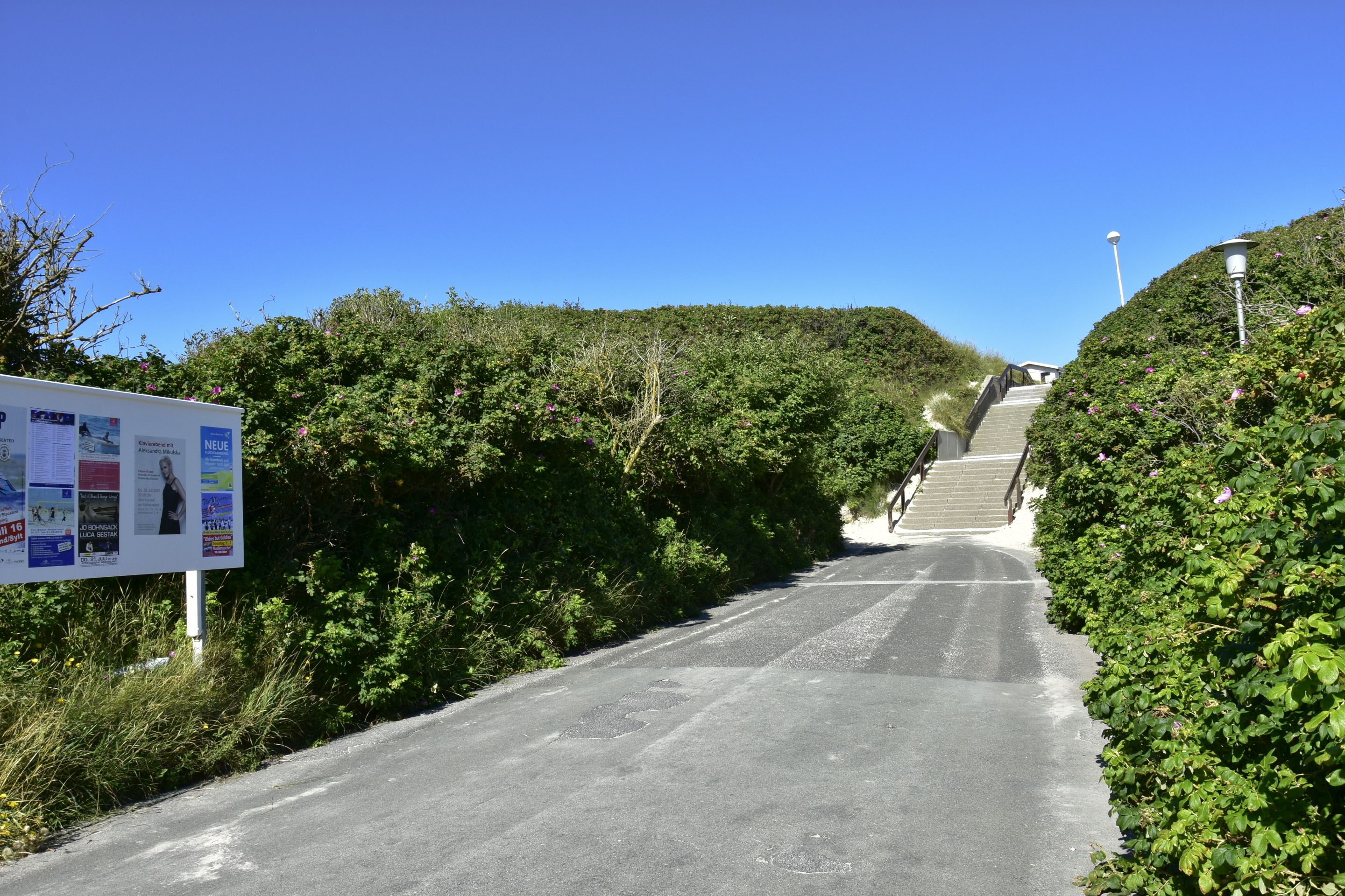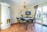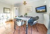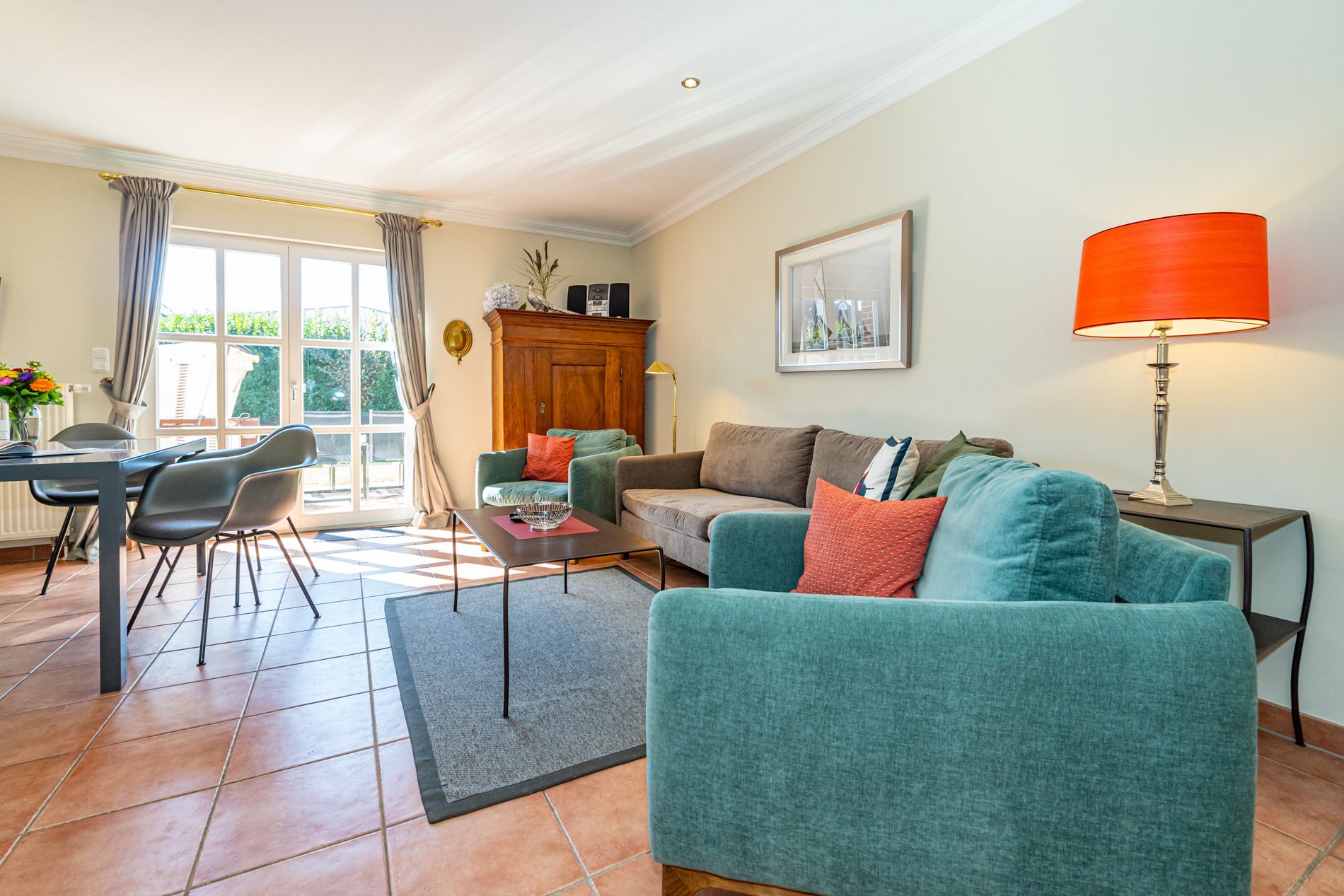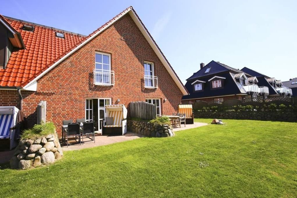 Vom Wohnzimmer betritt man die nach Süden ausgerichtete Sonnenterrasse mit Saison-Strandkorb (ca. April-Oktober) und Gartenmöbeln.