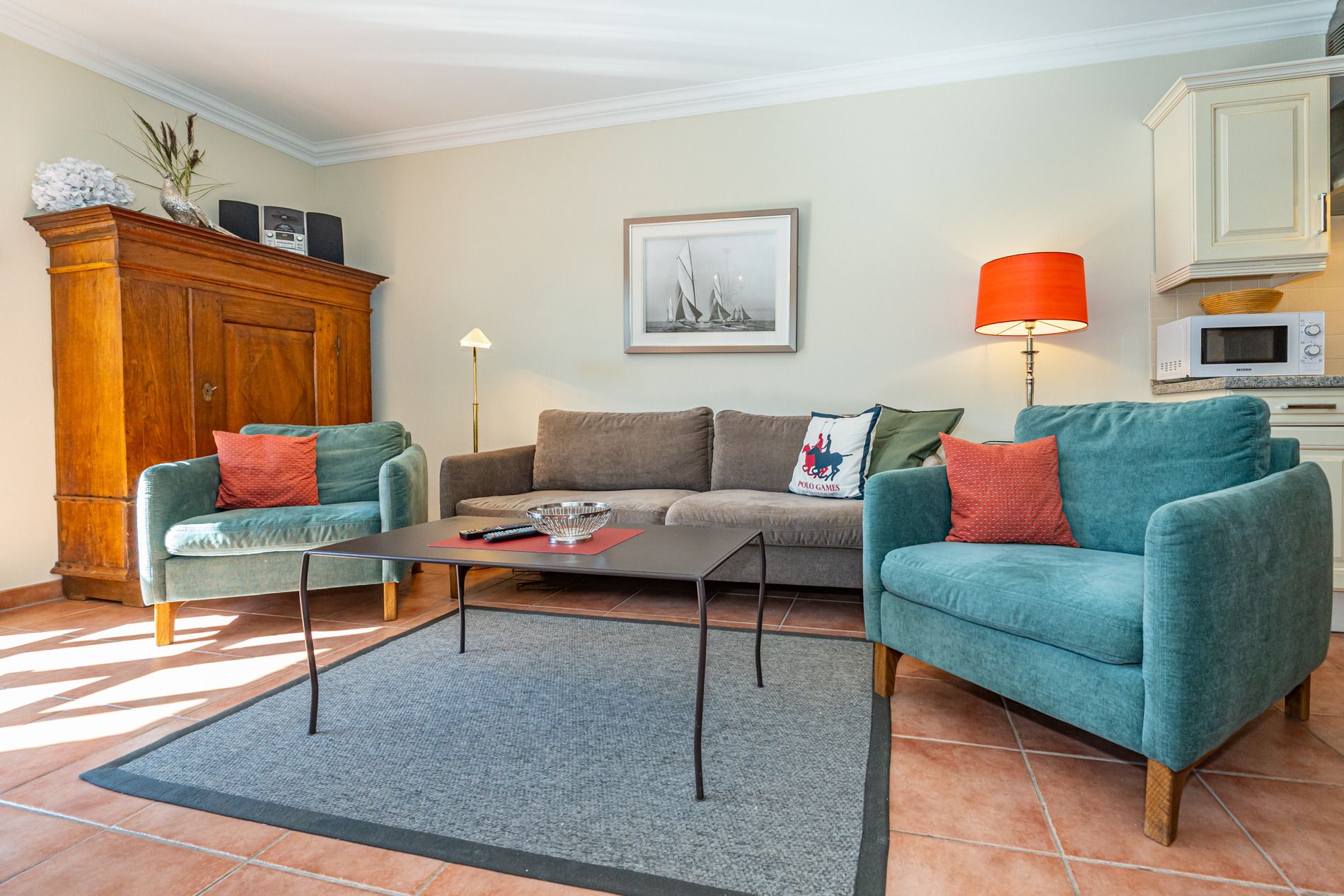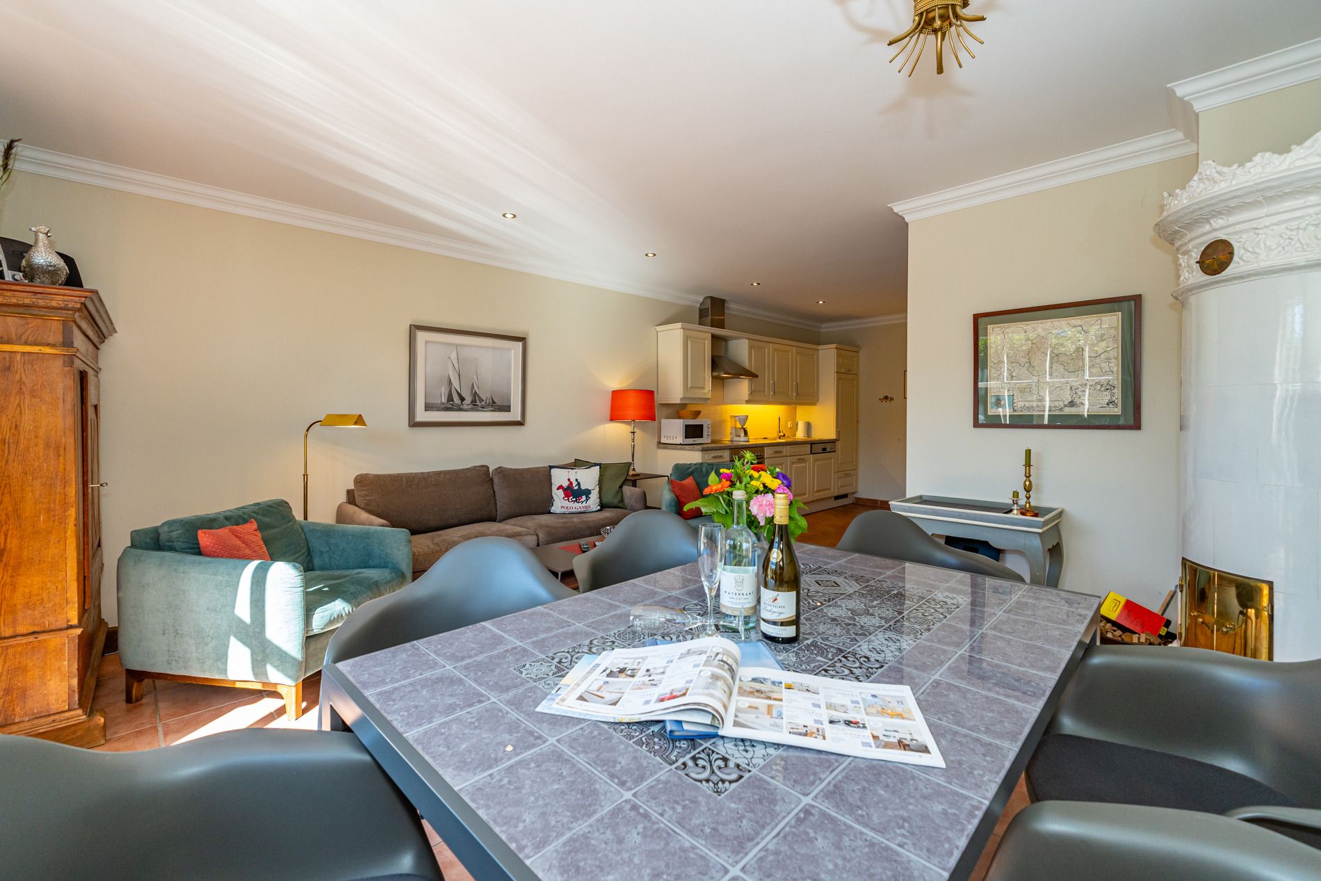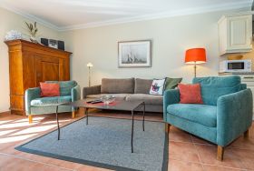 Das Wohnzimmer ist mit einer gemütlichen Couchgarnitur (Zweisitzer-Couch und zwei urgemütliche Ohrensessel), Essplatz für 6 Personen, weißem antiken Kachelofen, großem Kabel-Flachbild-TV, Radio/CD-Player und einer cremefarbenen Küche im Landhausstil ausgestattet. Kostenlose Internetnutzung per W-Lan (ohne Gewähr).