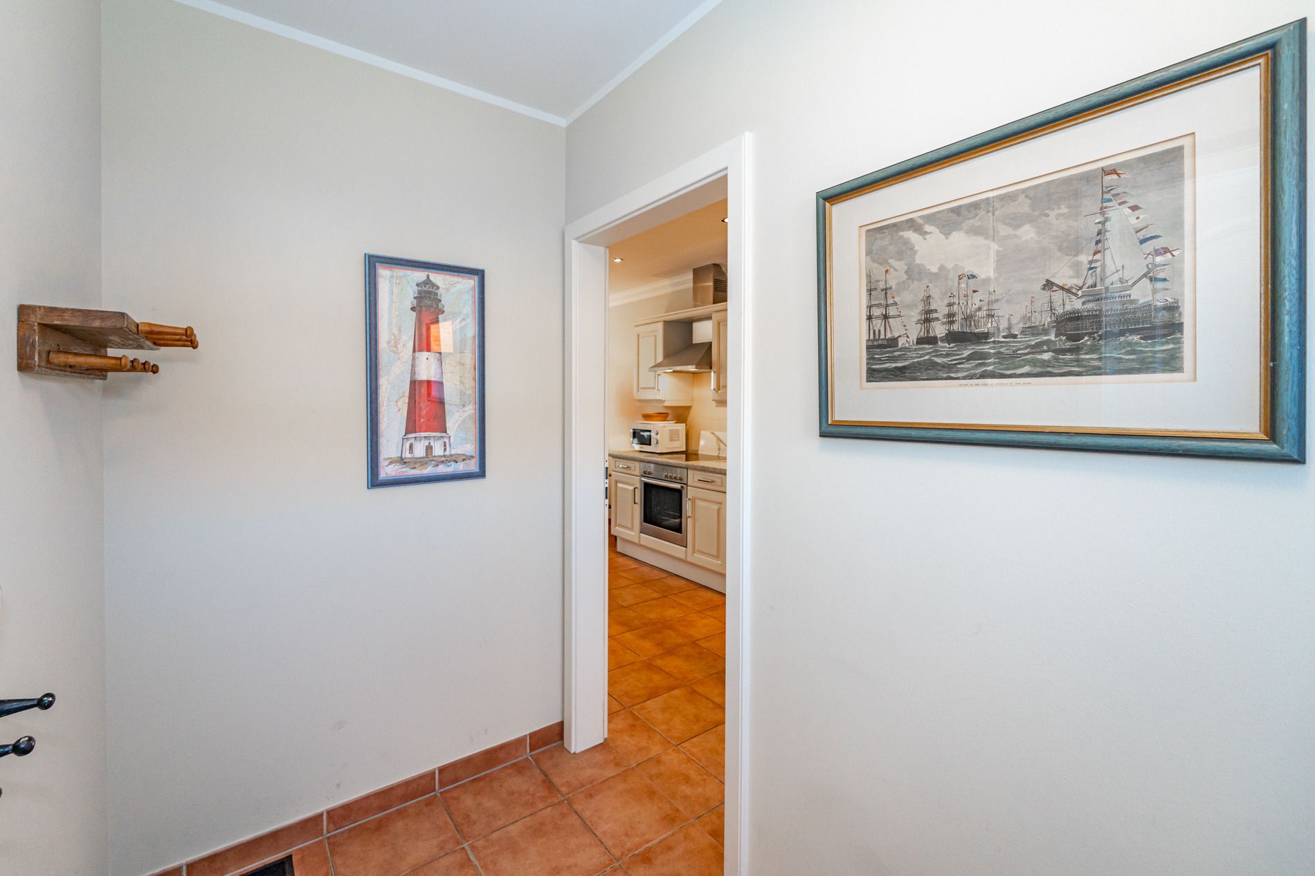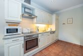 Die offene, vollausgestattete Einbauküche hat einen Geschirrspüler, einen Herd mit Backofen, 4-Platten-Ceranfeld, Mikrowelle sowie einen Kühlschrank mit 3-Sterne-Gefrierfach.