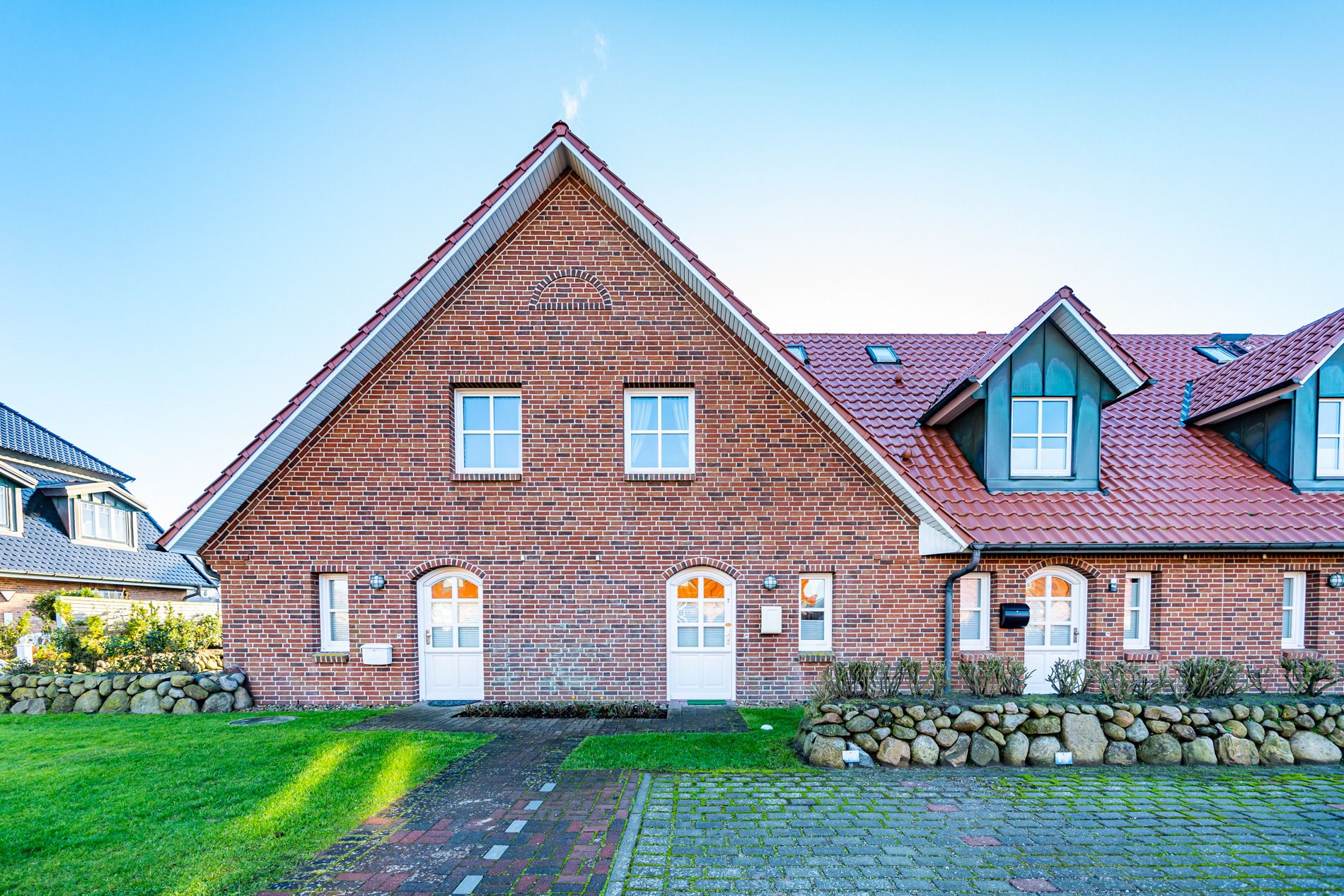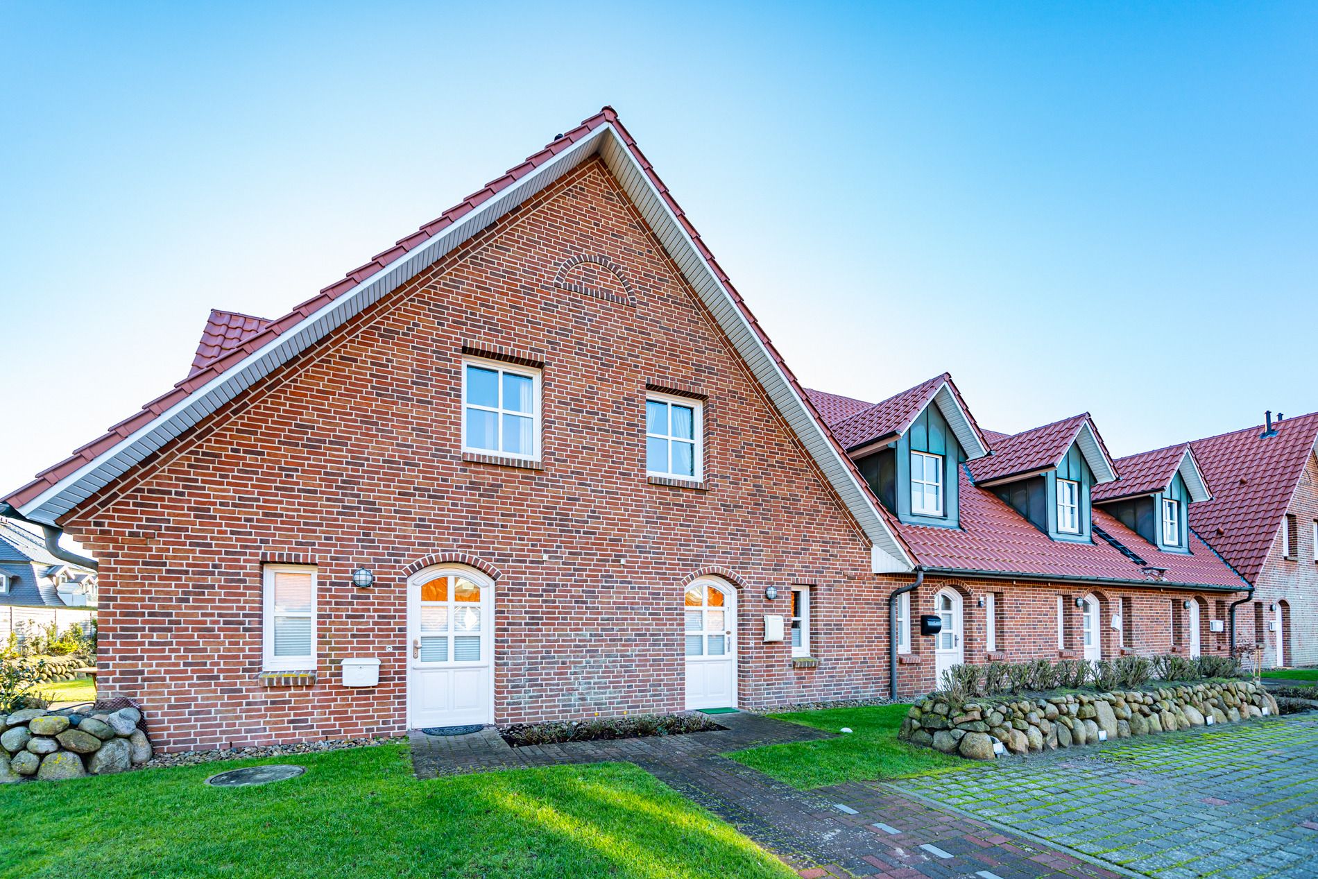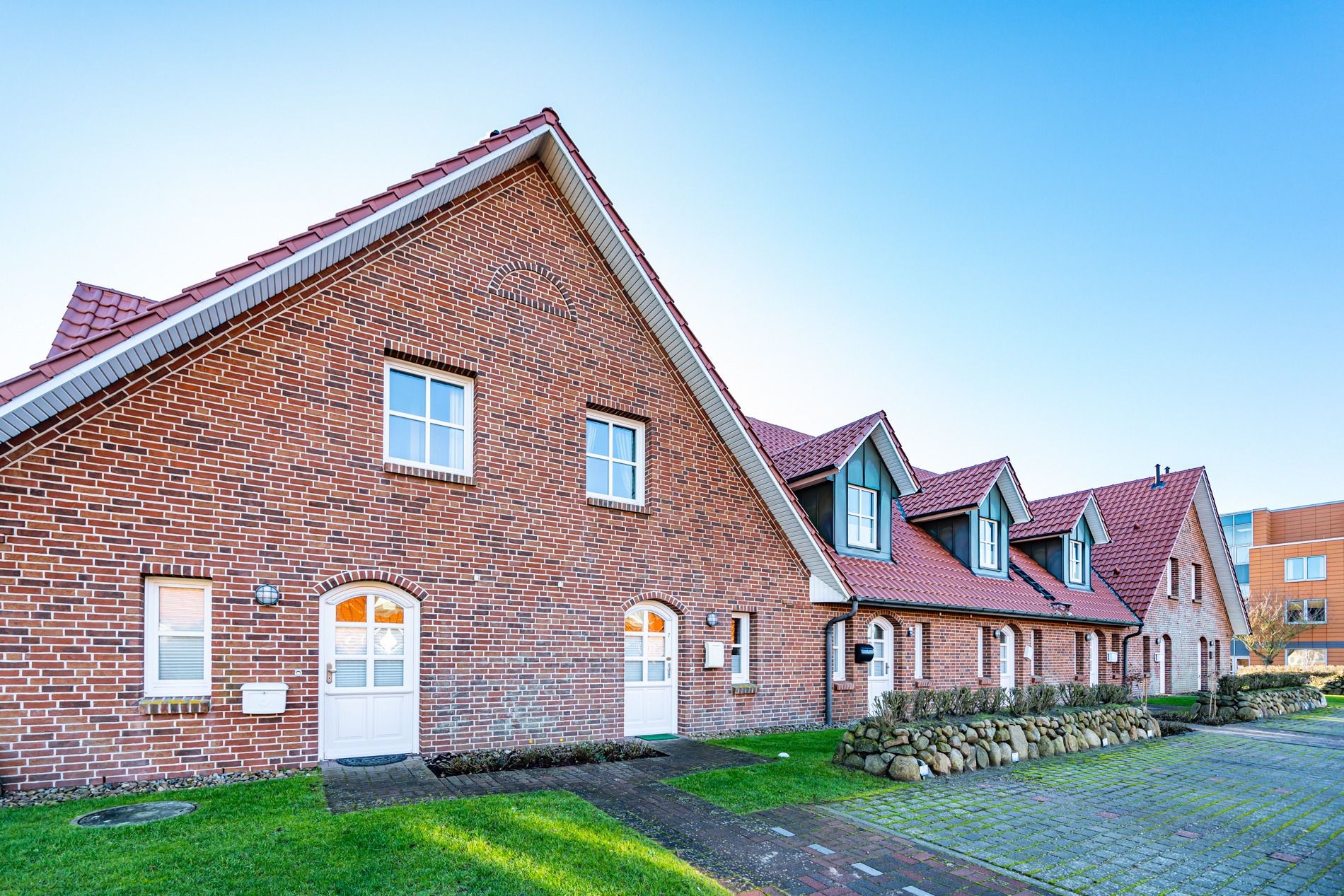Im Erdgeschoss gelangt man von der Diele in das exklusive Wohnzimmer mit offener Einbauküche, das Duschbad/WC und in den Hauswirtschaftsraum mit Waschmaschine und Trockner.