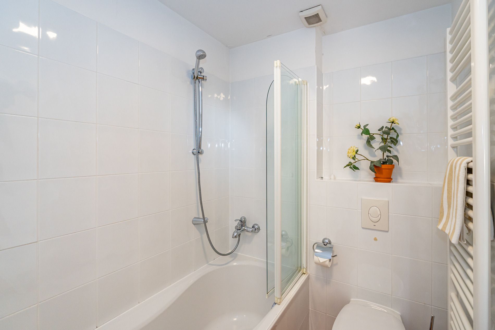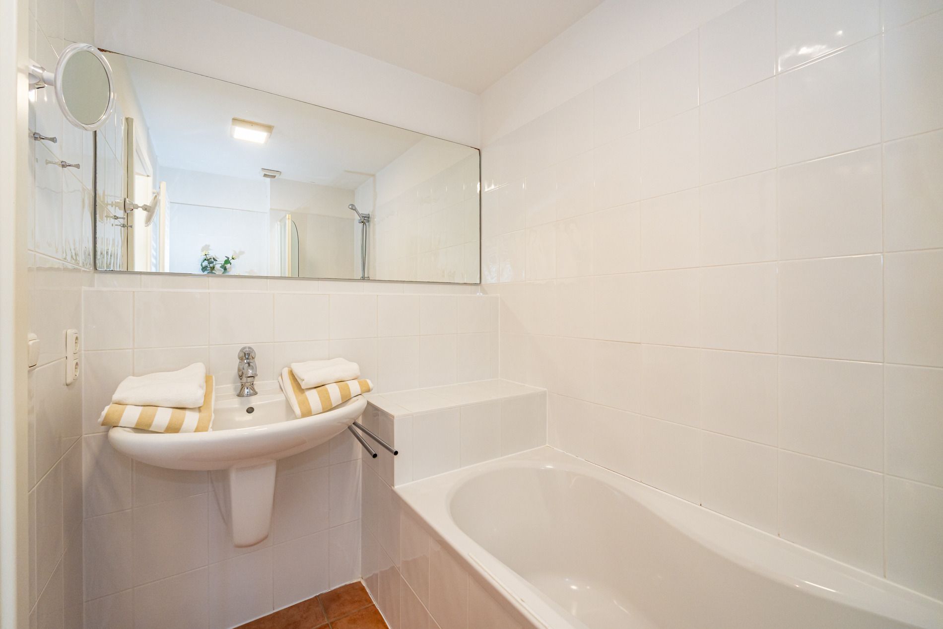 Das zweite Badezimmer besitzt eine Badewanne mit Duschvorrichtung, Waschtisch, Handtuchtrockner, WC und Fön.