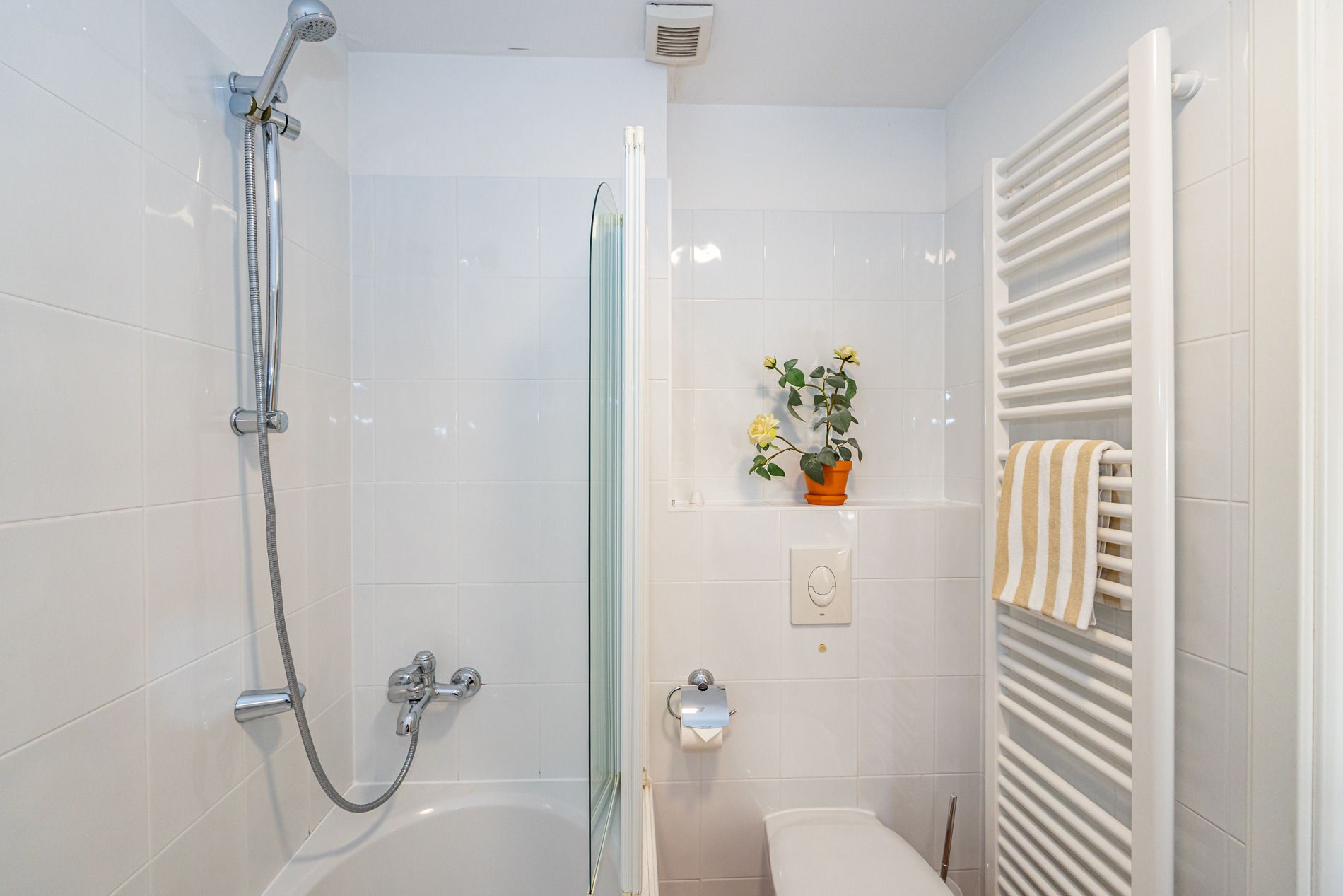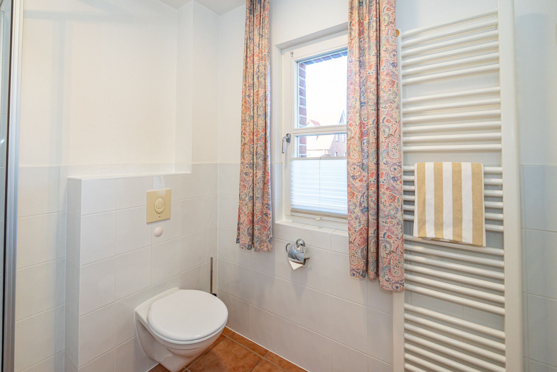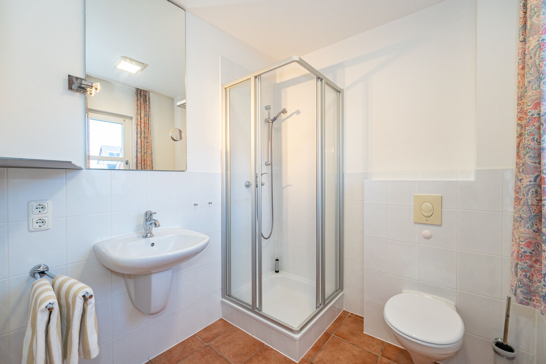 Das helle Duschbad mit Fenster ist mit Dusche, Waschtisch, Handtuchtrockner, WC und Fön ausgestattet.