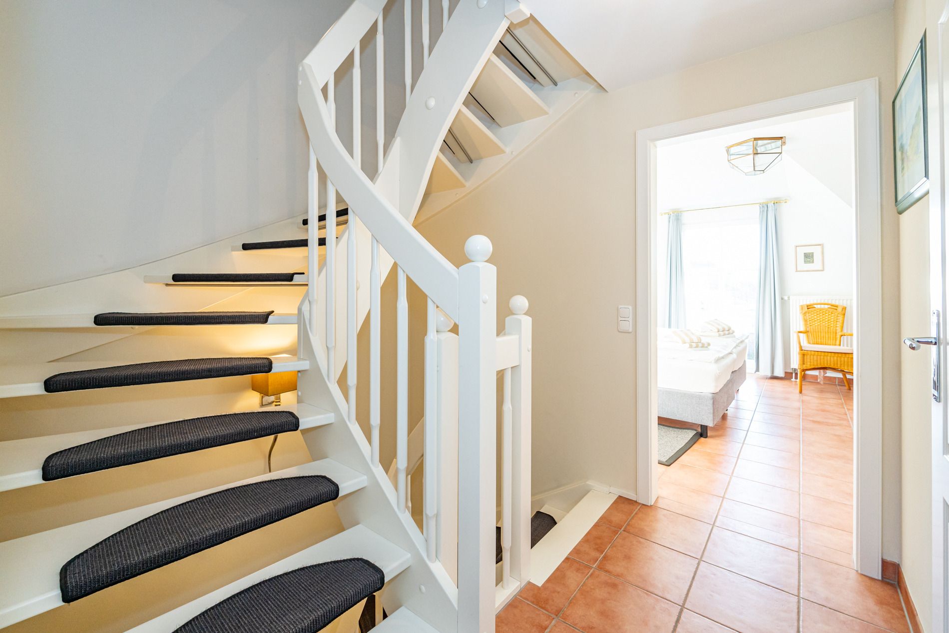 Im 1. Obergeschoss befindet sich ein großzügiges Schafzimmer mit Doppelbett (0,90 m x 2,00 m), Kleiderschrank, Stuhl und zusätzlichem Flachbild-TV. Und ein weiteres gemütliches Doppel-Schlafzimmer (0,90 x 2,00 m) mit Kleiderschrank, Stuhl und TV.