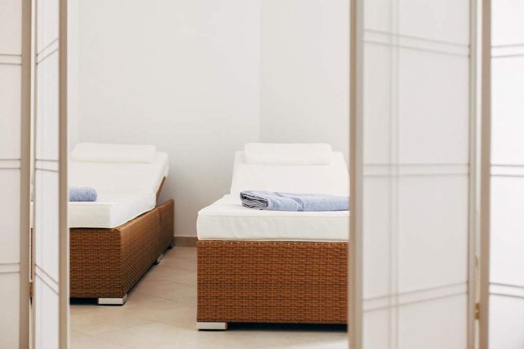 Ein Wellnesspaket (bestehend aus 1 Bademantel, 1 Saunatuch, 1 Badetuch und 1 Paar Badeslipper) kann für 15,00 Eur/Paket mit gemietet werden.