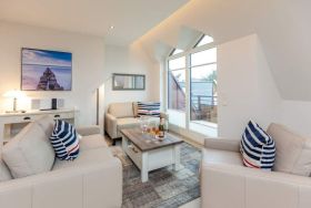 Luxuriöse 3-Zimmer-Maisonette-Nichtraucher-Ferienwohnung, ca. 75 qm, im 1. Obergeschoss, Südost- und Südwestloggia mit Strandkorb für 4 Personen.