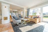 Der einladende Eingangsbereich mit Garderobe und großem Spiegel führt in den lichtdurchfluteten Wohn- und Essbereich, der mit warmen Terracotta-Fliesen, gemütlicher Sofaecke und einem antiken Kachelofen ein behagliches Ambiente schafft. Über eine typische friesische Klöntür oder die Terrassentür gelangen Sie direkt auf die windgeschützte Südterrasse.