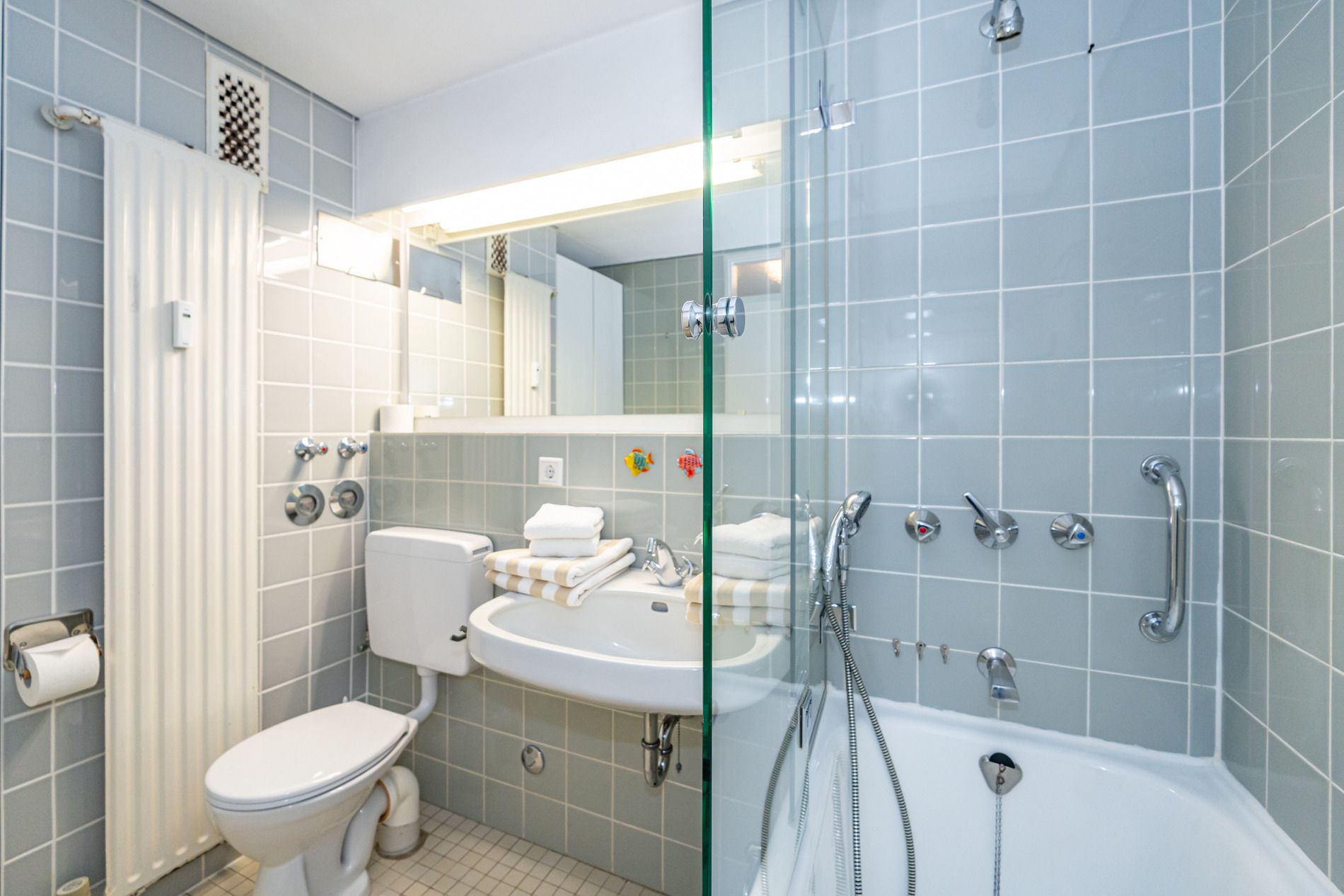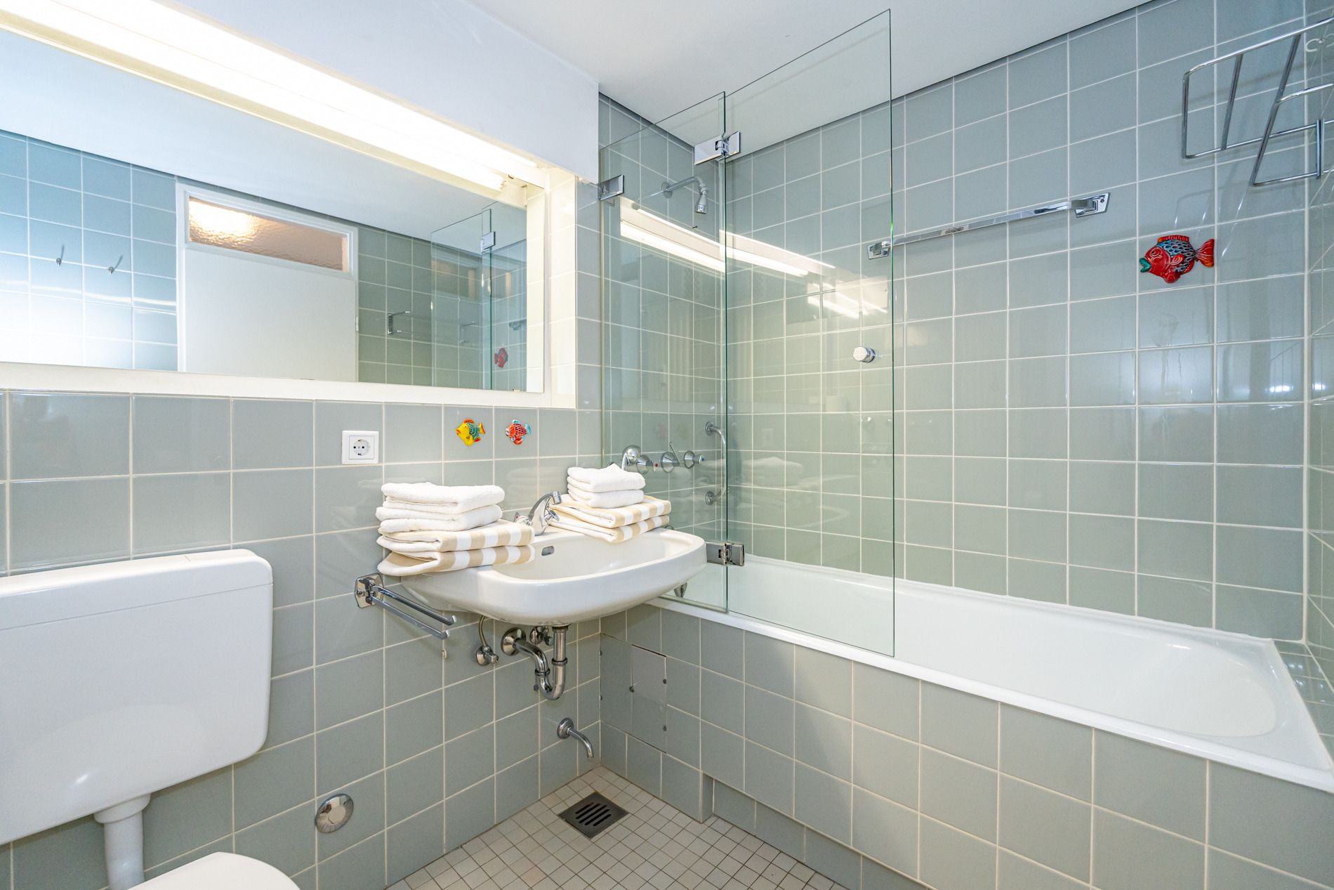 Im Bad befinden sich eine Badewanne, ein WC sowie ein Waschtisch.