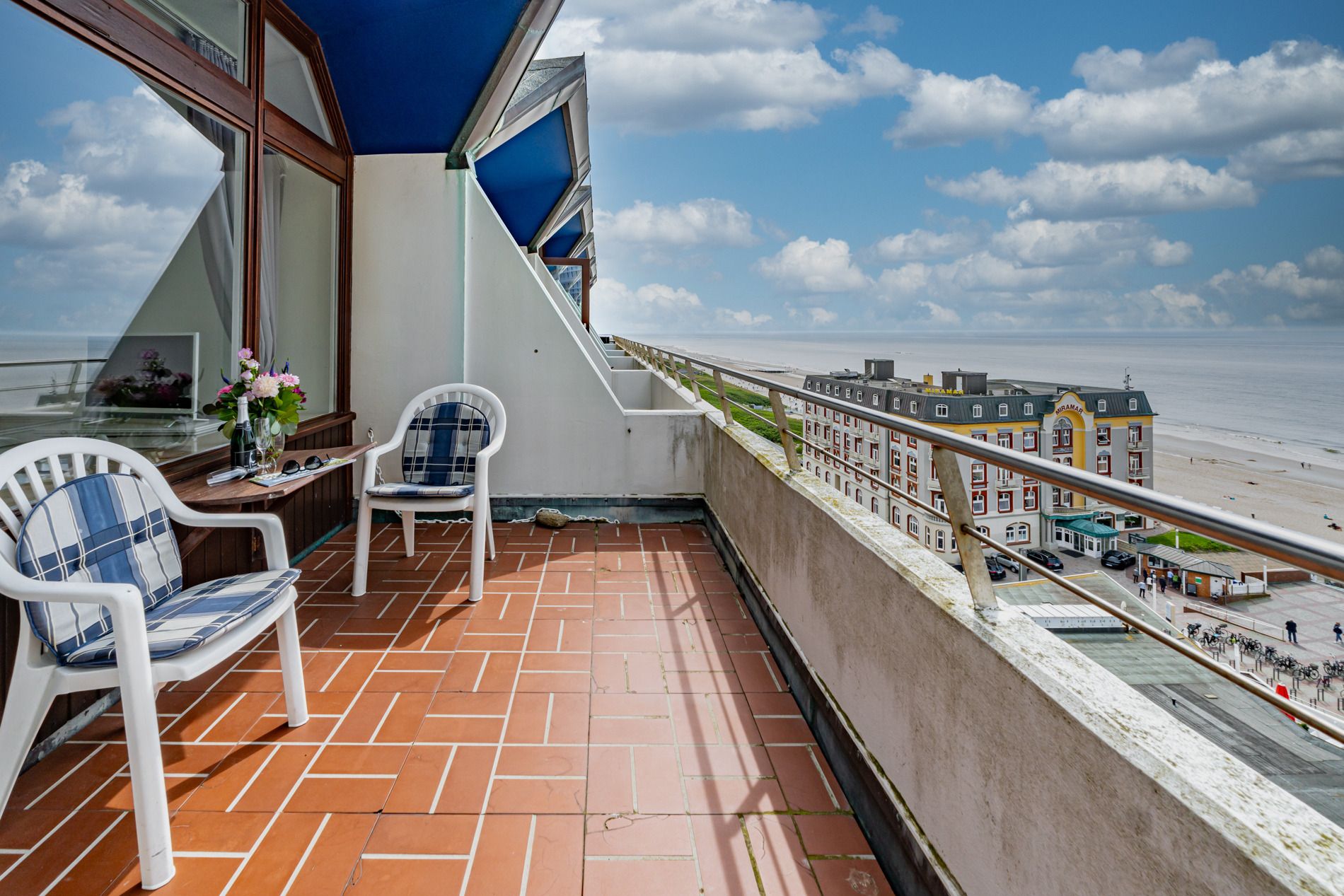 Ein Highlight ist der Westbalkon mit Nachmittagssonne, ausgestattet mit Balkonmöbeln und Auflagen – perfekt, um bei Meeresrauschen zu entspannen und den Sonnenuntergang zu genießen.