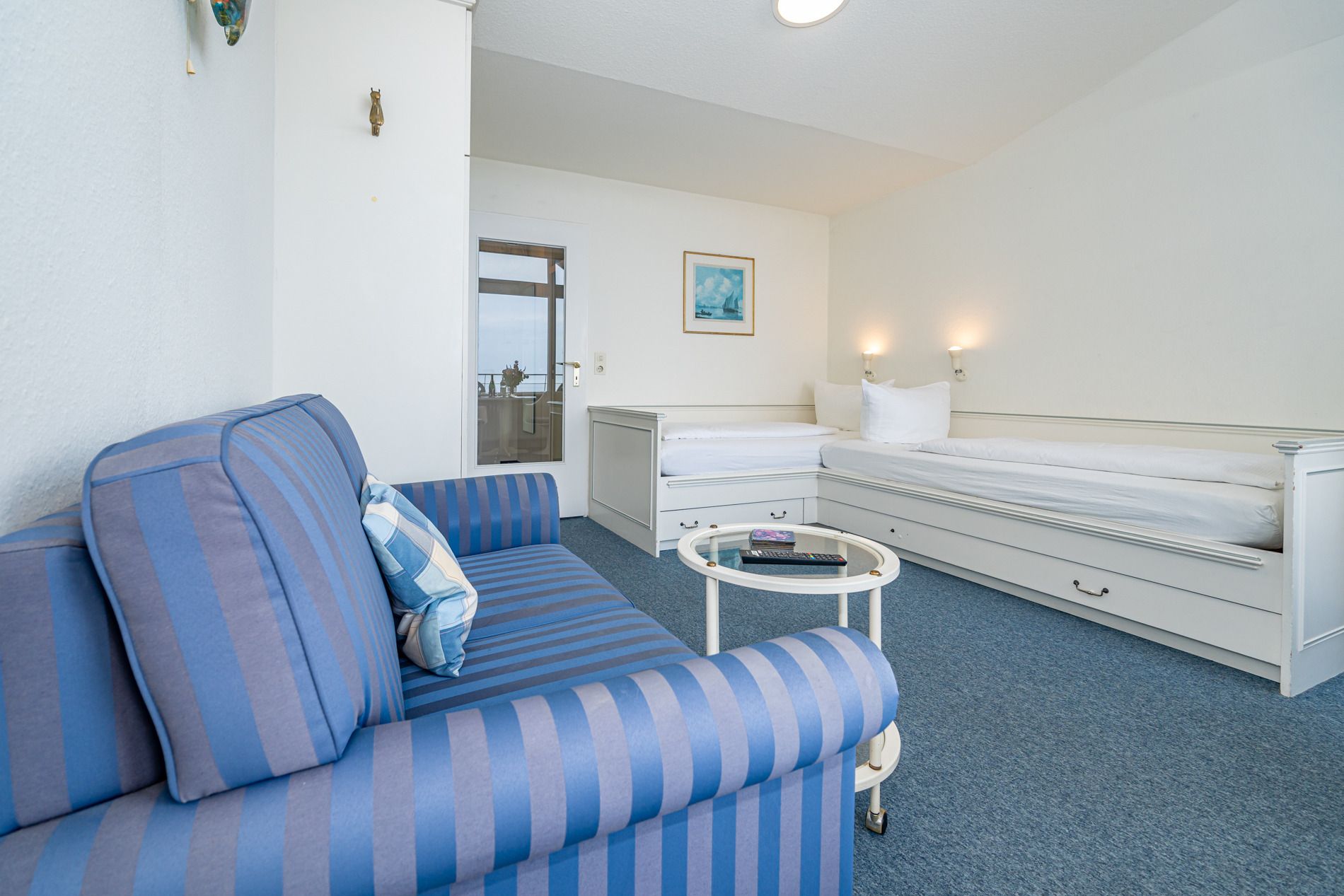 Vom Vorflur mit Garderobe und integrierter Küchenzeile gelangen Sie in den kombinierten Wohn-/Schlafbereich sowie in das Badezimmer. Der Wohnraum ist mit zwei über Eck stehenden Einzelbetten, einem 2-Sitzer-Sofa, einem Essplatz, Kabel-TV und Radio ausgestattet – kompakt, praktisch und gepflegt.