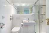 Das sehr moderne und helle Duschbad/WC hat zusätzlich einen Handtuchtrockner und einen Föhn.