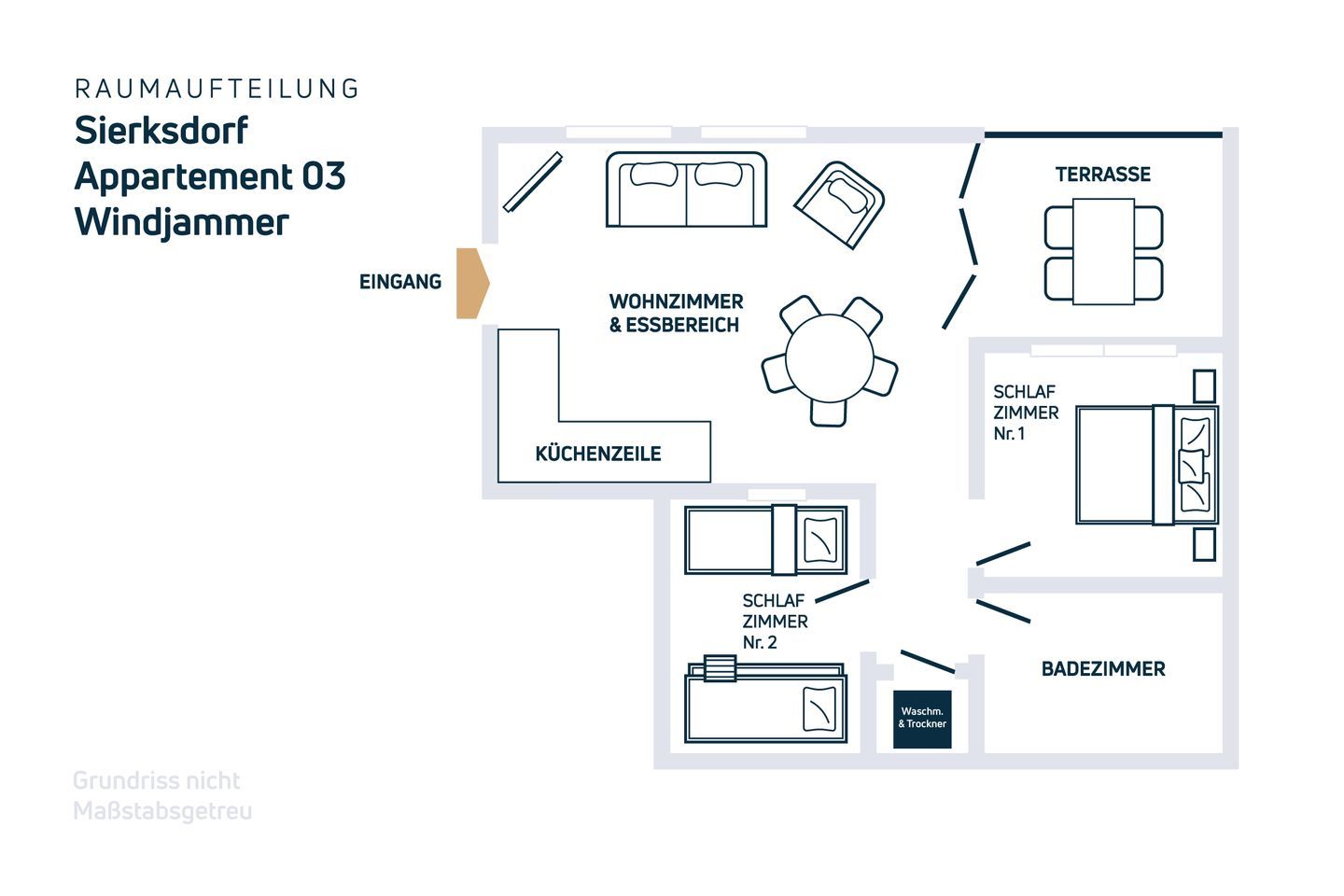 Unsere, nur 50 Meter vom Strand entfernte, 3 Zimmer Ferienunterkunft mit Terrasse, liegt im ruhigen Fischerdörfchen Sierksdorf.