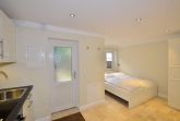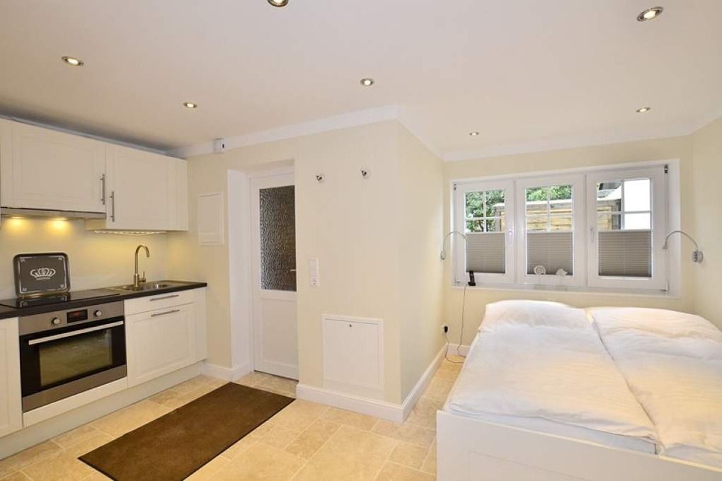 Durch die Eingangstür gelangt man in das neue kombinierte Wohn-Schlafzimmer mit offener Küchenzeile mit Backofen, Induktionskochfeld, Kühlschrank mit 3-Sterne-Gefrierfach, Geschirrspüler, Wasserkocher, Toaster und kleinem Essplatz.
