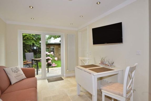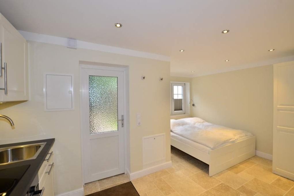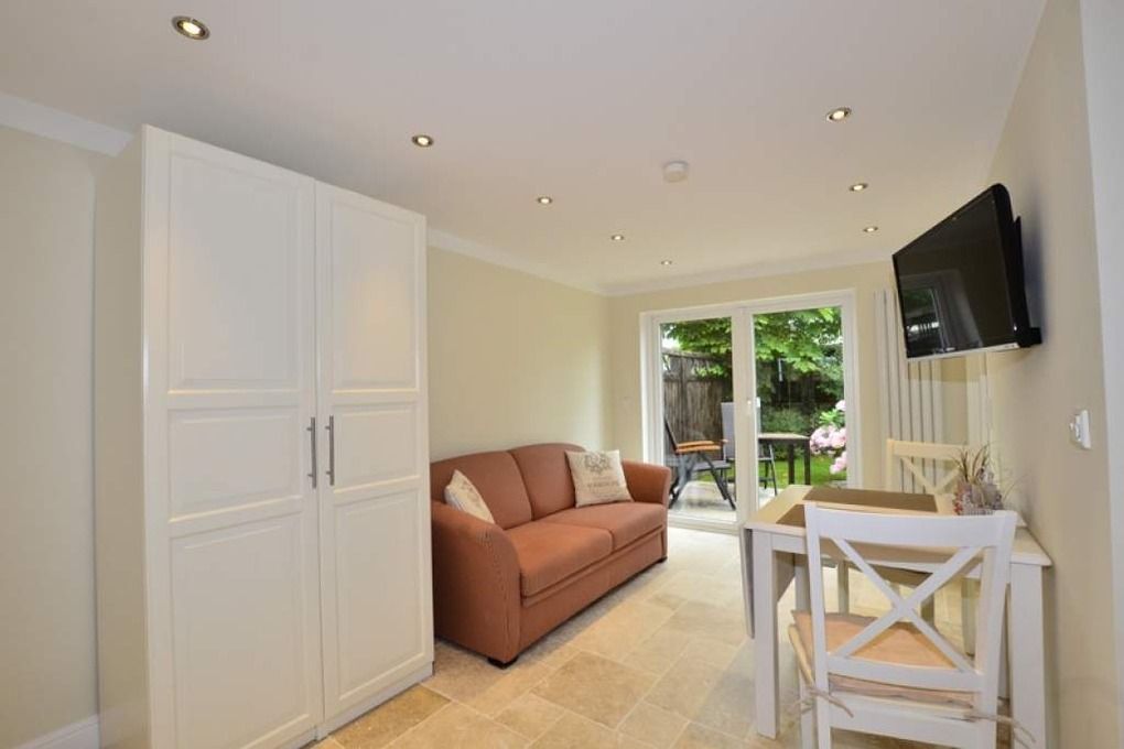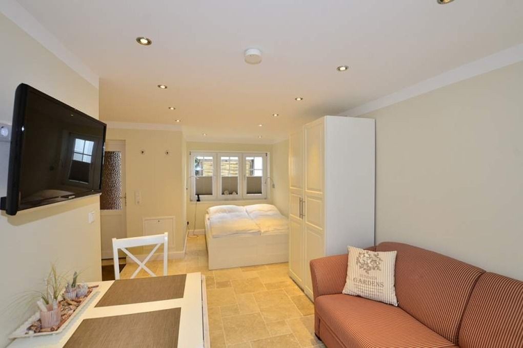 Exklusiv und hochwertig ausgestattete 1-Zimmer-Nichtraucher-Ferienwohnung im Bungalow-Stil, ca. 27 qm, mit möblierter windgeschützter Westterrasse für maximal 2 Personen auf einer Ebene.