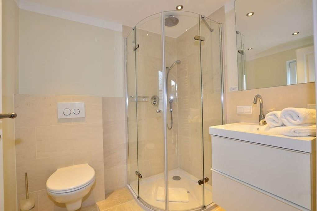 Neues Duschbad mit Waschtisch, WC und Fenster.