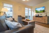 Im komplett mit modernem Designerboden in Holzoptik ausgelegten Wohnzimmer (mit Austritt zur Terrasse) stehen eine Ledercouch, 2 Sessel, 1 großer Flachbild-Fernseher mit Kabelanschluss, DVD-Player, Stereoanlage und ein gemütlicher Essplatz mit offener, neuer Küche zu Ihrer Verfügung.