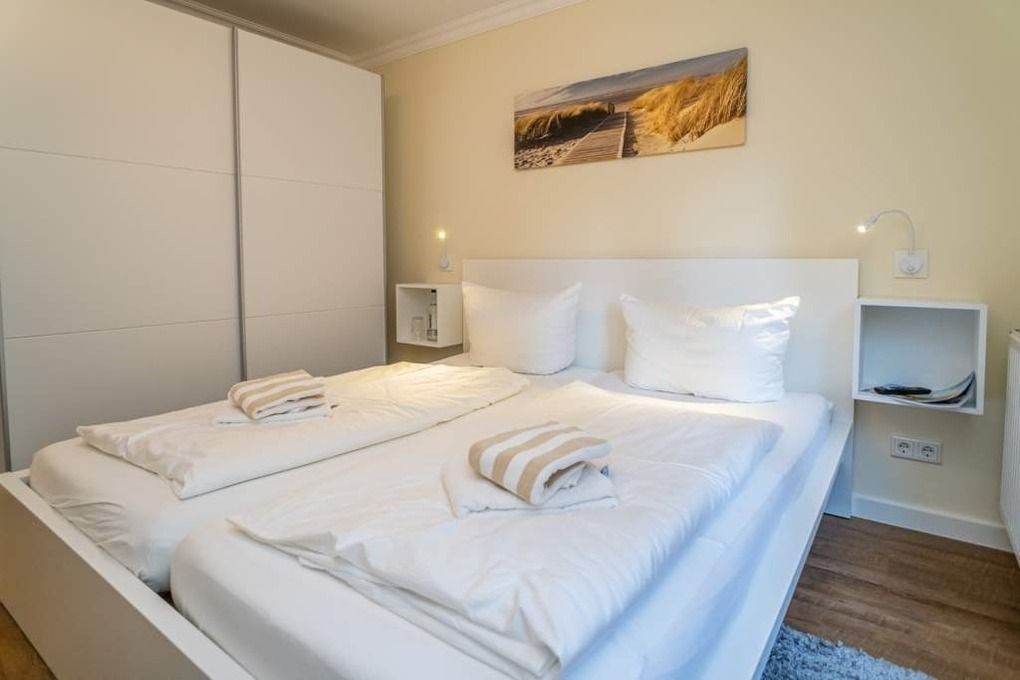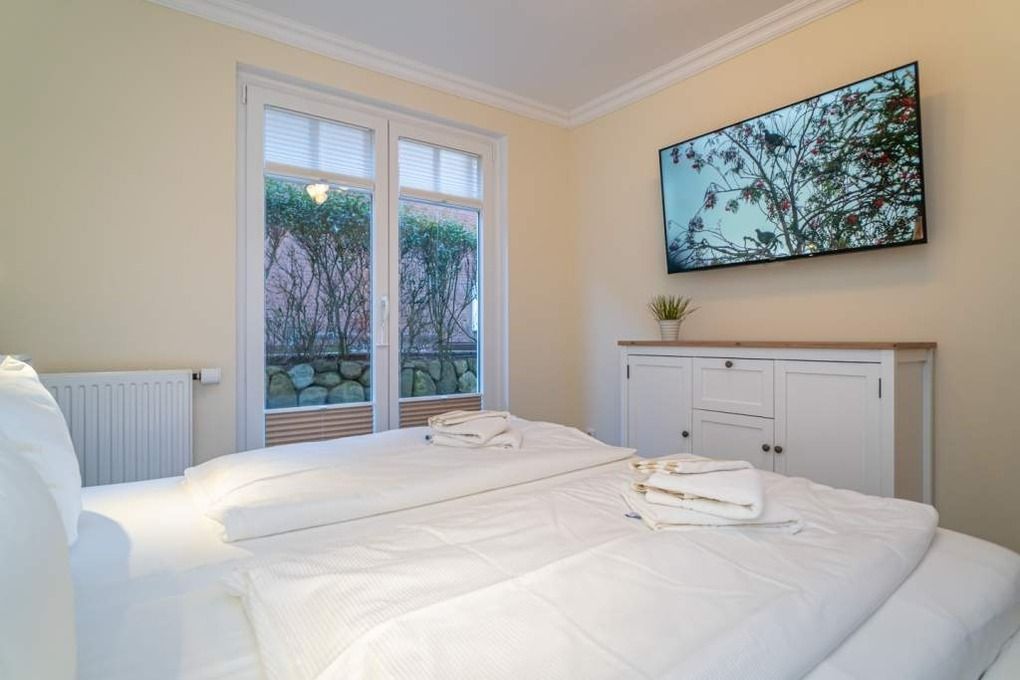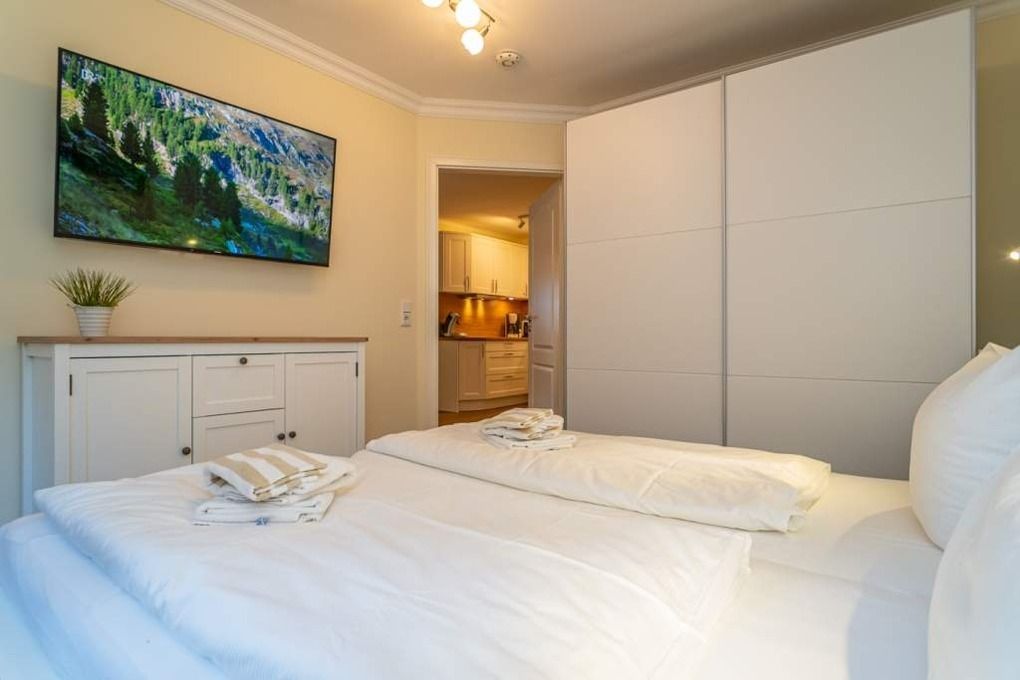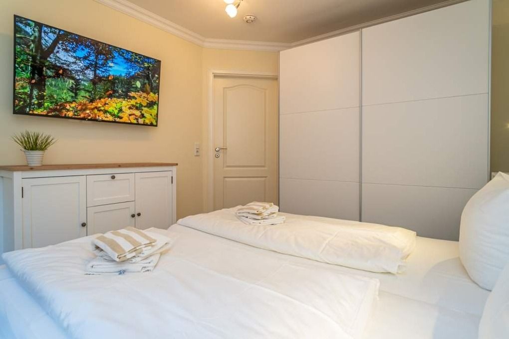 Im großen Schlafzimmer finden Sie ein freistehendes Doppelbett mit guten Einzelmatratzen (Liegefläche jeweils 90 x 200 cm), einen großzügigen Schwebetürenschrank, 1 weiteren Flachbild-TV, Kommoden sowie Nachttische vor.