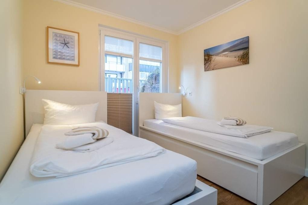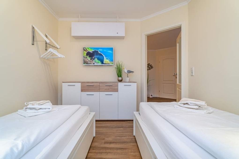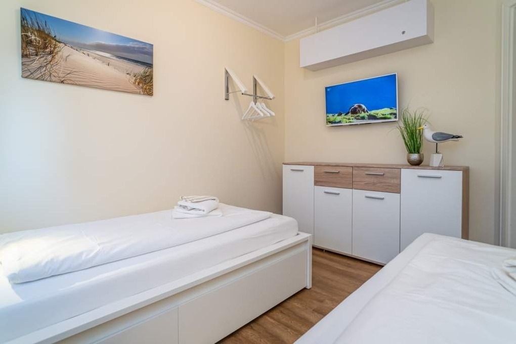 Das zweite Schlafzimmer ist mit zwei Einzelbetten (Liegefläche jeweils 90 x 200 cm) mit großen Schubladen (Gepäck praktisch verstaut), 1 weiteren Flachbild-Fernseher (Wandmontage) mit Kabelanschluss, sowie Kommode ausgestattet. Beide Schlafräume lassen sich mit Dim-Out-Plissees gut abdunkeln.