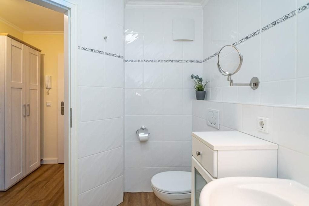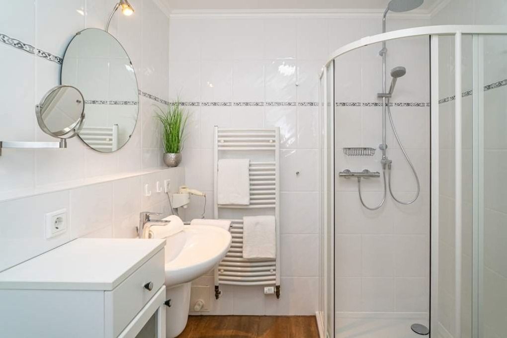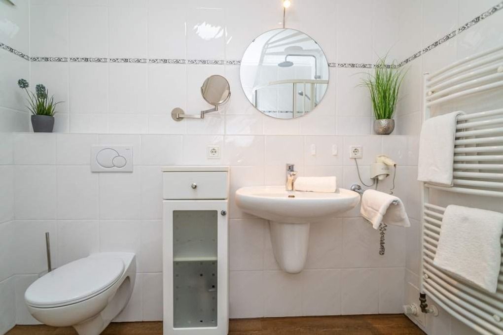 Im modernen Badezimmer mit Fußbodenheizung, befinden sich eine Dusche mit extraflachem Einstieg, ein Waschtisch, ein Handtuchtrockner, Fön, Kosmetikspiegel und WC.