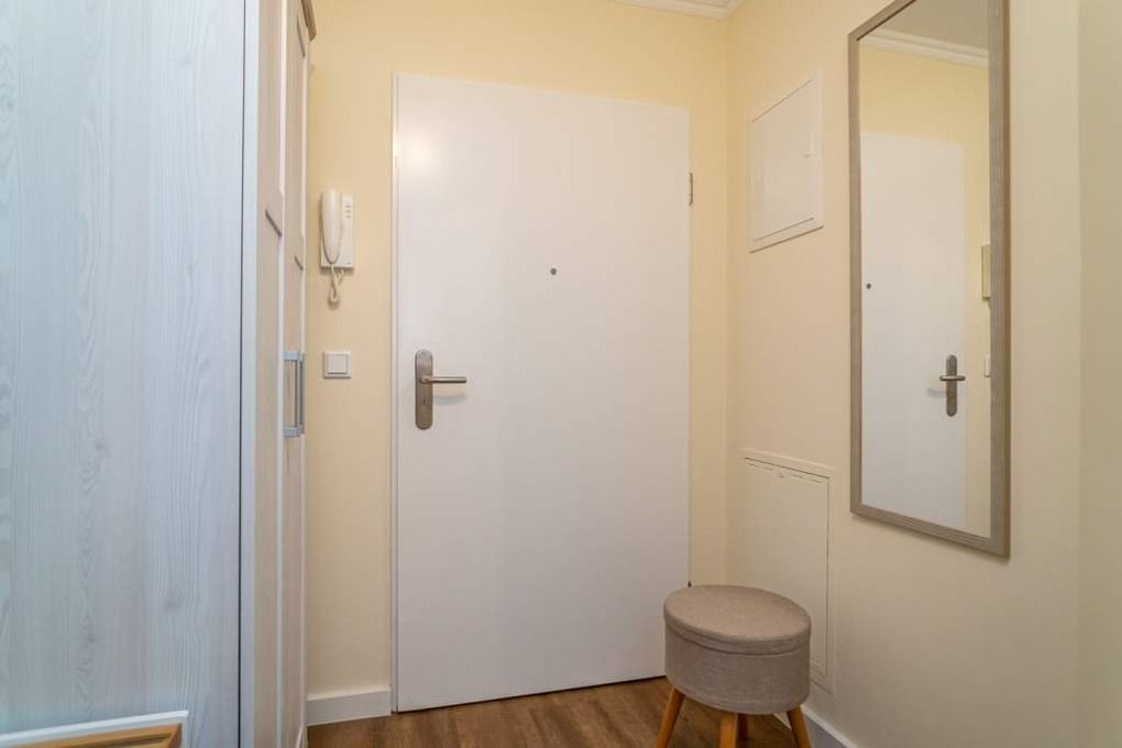 Vom Eingangsbereich mit Garderobe gelangt man in das Wohnzimmer mit offener Küche, das Duschbad/WC, das Doppelschlafzimmer und das Zweibettzimmer.