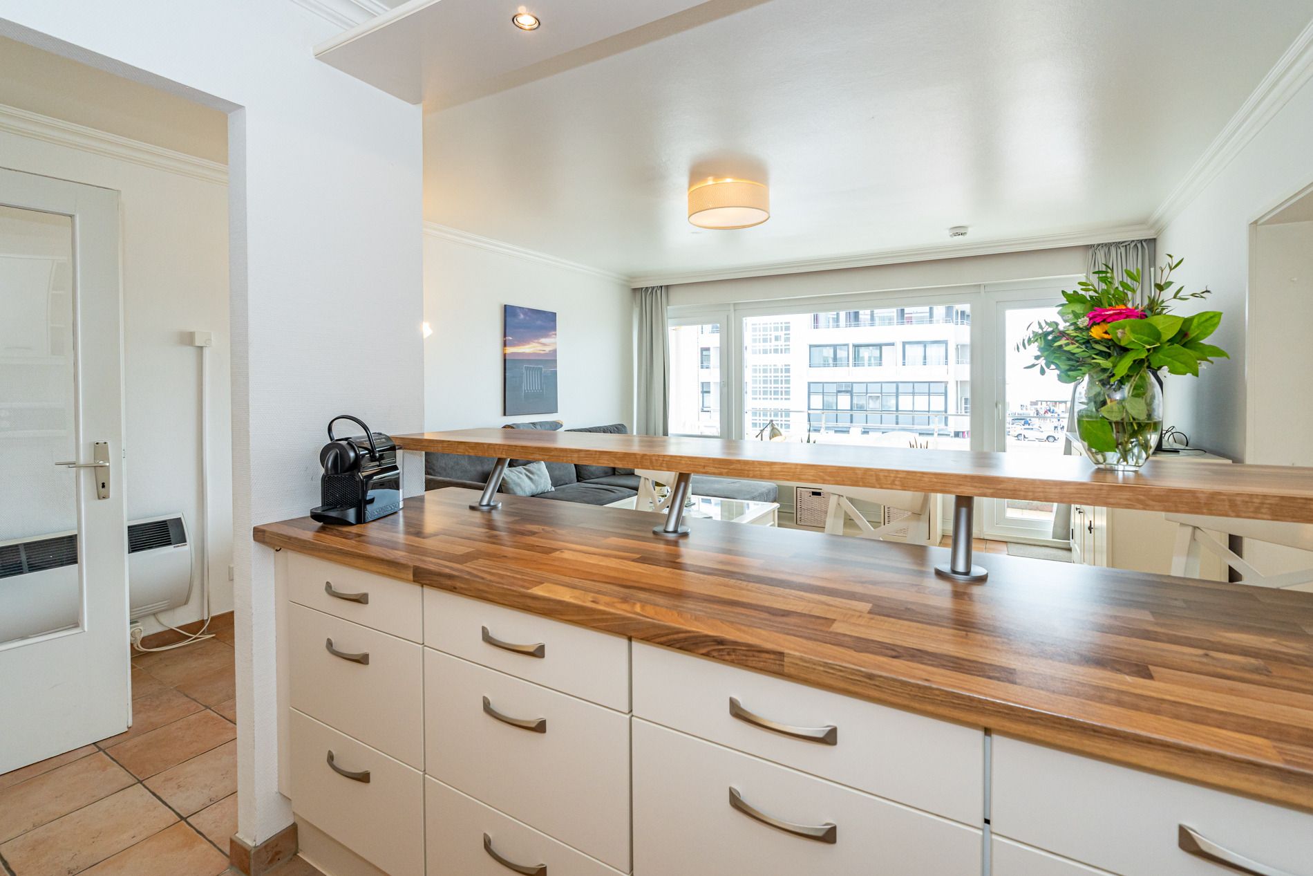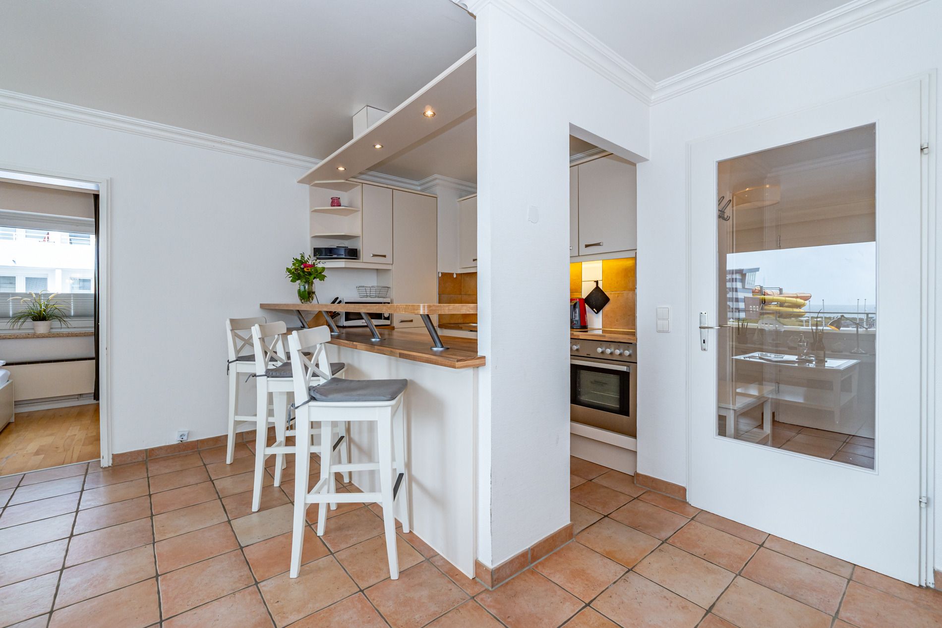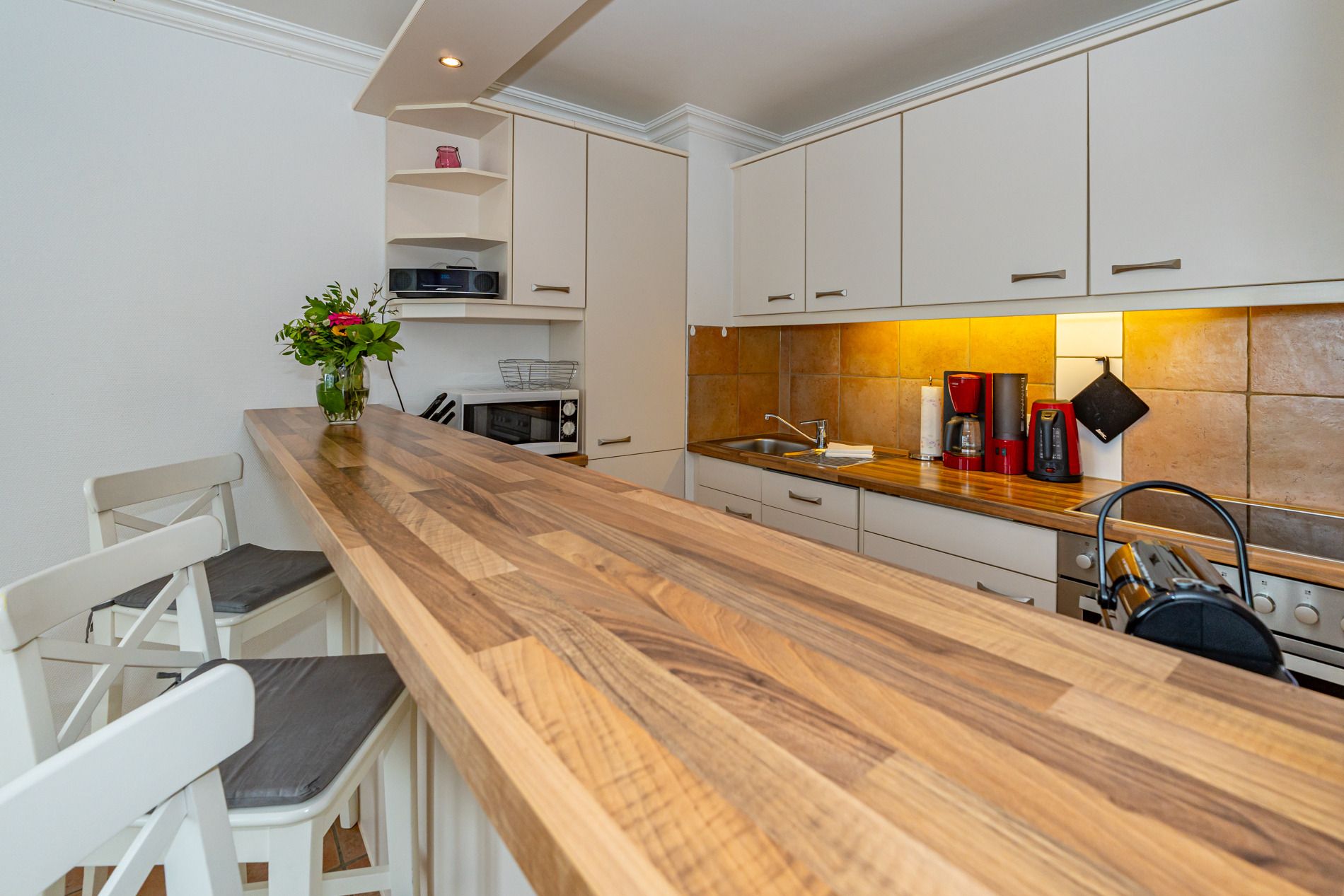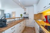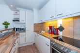 Die zum Wohnraum hin offene, vollausgestattete Küche ist mit Geschirrspüler, Mikrowelle, Backofen, Ceranfeld (mit 4 Kochfeldern), Nespresso-Maschine und Kühlschrank mit Gefrierfach ausgestattet. Kaffeemaschine, Wasserkocher und Toaster gehören zur Grundausstattung.