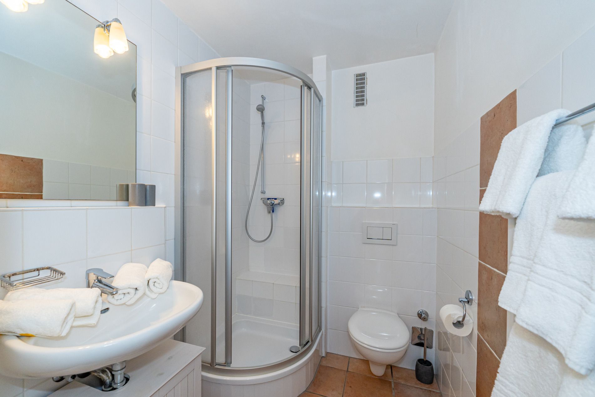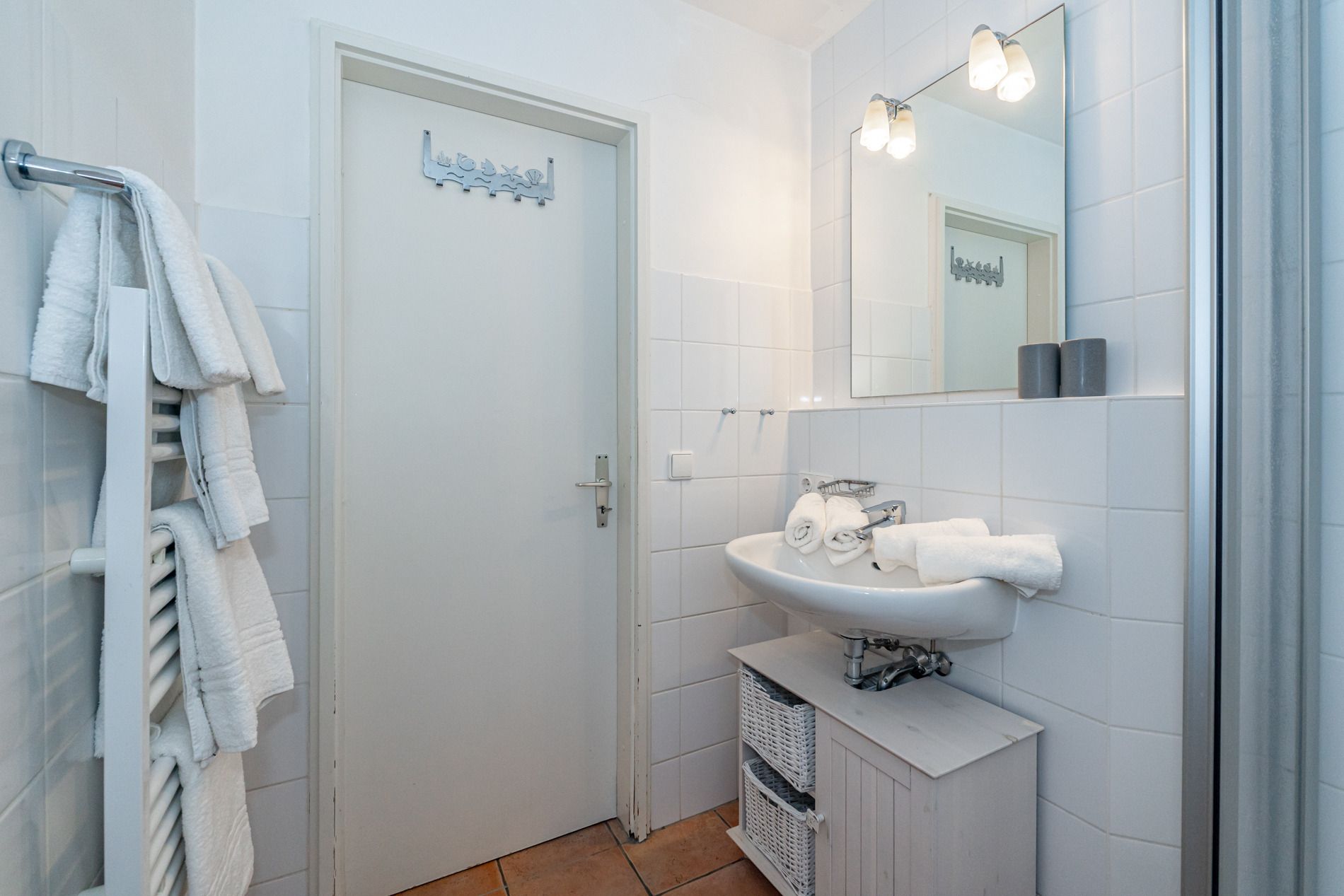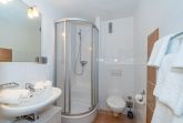 Das Badezimmer verfügt über Dusche, WC, Waschtisch, Handtuchtrockner, Fön und Personenwaage. Waschmaschine und Trockner befinden sich zur Gemeinschaftsnutzung gegen Münzeinwurf in der Waschküche des Hauses.