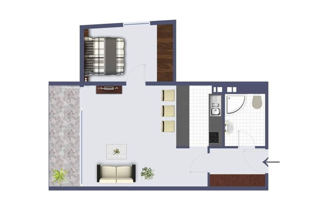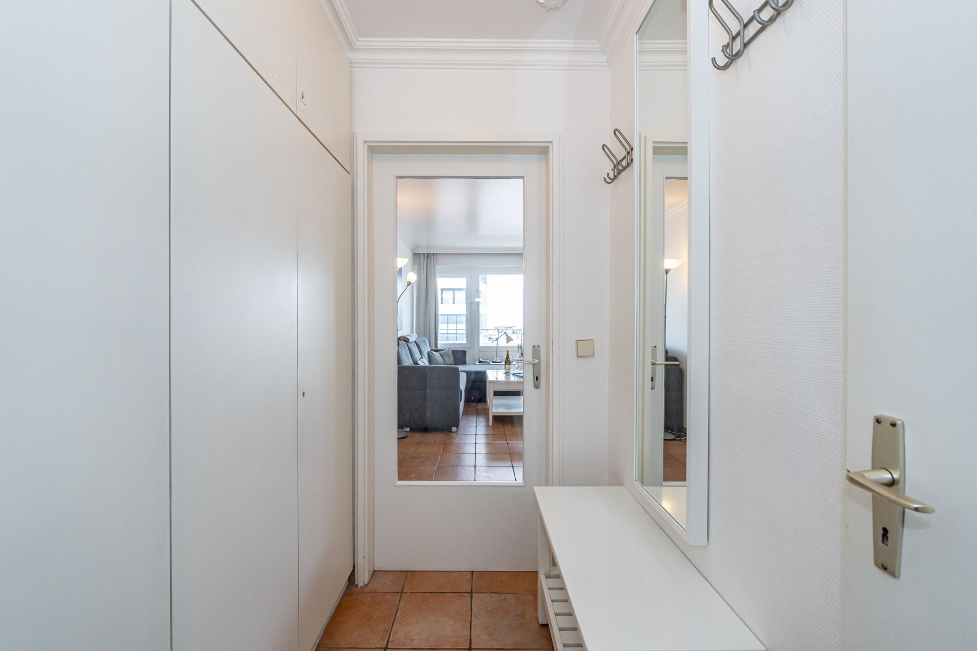 Vom Vorflur mit Garderobe gelangt man das Wohnzimmer (mit Austritt zur Loggia), das Schlafzimmer und in das Duschbad/WC.