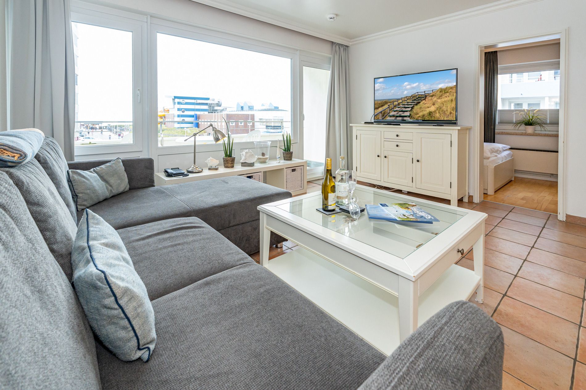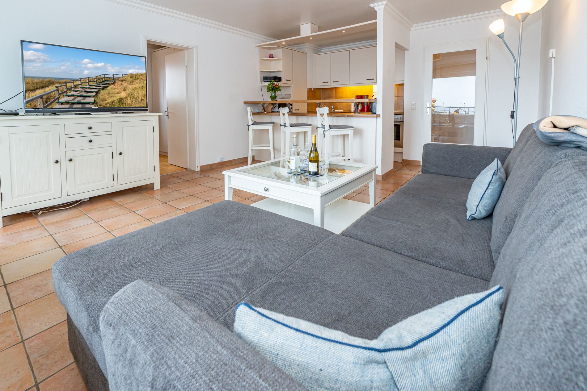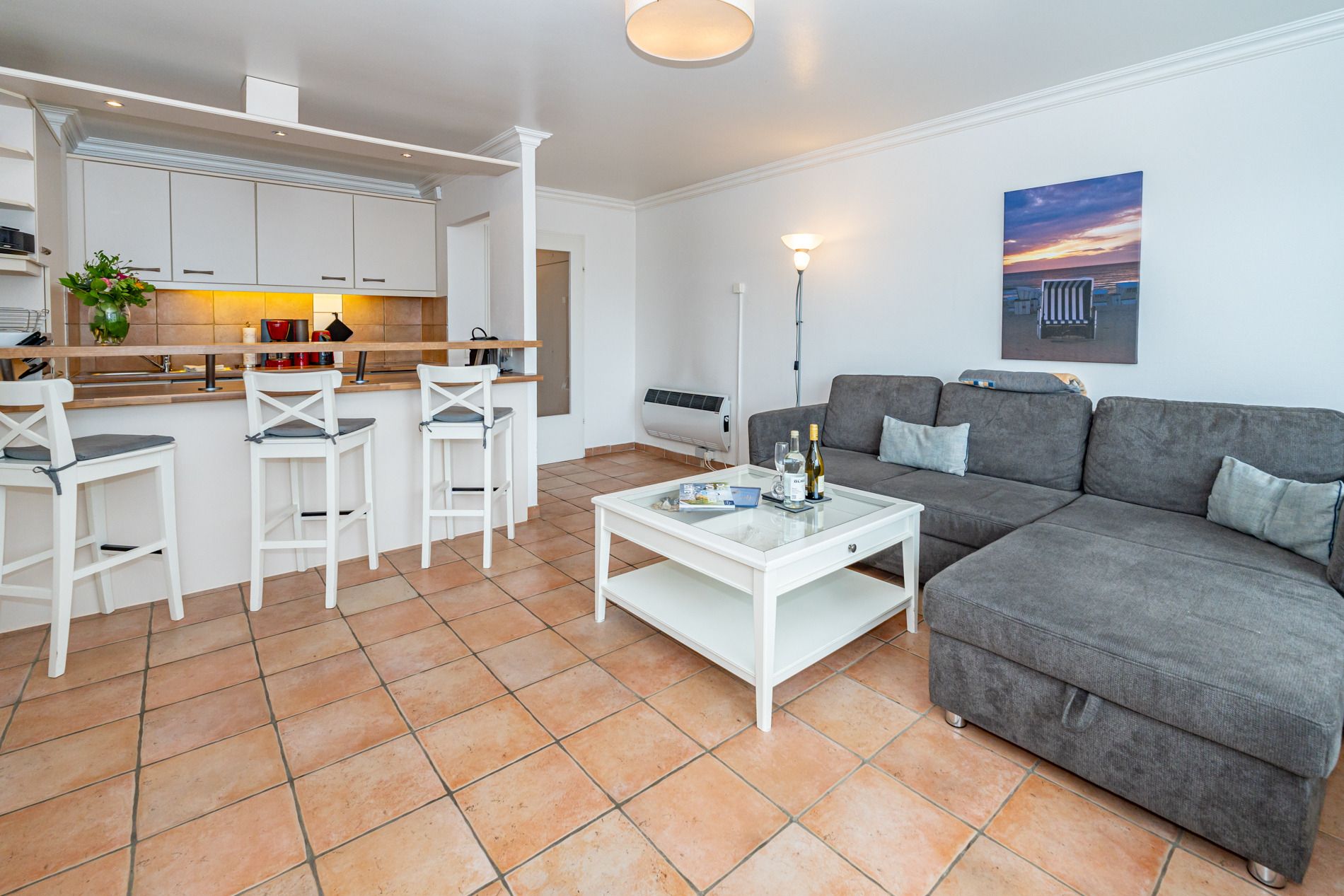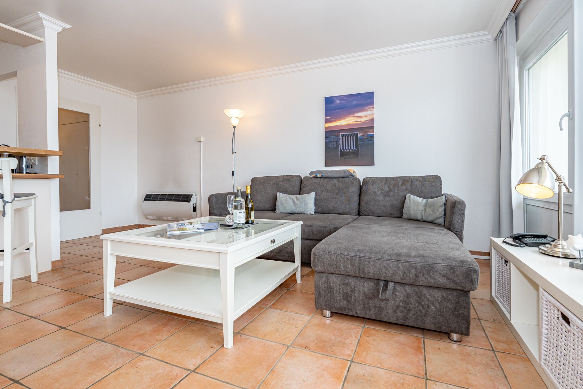 Der Wohnraum verfügt über eine Sitzgarnitur, Fußhocker, einen Essplatz am Küchentresen, ein Flachbild-TV, Radio/CD.