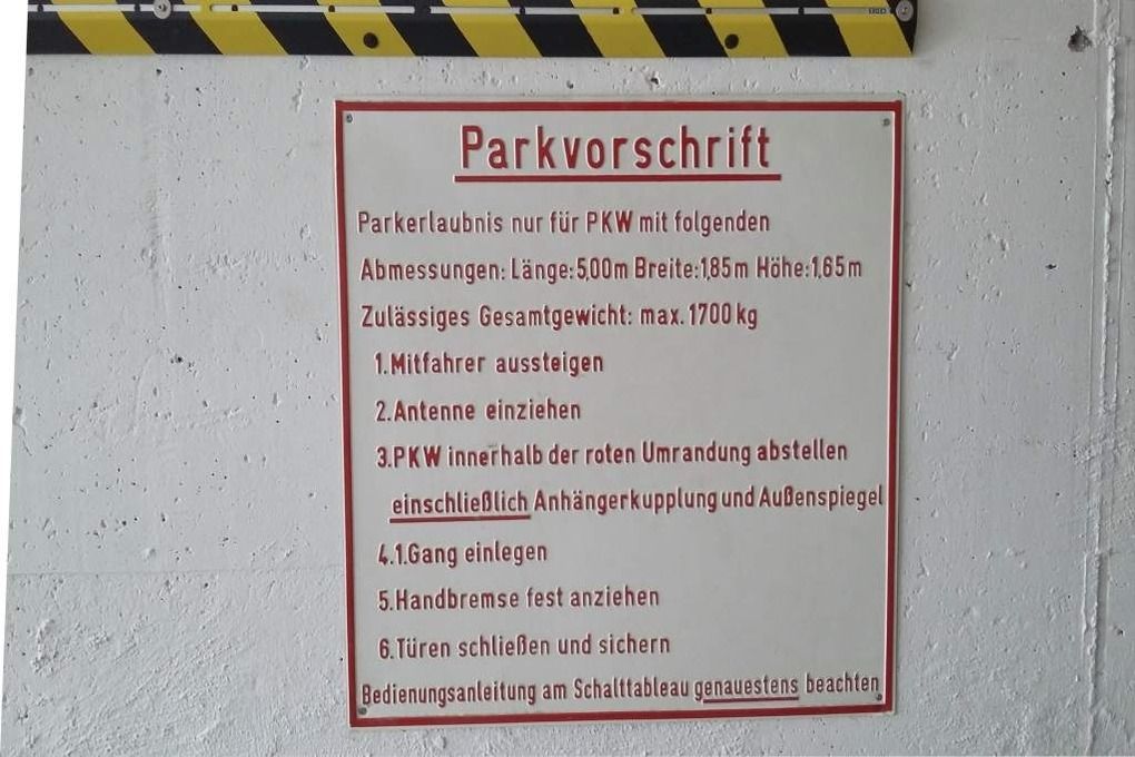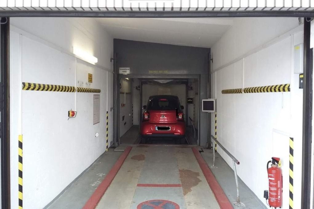 Für Klein- bis Mittelklassewagen steht ein kostenfreier PKW-Stellplatz in der Tiefgarage zur Verfügung. Der PKW darf folgende Maße nicht überschreiten: Länge 5,00 m (einschl. Anhängerkupplung), Höhe: 1,65 m (einschl. Dachaufbauten u. Antenne), Breite: 1,85 m (einschl. Außenspiegel), Gewicht 1.700 kg. Die Parkspur bietet nur Platz für Reifen bis 45 cm Breite. Der PKW wird zum Einparken in einen Autoaufzug abgestellt.