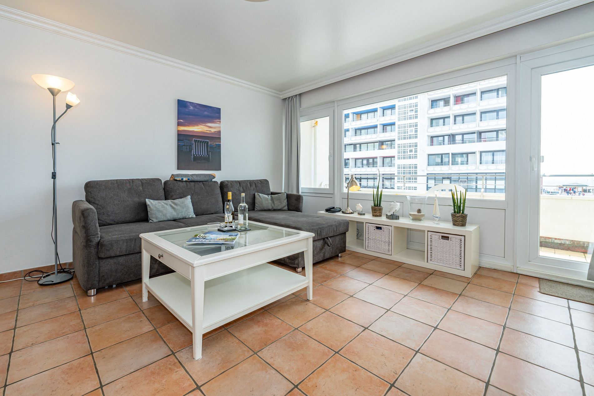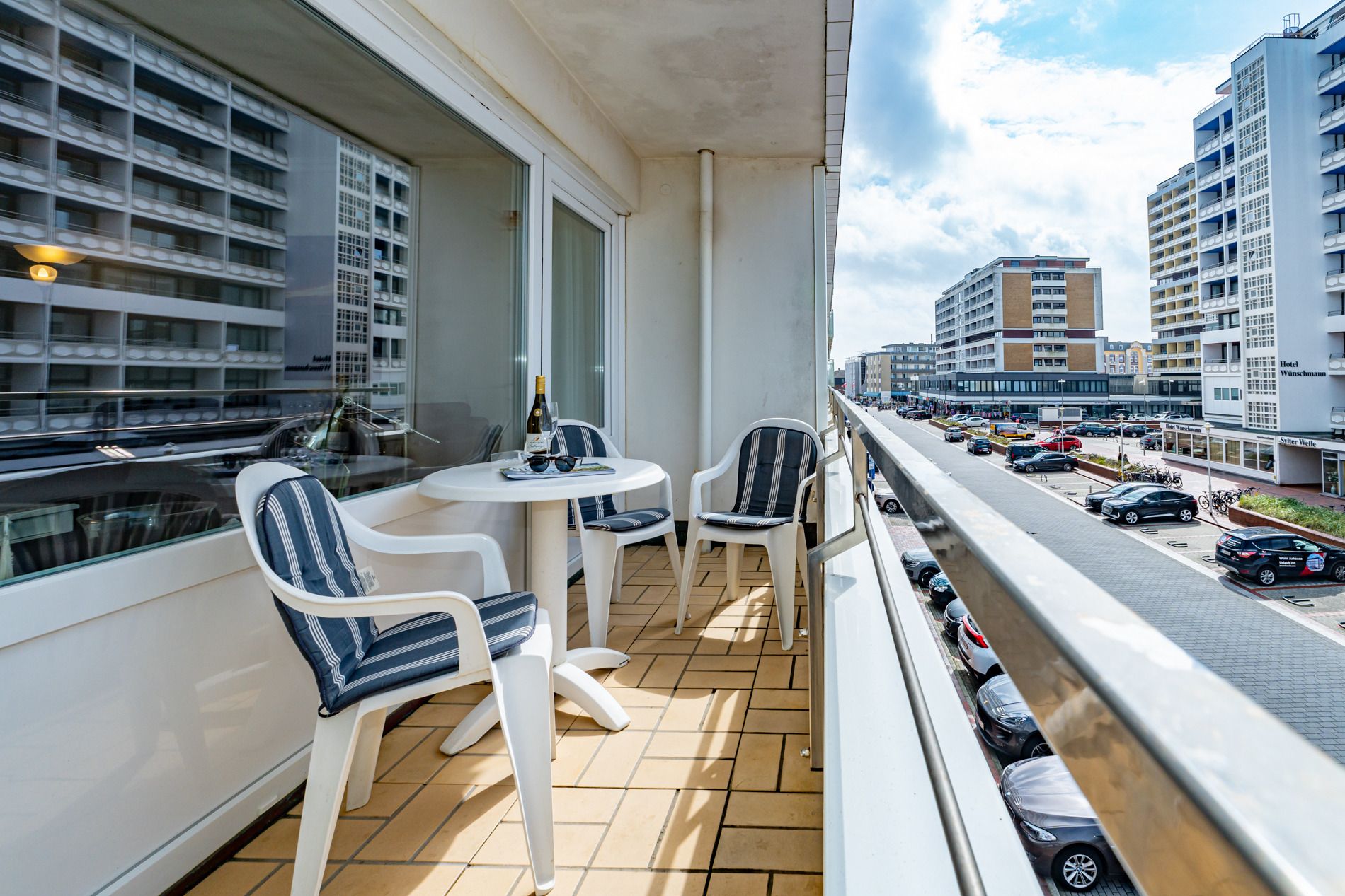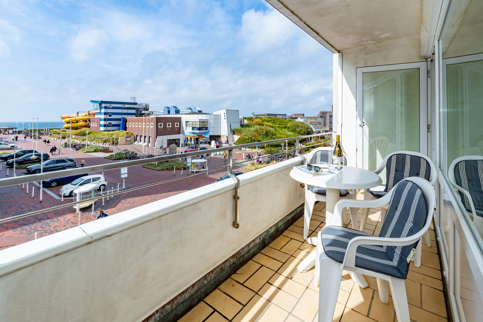 Gut ausgestattete 2-Zimmer-Nichtraucher-Ferienwohnung, ca. 41 qm in der 2. Etage mit Meerblick und Westbalkon (Nachmittagssonne mit Balkonmöbeln und Auflagen) für 2 Personen.