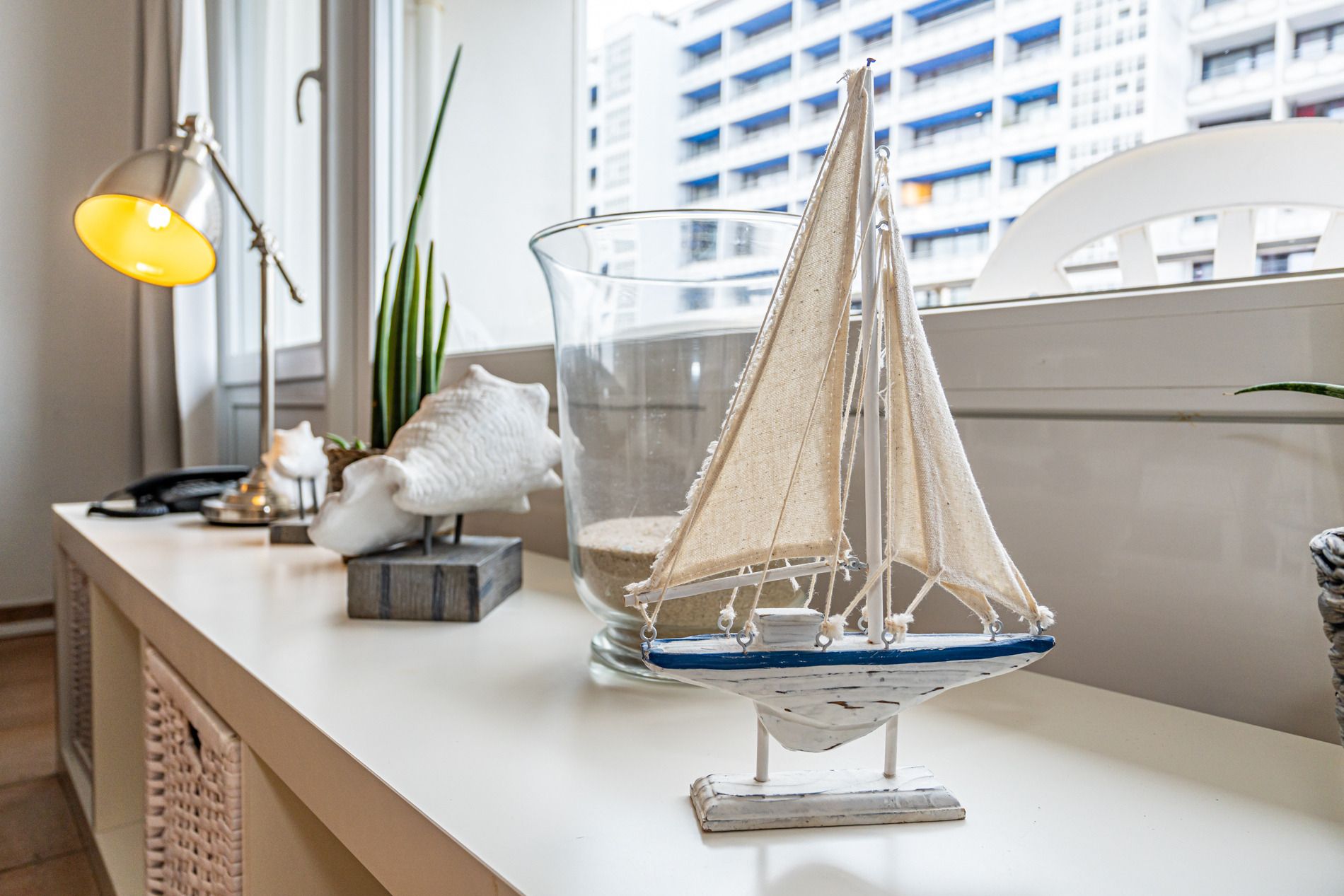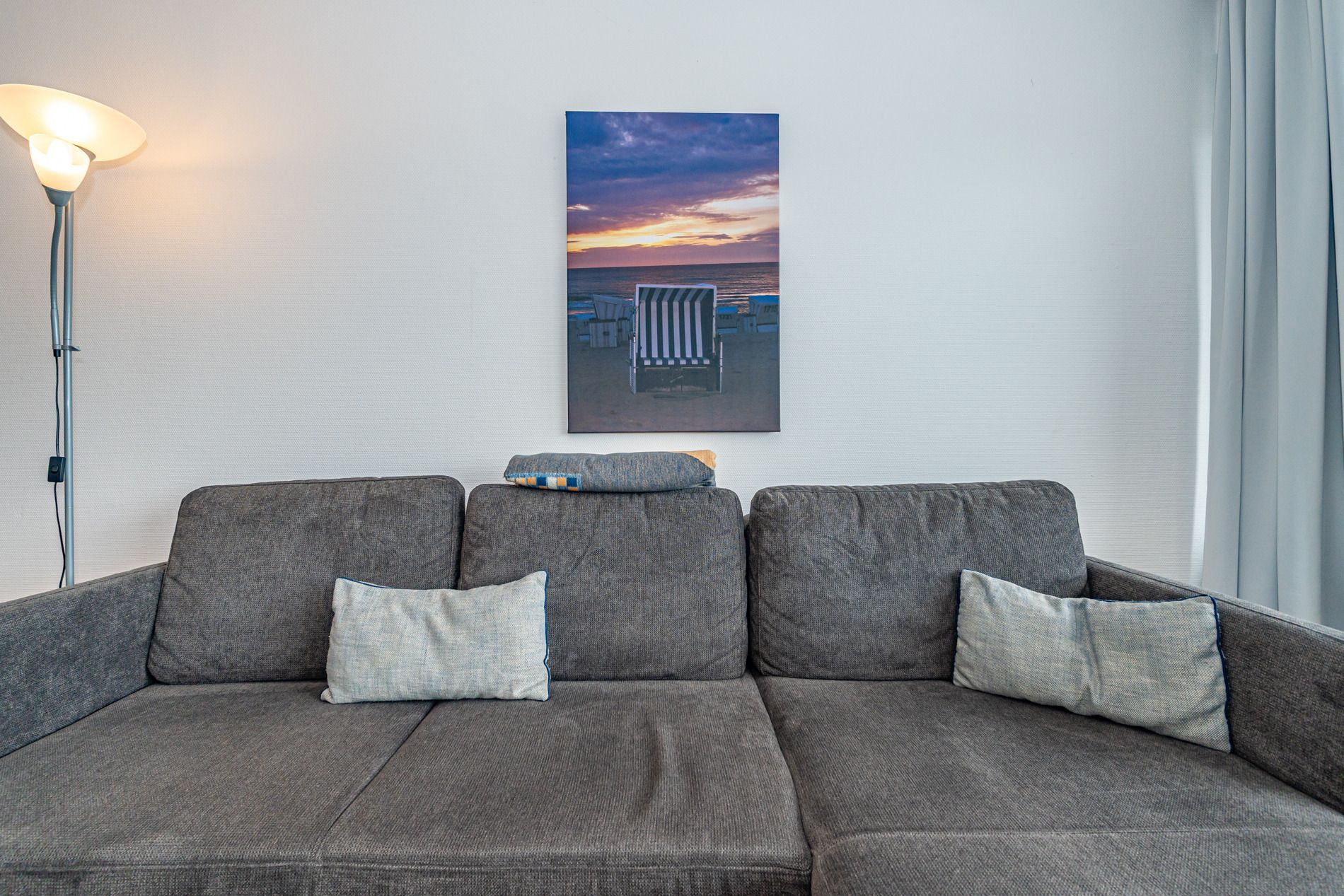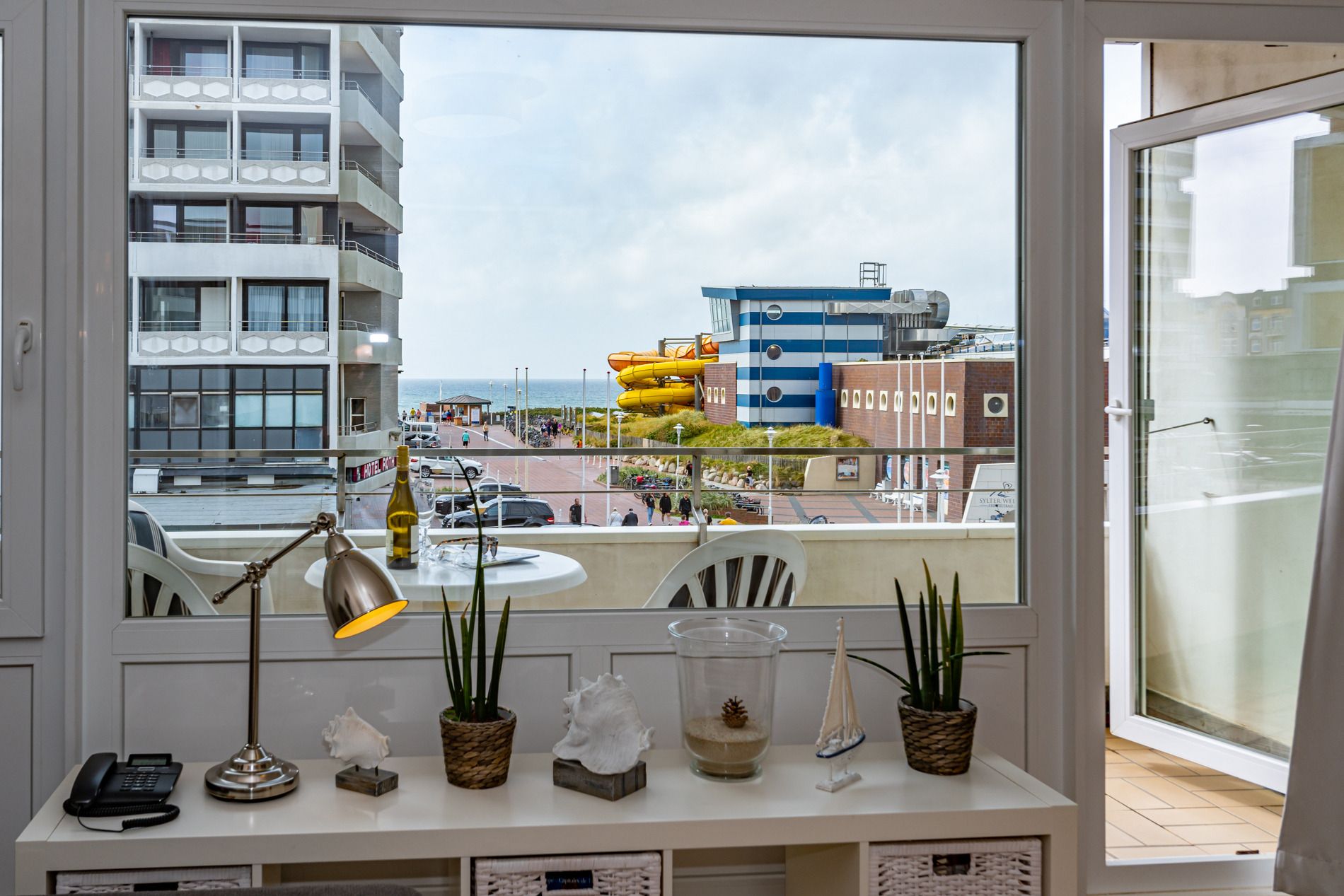 Gut ausgestattete 2-Zimmer-Nichtraucher-Ferienwohnung, ca. 41 qm in der 2. Etage mit Meerblick und Westbalkon (Nachmittagssonne mit Balkonmöbeln und Auflagen) für 2 Personen.