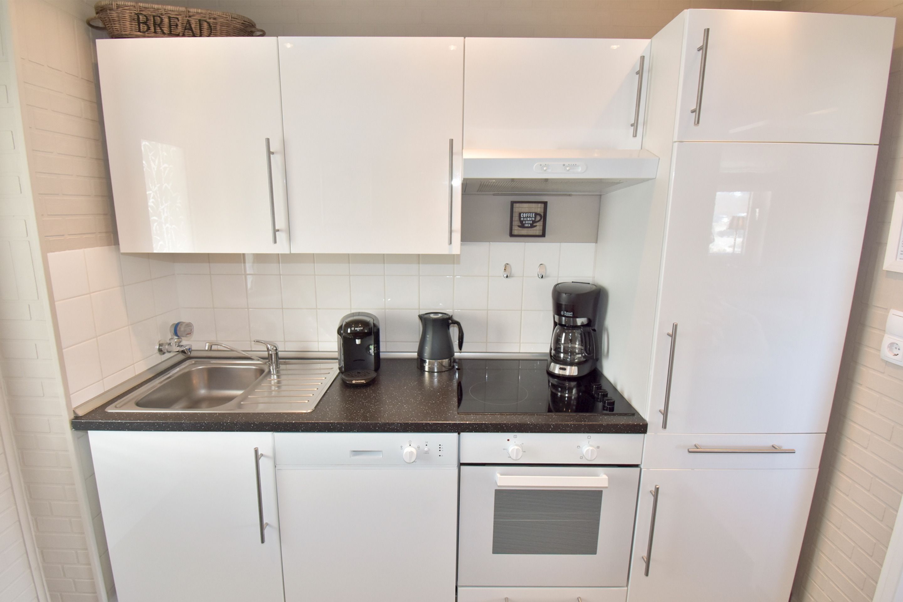 Die neue, gut ausgestattete Küchenzeile hat einen Geschirrspüler, ein 4-Platten-Ceranfeld mit Backofen und einen Kühlschrank mit 3-Sterne-Gefrierfach.