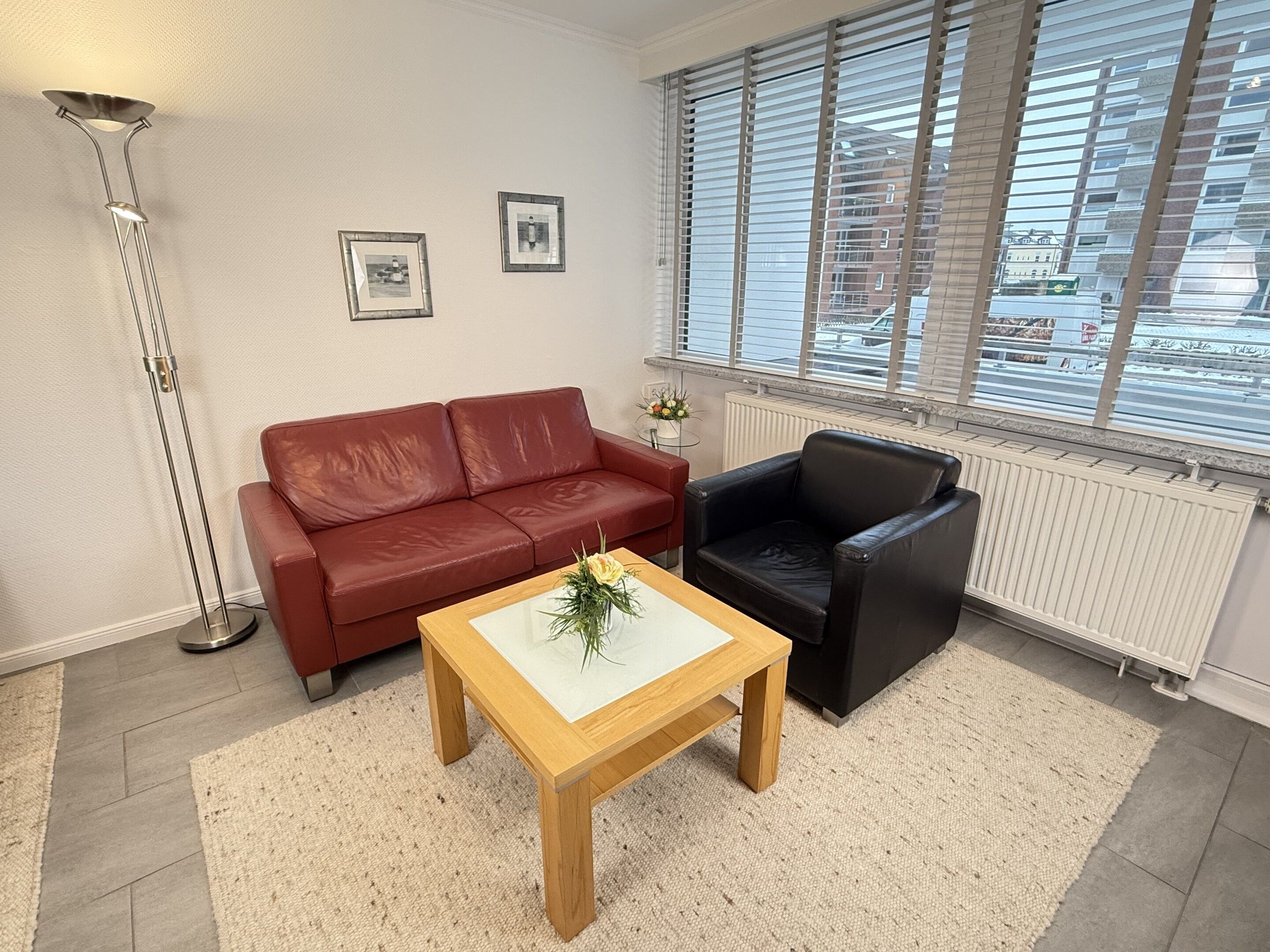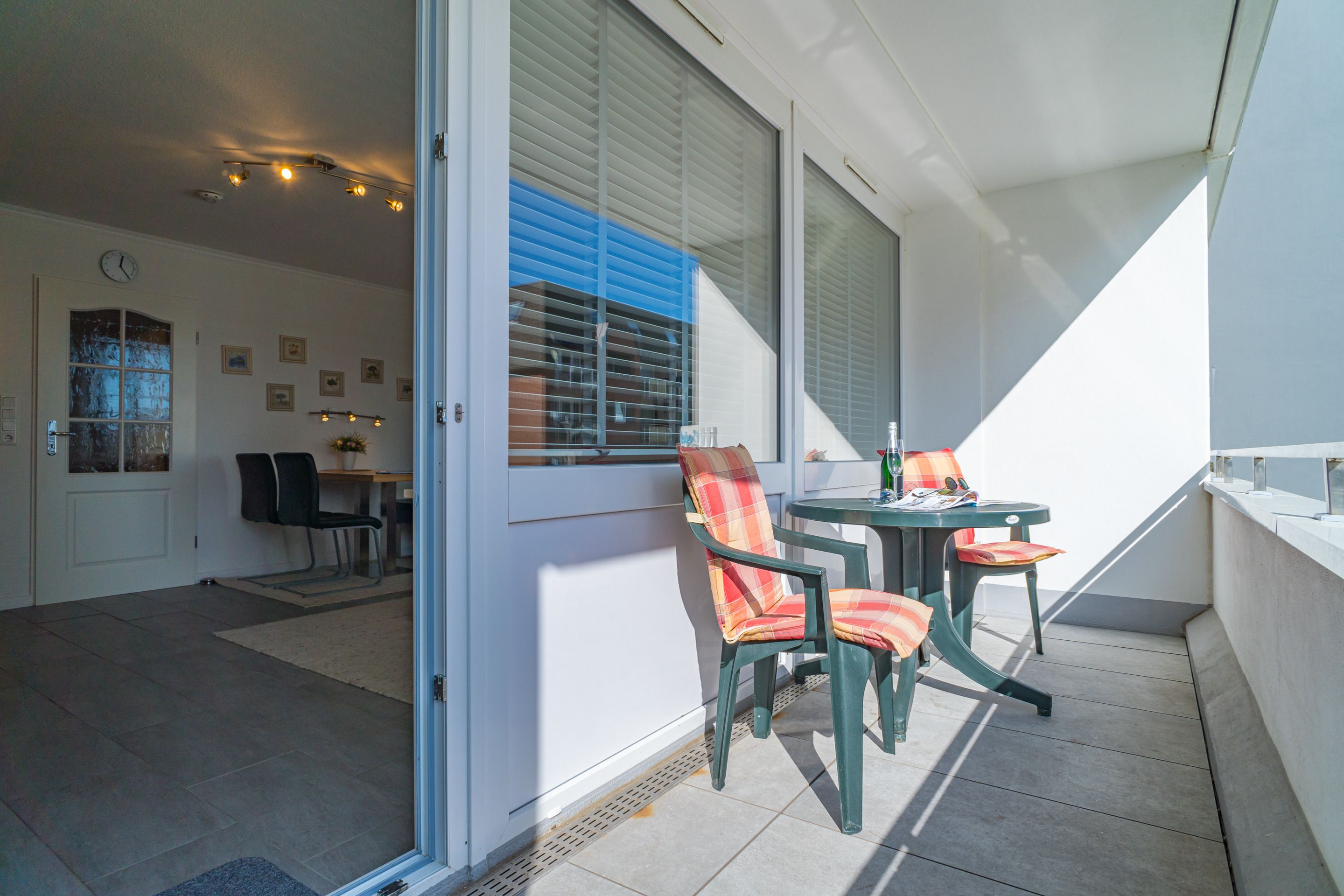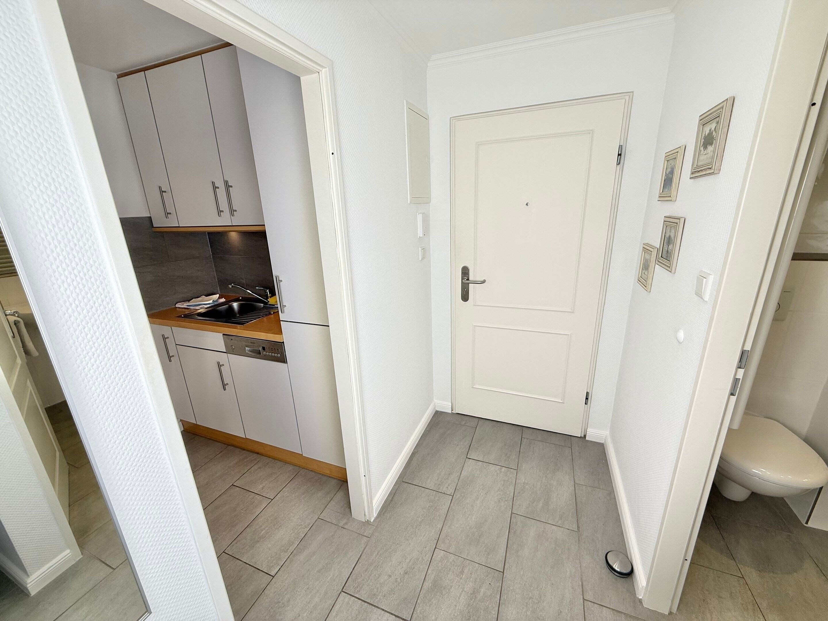 Besonders komfortable, mit großformatigen, schönen Fliesen ausgelegte 1-Zimmer-Nichtraucher-Ferienwohnung (ca. 36 qm) im Parterre zur Landseite mit Ostloggia (Morgensonne, mit Balkonmöbeln und Auflagen) für max. 2 Personen.