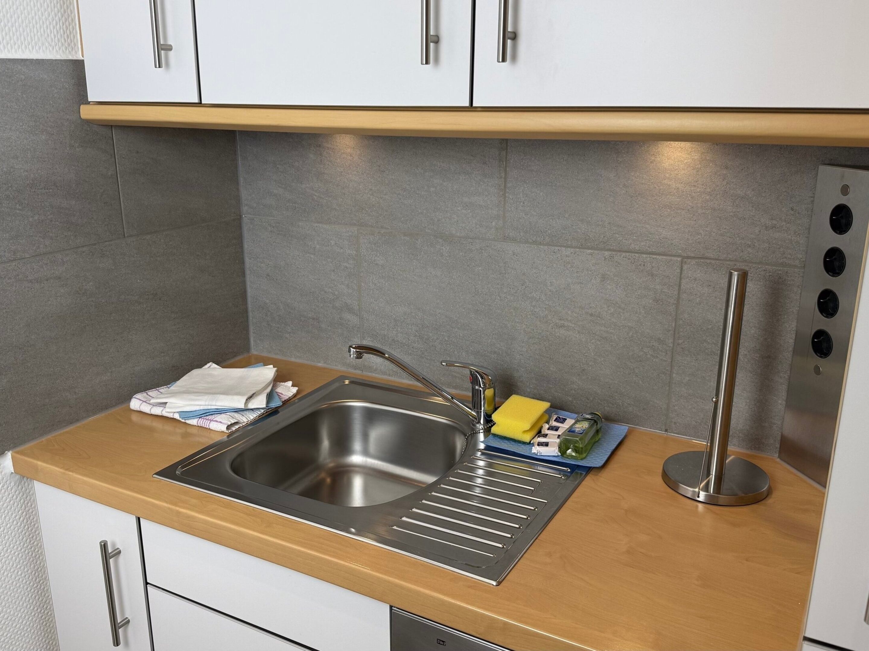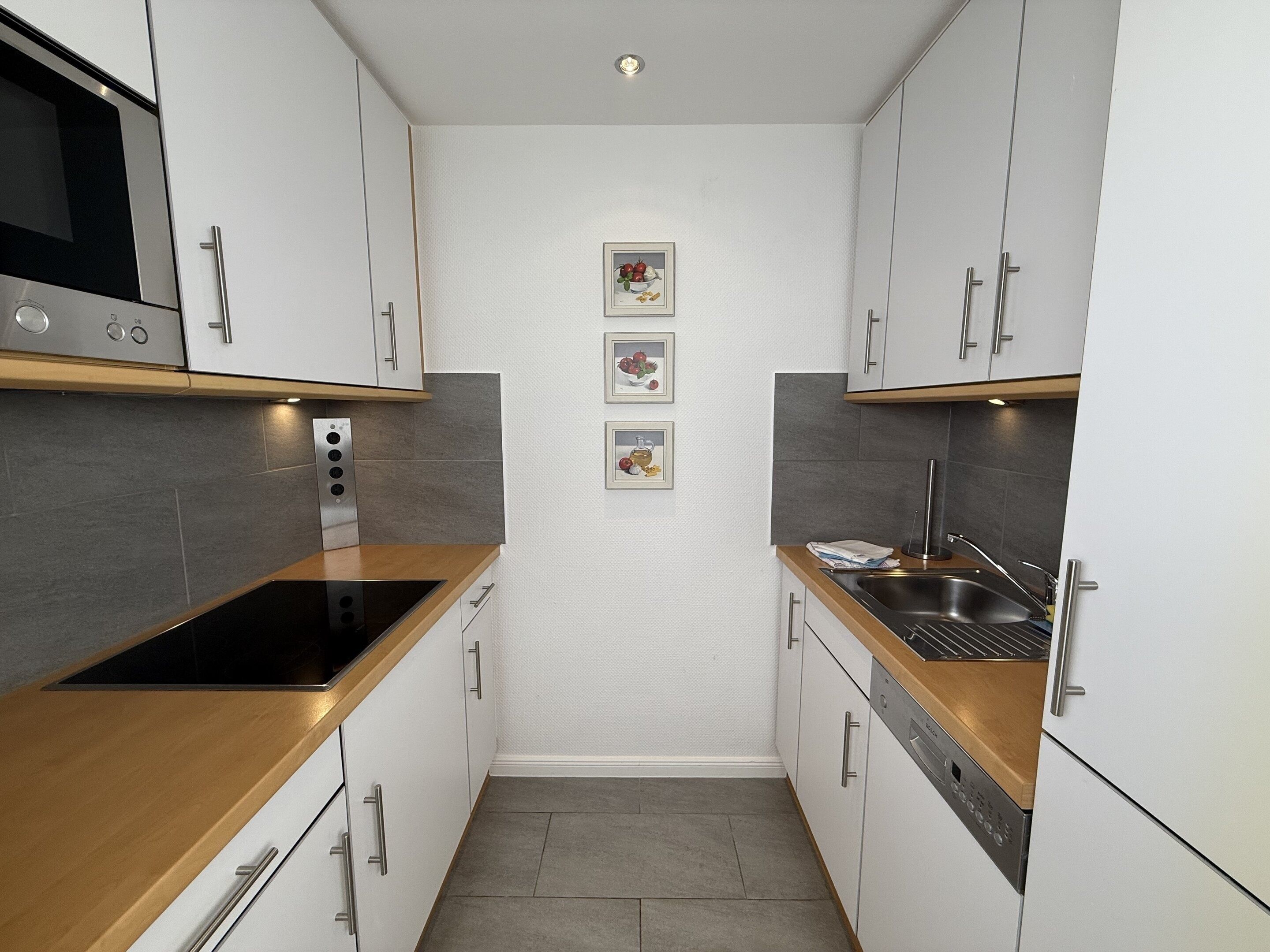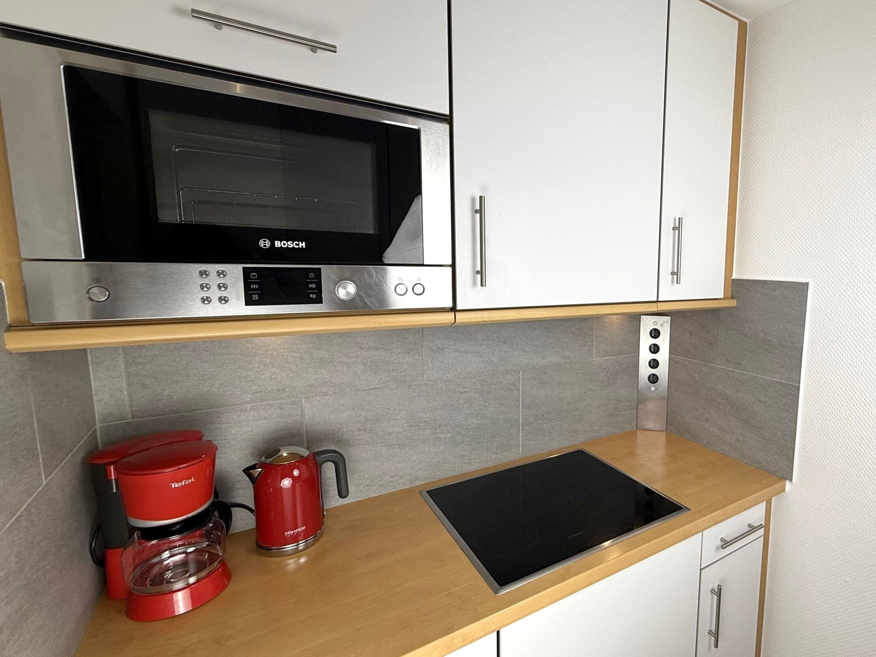 Die separate Küche hat einen Geschirrspüler, eine Mikrowelle (mit Grillfunktion), ein Cerankochfeld und einen Kühlschrank mit 3*-Gefrierfach. Kaffeemaschine, Wasserkocher und Toaster gehören zur Grundausstattung.