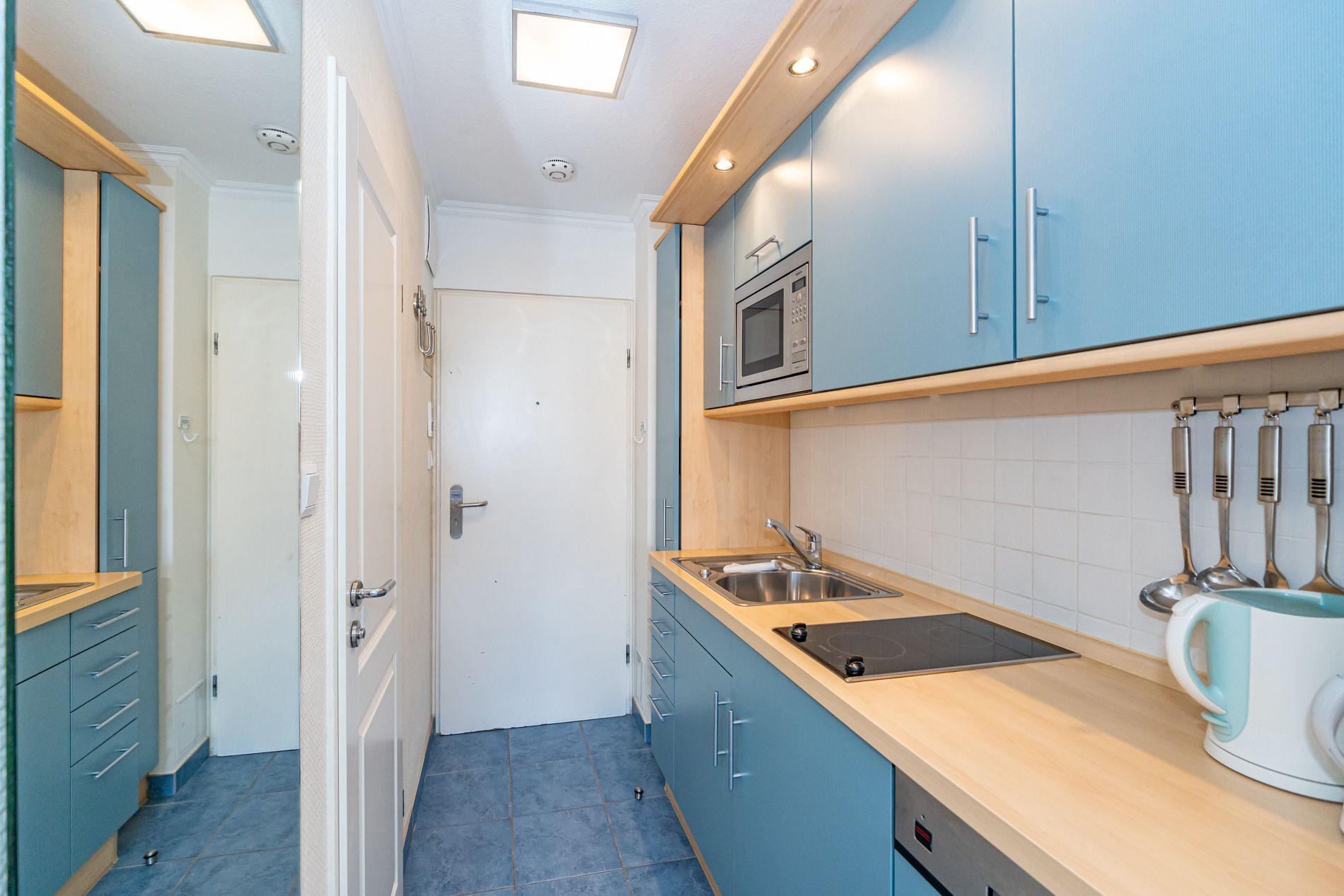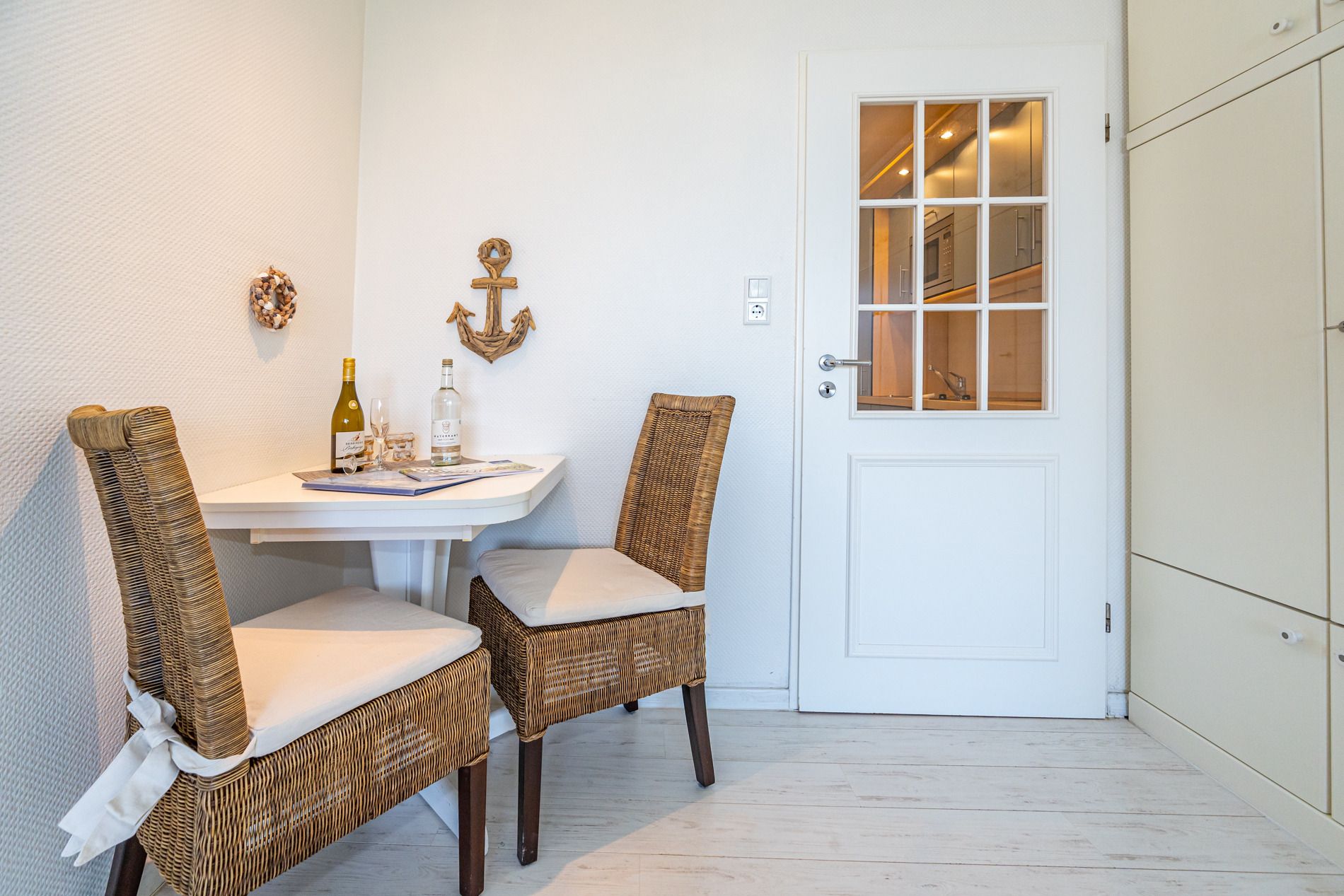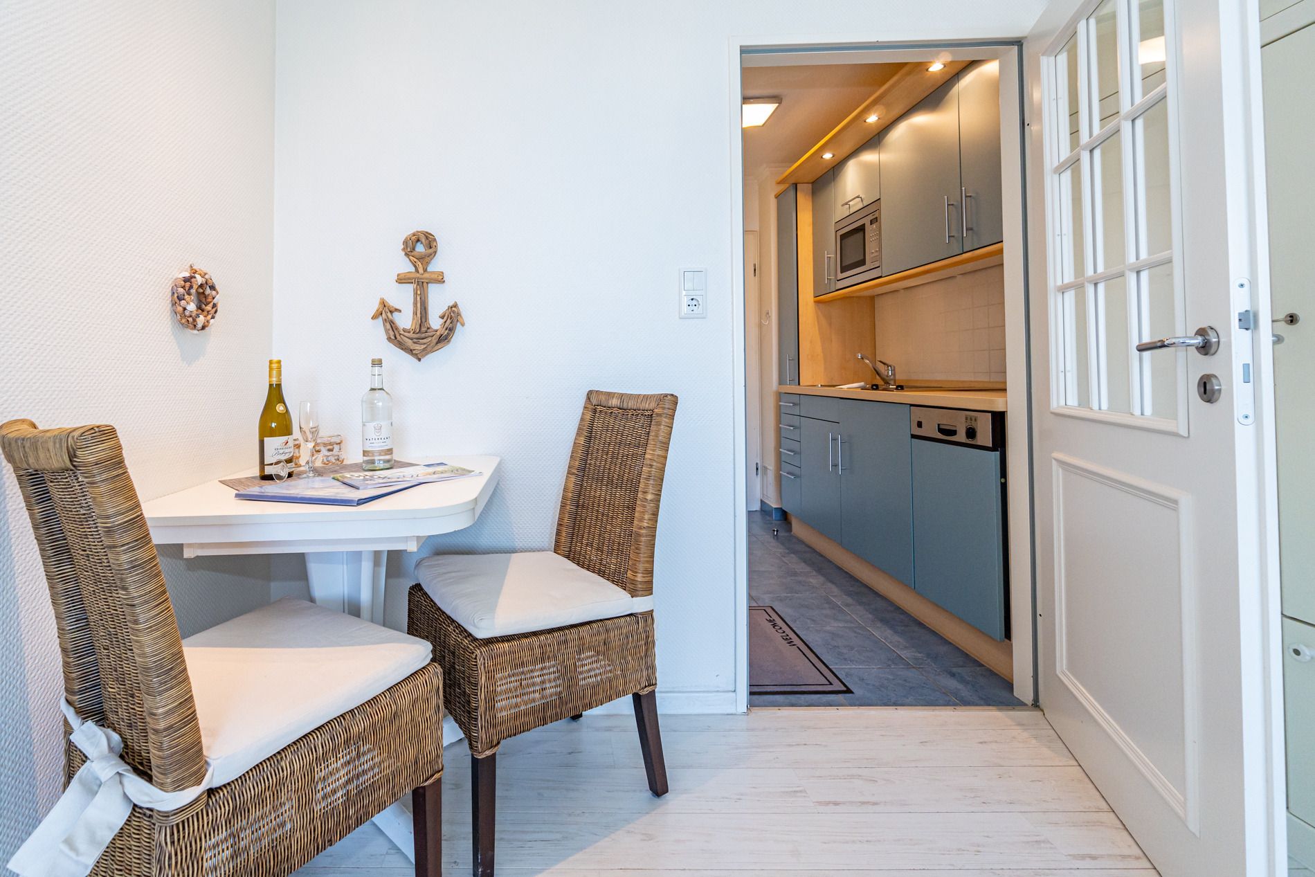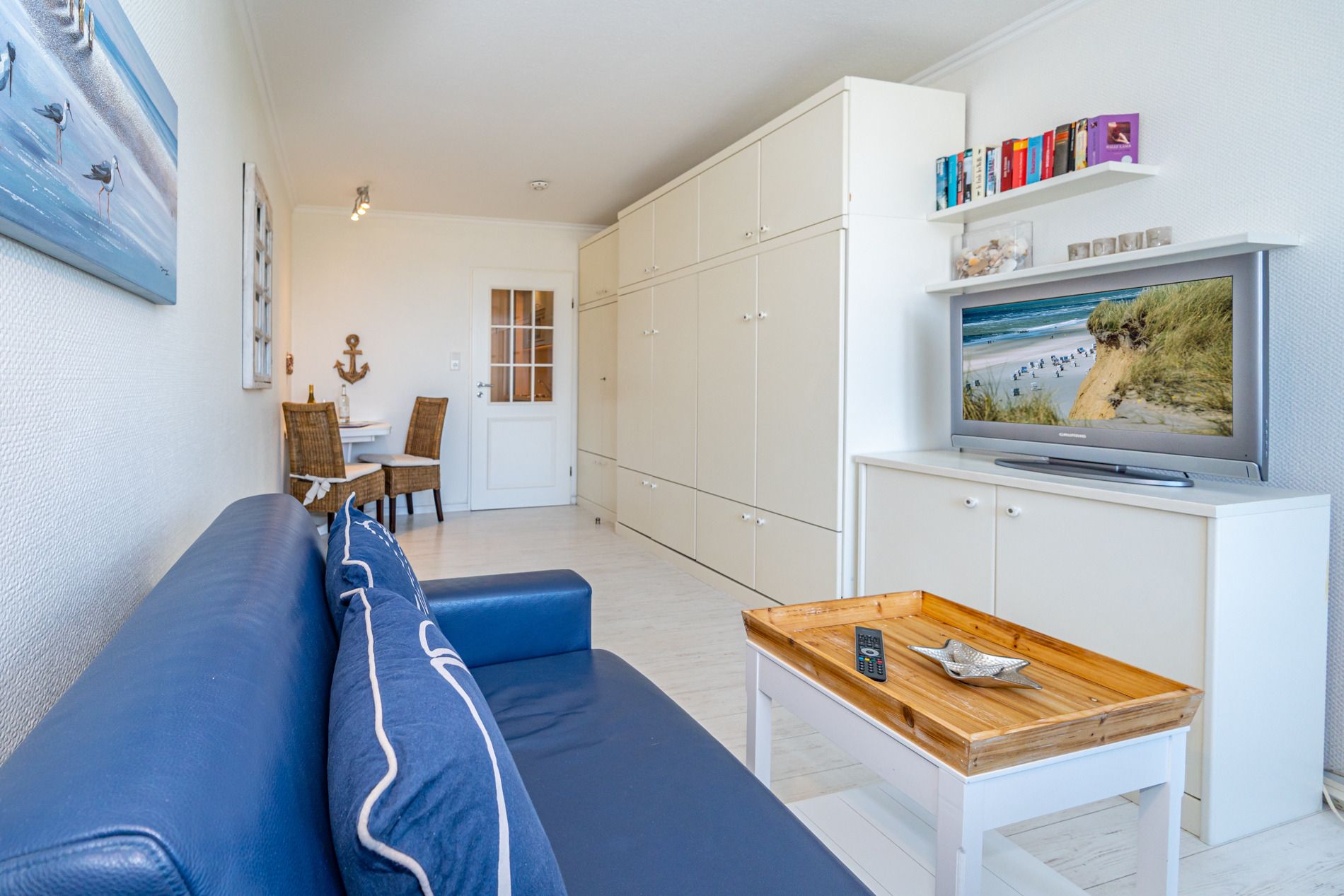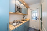 Vom Vorflur mit Garderobe und Küchenzeile gelangt man in das kombinierte Wohn-/Schlafzimmer (mit Austritt zum Balkon) und in das Duschbad/WC. Der Wohn-/Schlafraum mit neuem Designerboden in Holzoptik besteht aus einem hochwertigen 2-Sitzer-Ledersofa und einem Ledersessel von Bielefelder Werkstätten, einem separaten Essplatz (Eckbank), Doppelschrankbett (Betten sind einzeln ausklappbar), Kabel-Flachbild-TV, Radio/CD. Die moderne Küchenzeile hat einen Geschirrspüler, ein Cerankochfeld, eine Mikrowelle mit Grillfunktion und einen Kühlschrank mit 3*-Gefrierfach. Kaffeemaschine, Wasserkocher und Toaster gehören zur Grundausstattung.