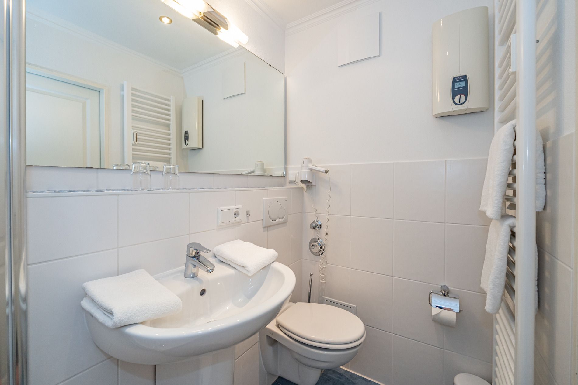 Im Bad befinden sich eine Dusche, ein WC, ein Waschtisch und ein Handtuchtrockner.