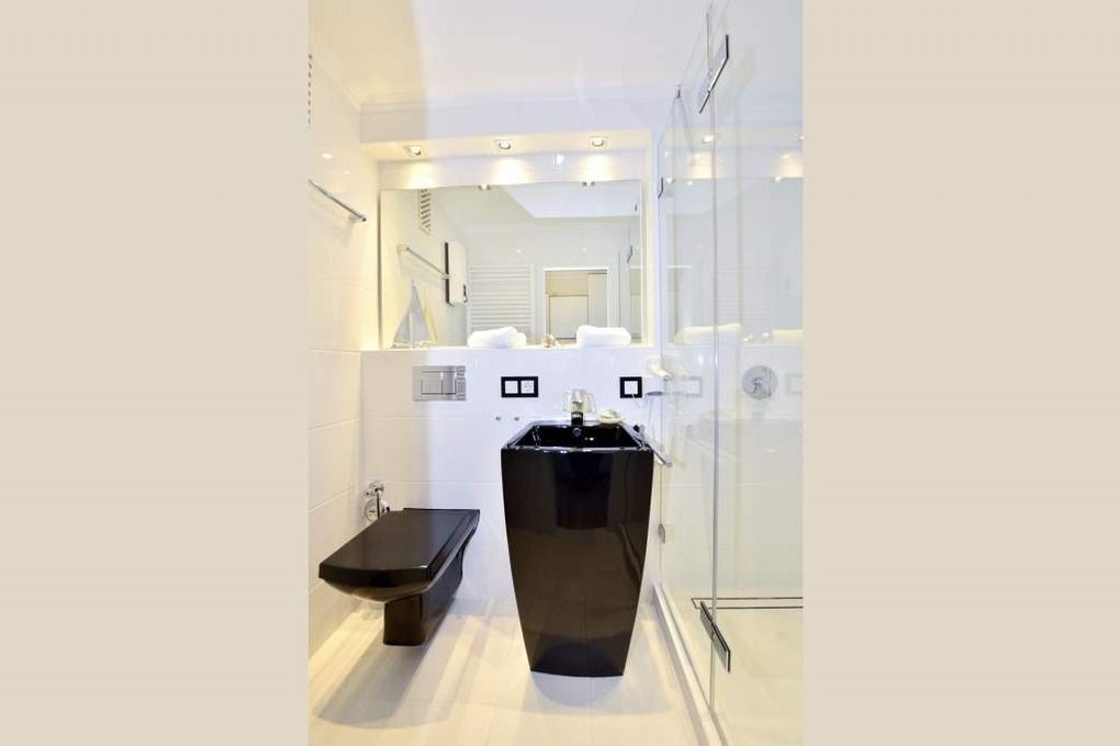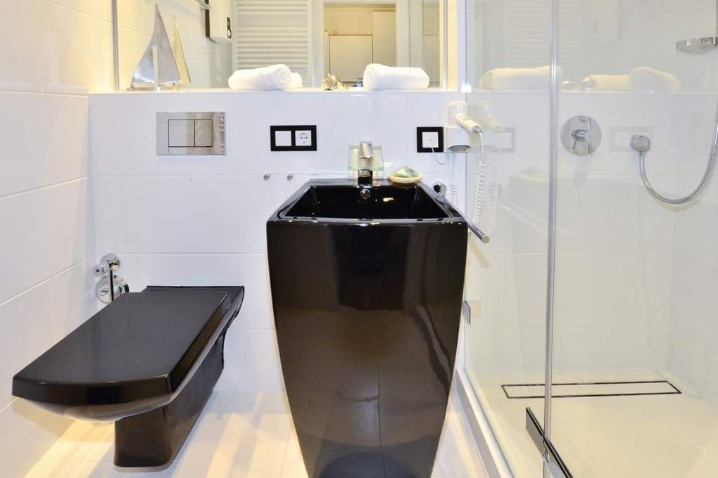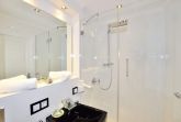 Im neuen, trendigen Bad befinden sich eine Dusche mit Regenduschkopf, ein WC und ein Säulenwaschtisch.