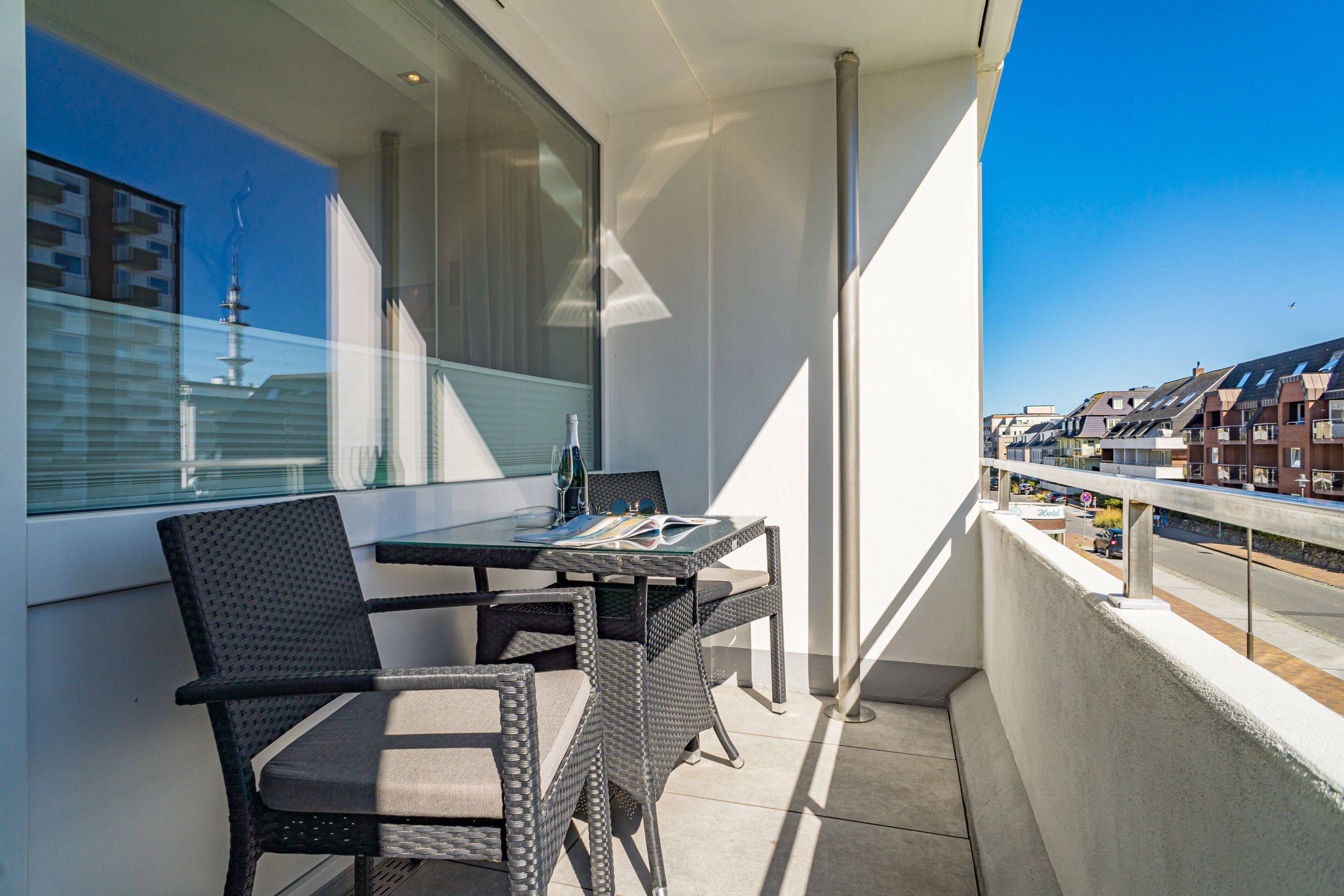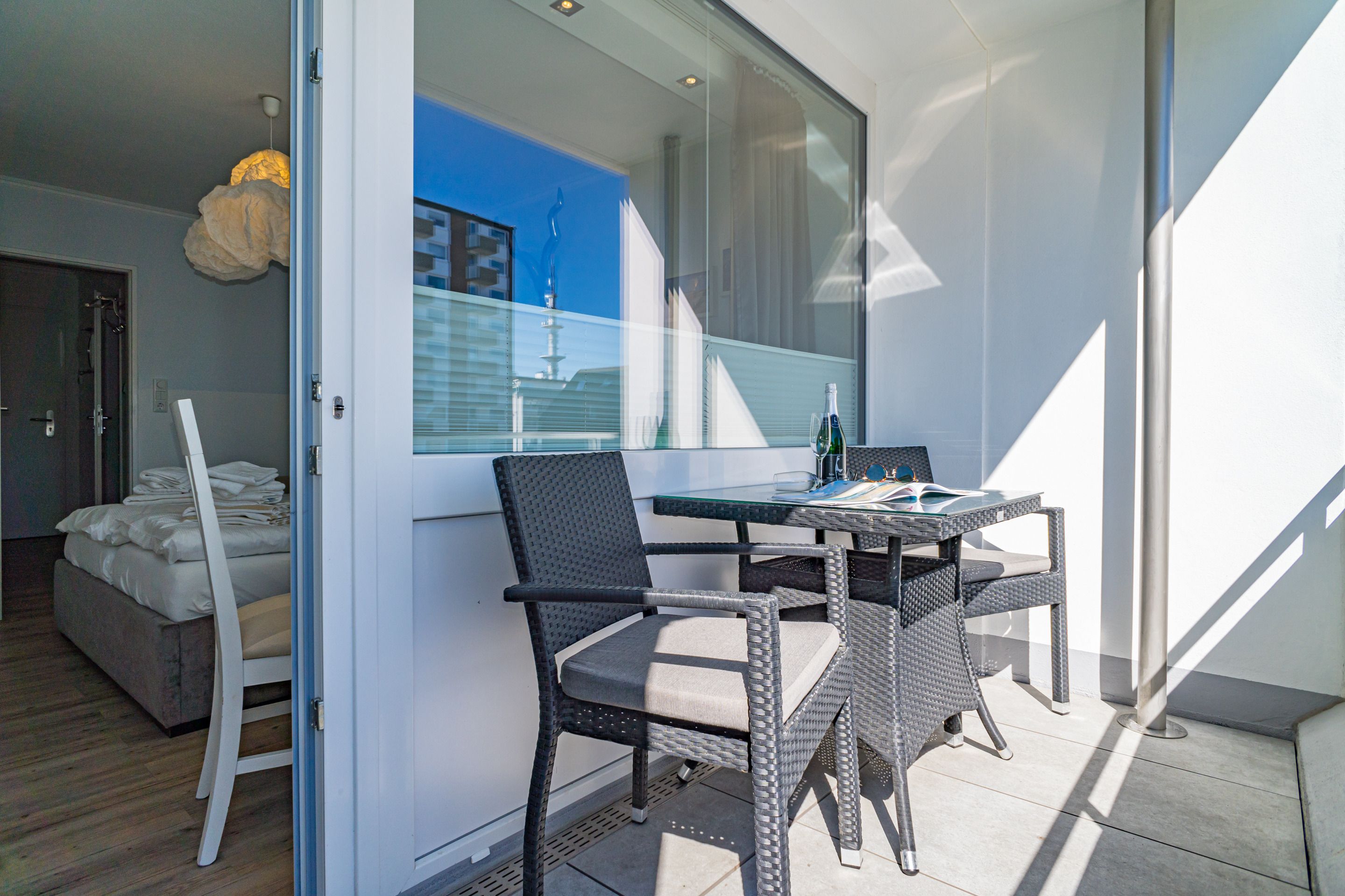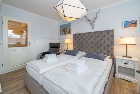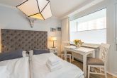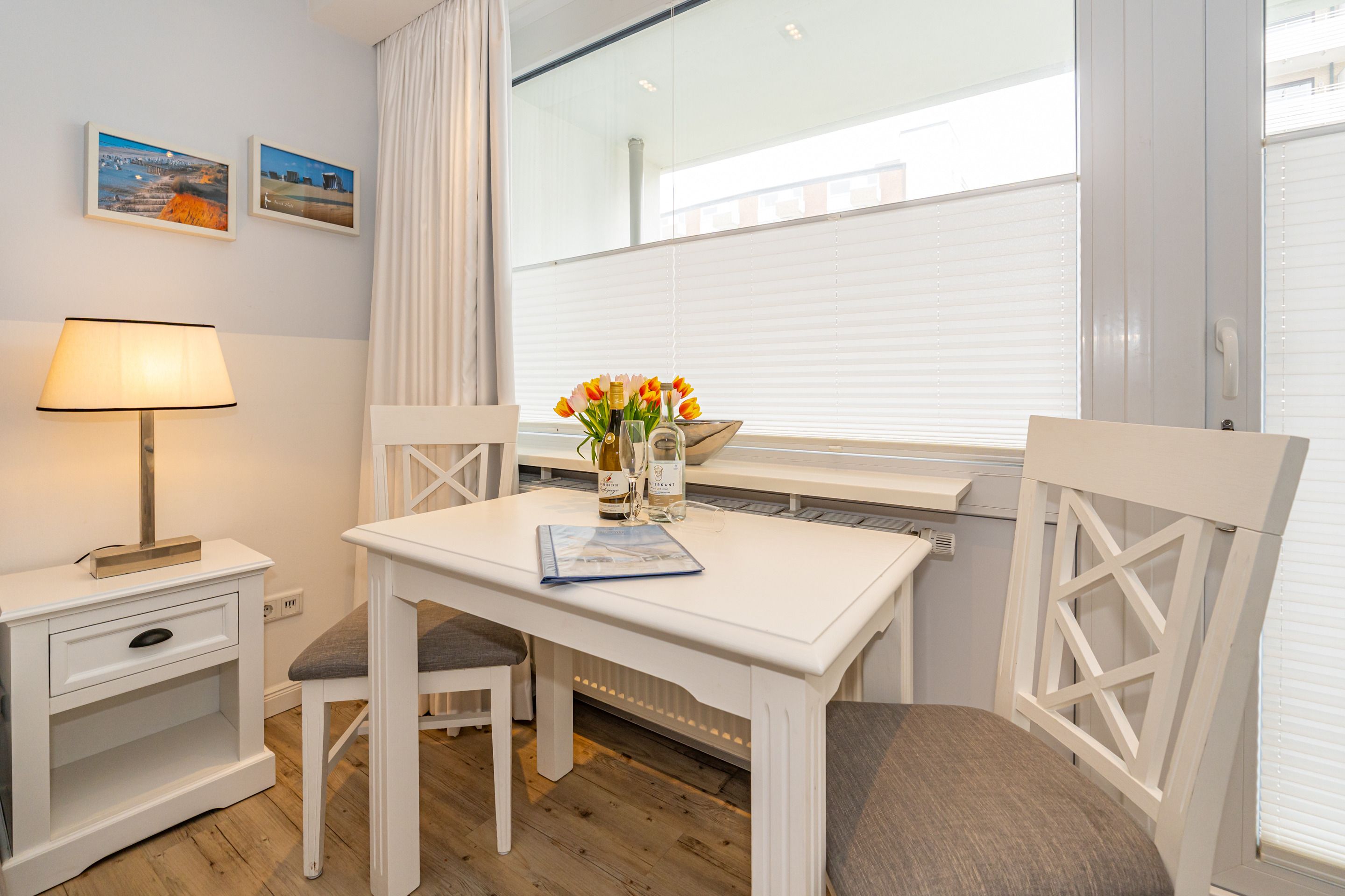 Im Strandhausstil gestaltete und renovierte 1-Zimmer-Nichtraucher-Ferienwohnung, ca. 23 qm in der 1. Etage zur Landseite mit Ostloggia (Morgensonne, mit Balkonmöbeln und Auflagen) für max. 2 Personen.