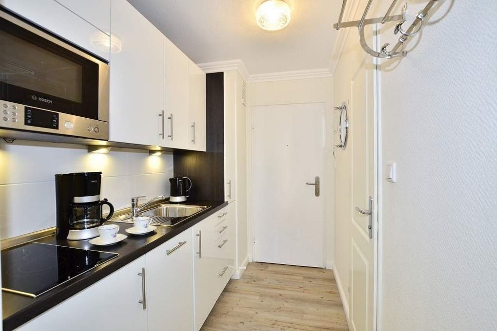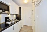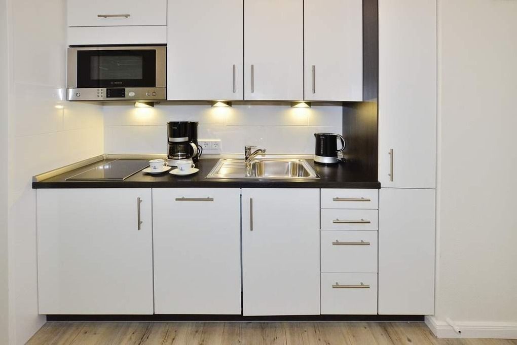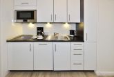Die neue Küchenzeile hat ein Ceranfeld mit 2 Kochfeldern, eine Mikrowelle, einen Geschirrspüler und einen Kühlschrank mit 3*-Gefrierfach. Kaffeemaschine, Wasserkocher und Toaster gehören zur Grundausstattung.