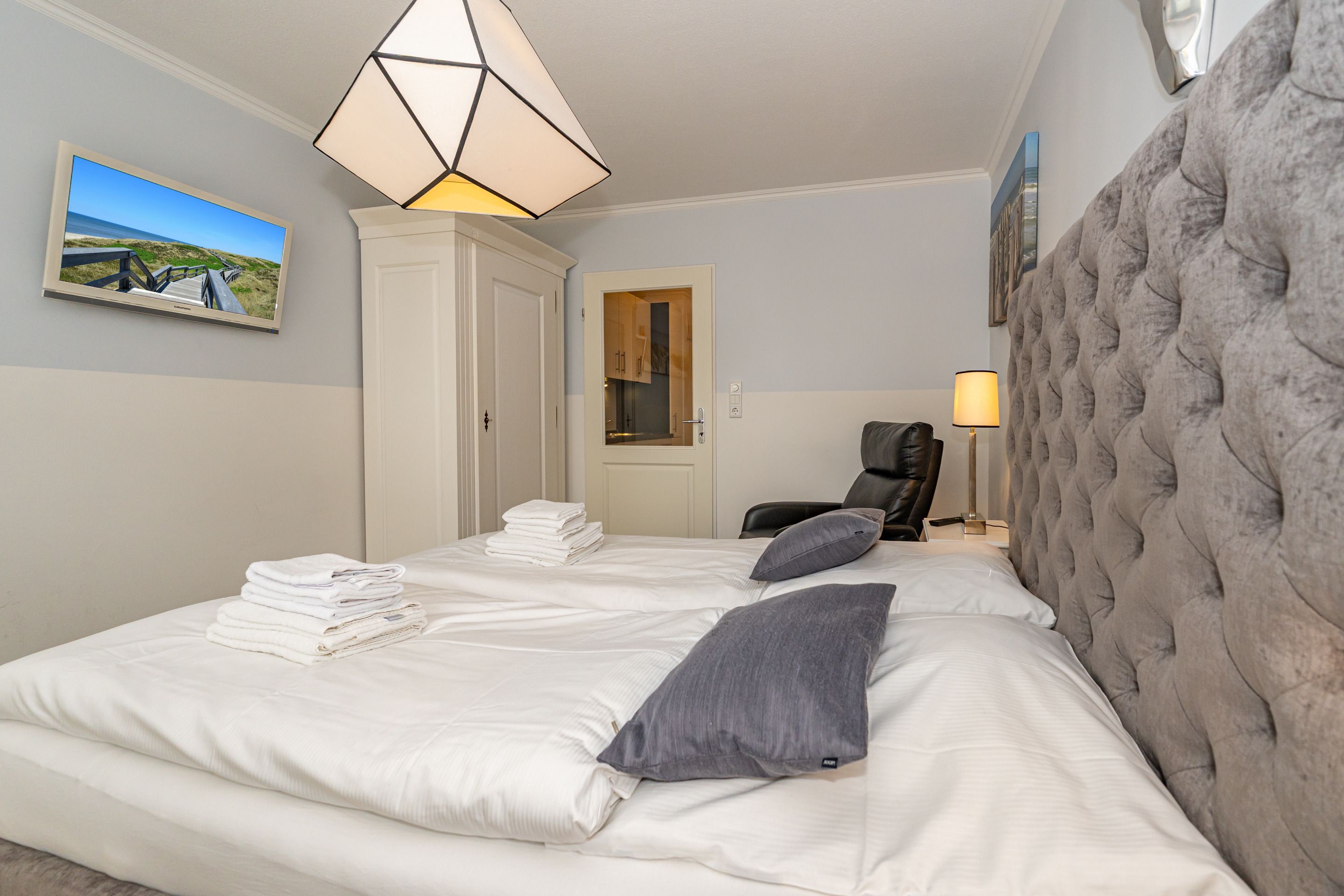 Der gemütliche Wohn-/Schlafraum mit neuem Designerboden in Holzoptik besteht aus einem Sessel, einem Essplatz, einem neuen Doppelbett (Liegefläche 1,60 x 2,00 m, zwei Einzelmatratzen), einem Kabel-Flachbild-TV und Radio-CD.