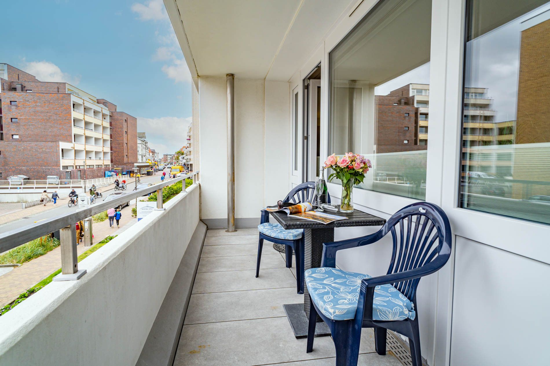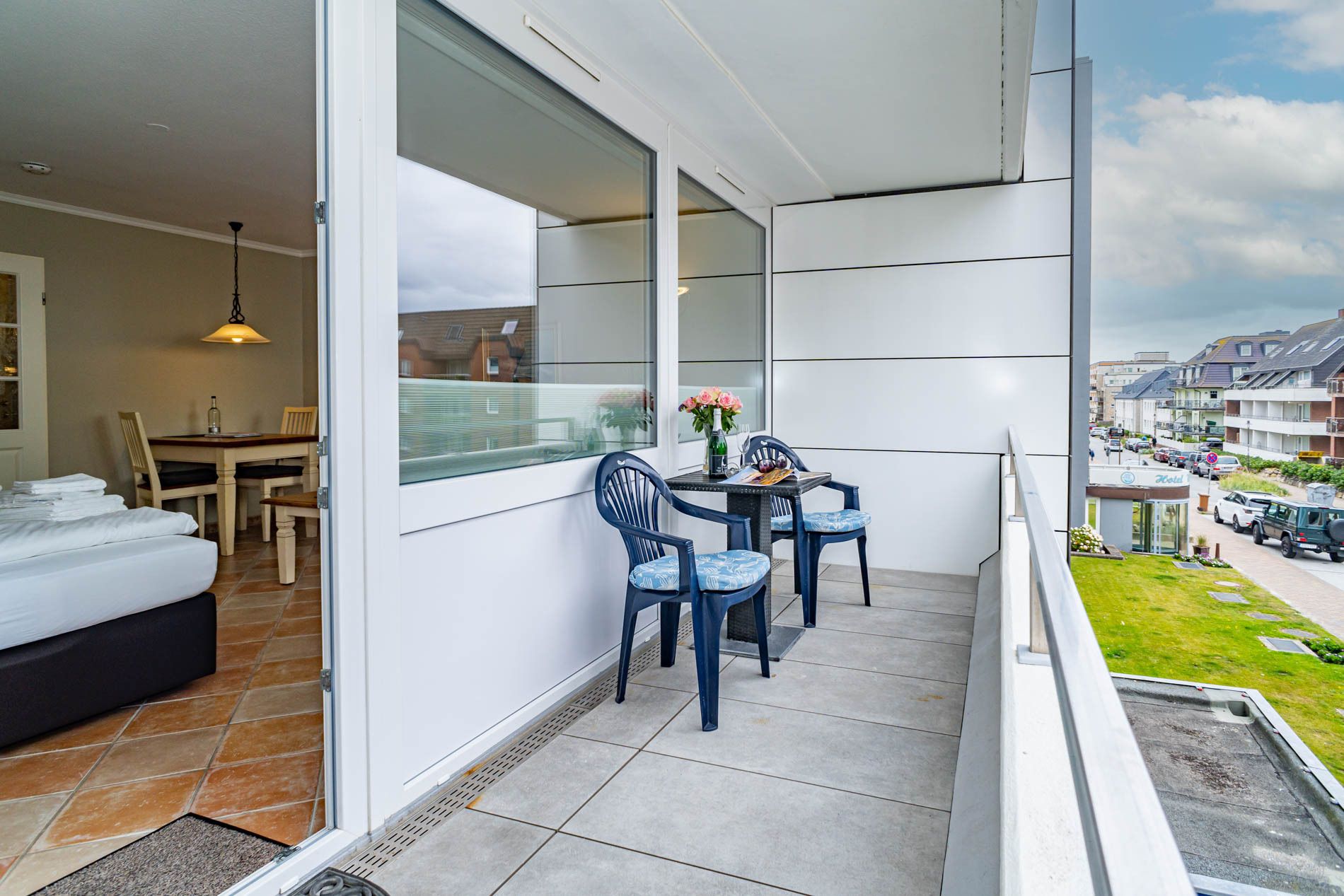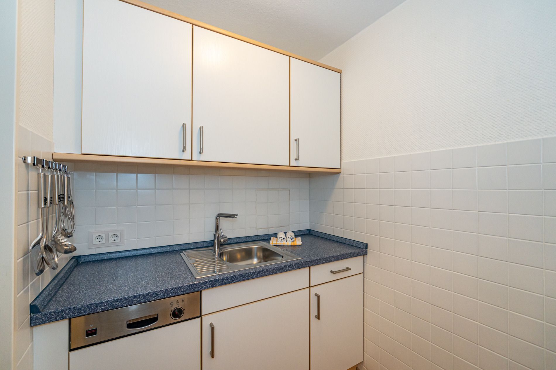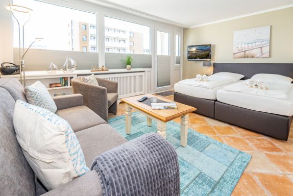 Komfortable, komplett mit Fliesen ausgelegte 1-Zimmer-Nichtraucher-Ferienwohnung (ca. 38 qm) in der 1. Etage zur Landseite mit Ostloggia (Morgensonne, Balkonmöbel vorhanden) für max. 2 Personen.